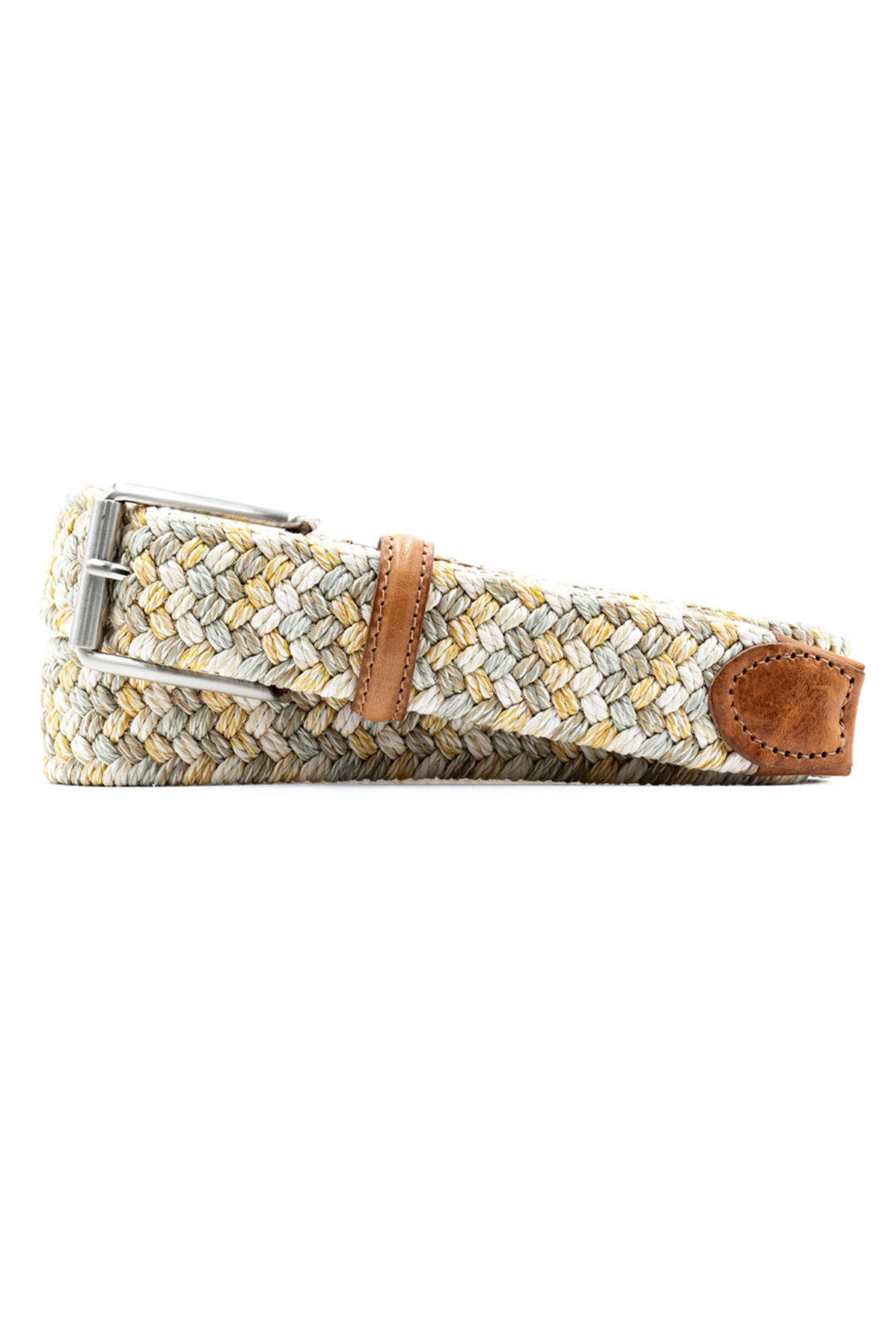 Martin Dingman Como Braided Belt in Coconut. Tapered tip. Single loop keeper. Brushed nickel finish solid brass roller hardware. Adjustable. Tonal stitching. Waxy bridle leather trim. 1 3/8 wide braided Italian linen and elastic strap. Handcrafted in America.