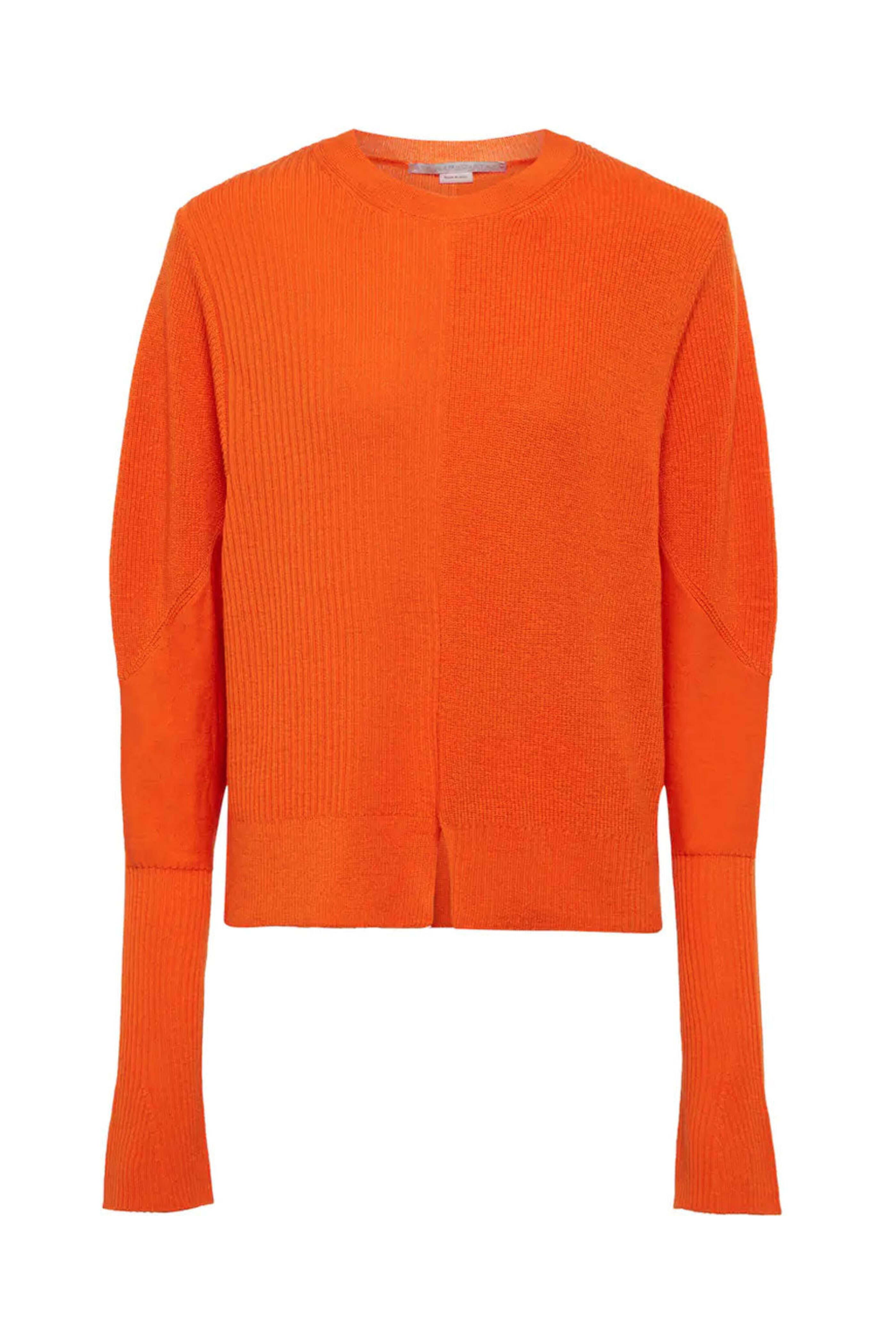 Stella McCartney Orange Stitch Mix Jumper. Crew neck. Long sleeves; extended cuffs. Ribbed panels throughout. Center front hem slit. Relaxed fit. Made in Italy. 100% virgin wool.