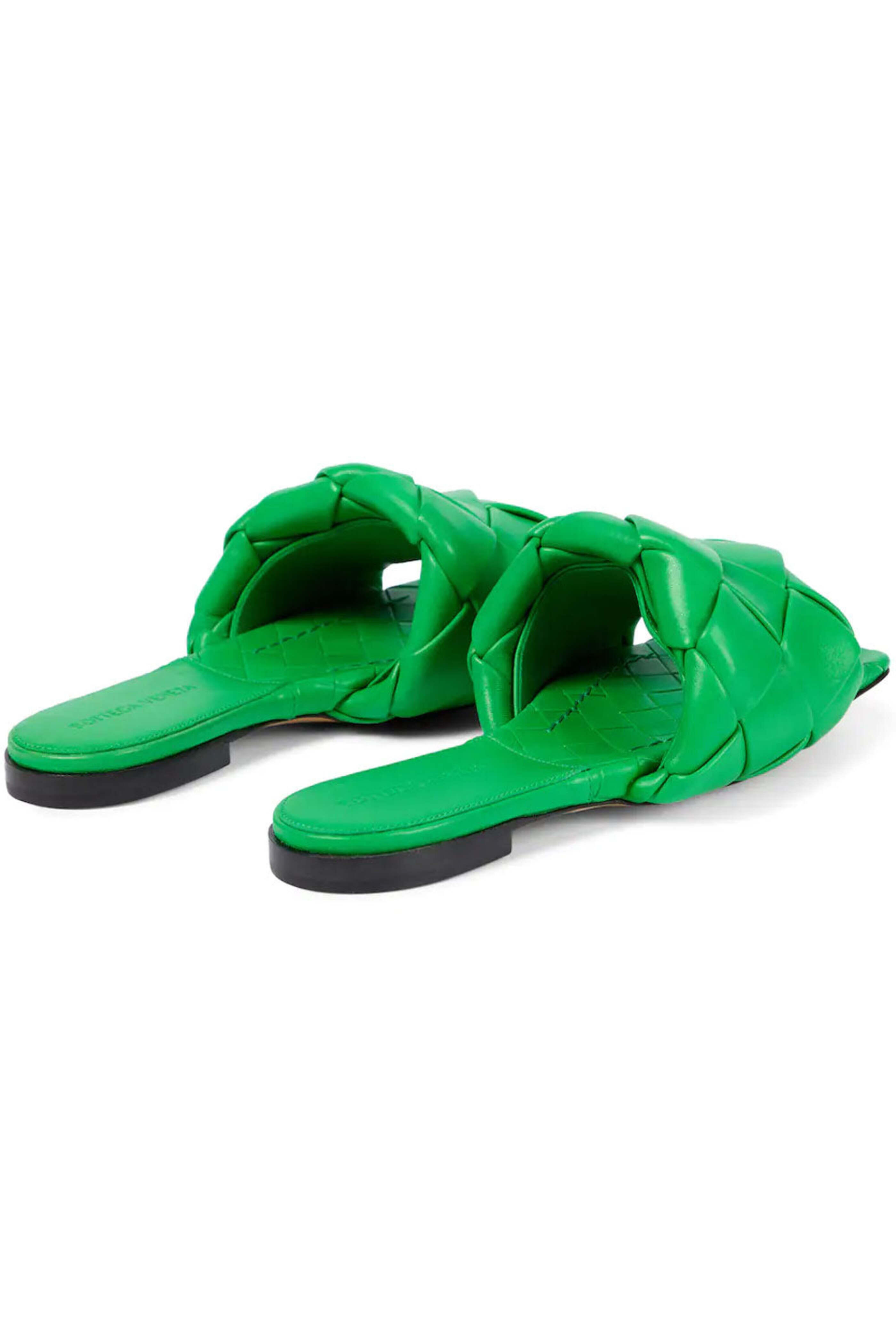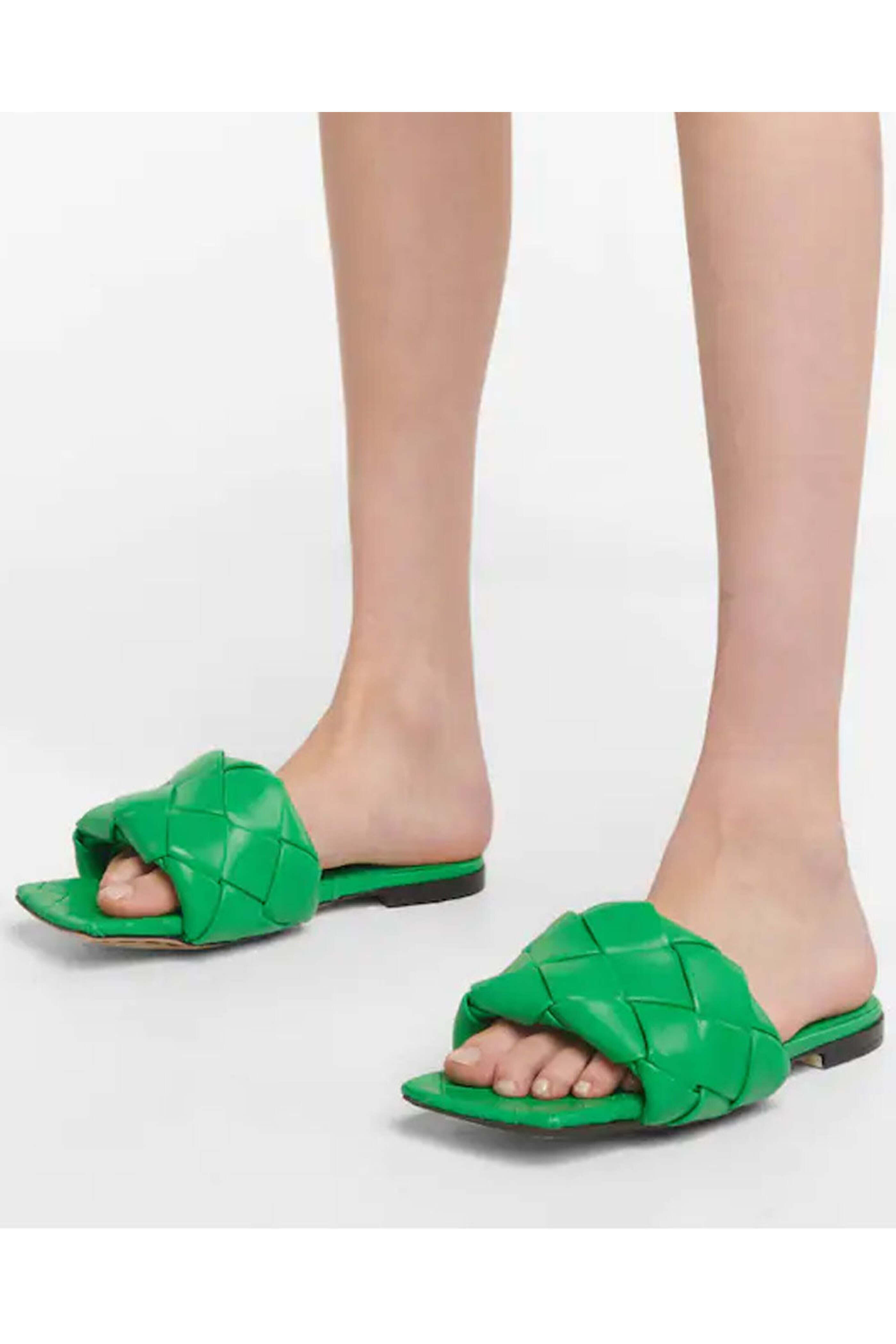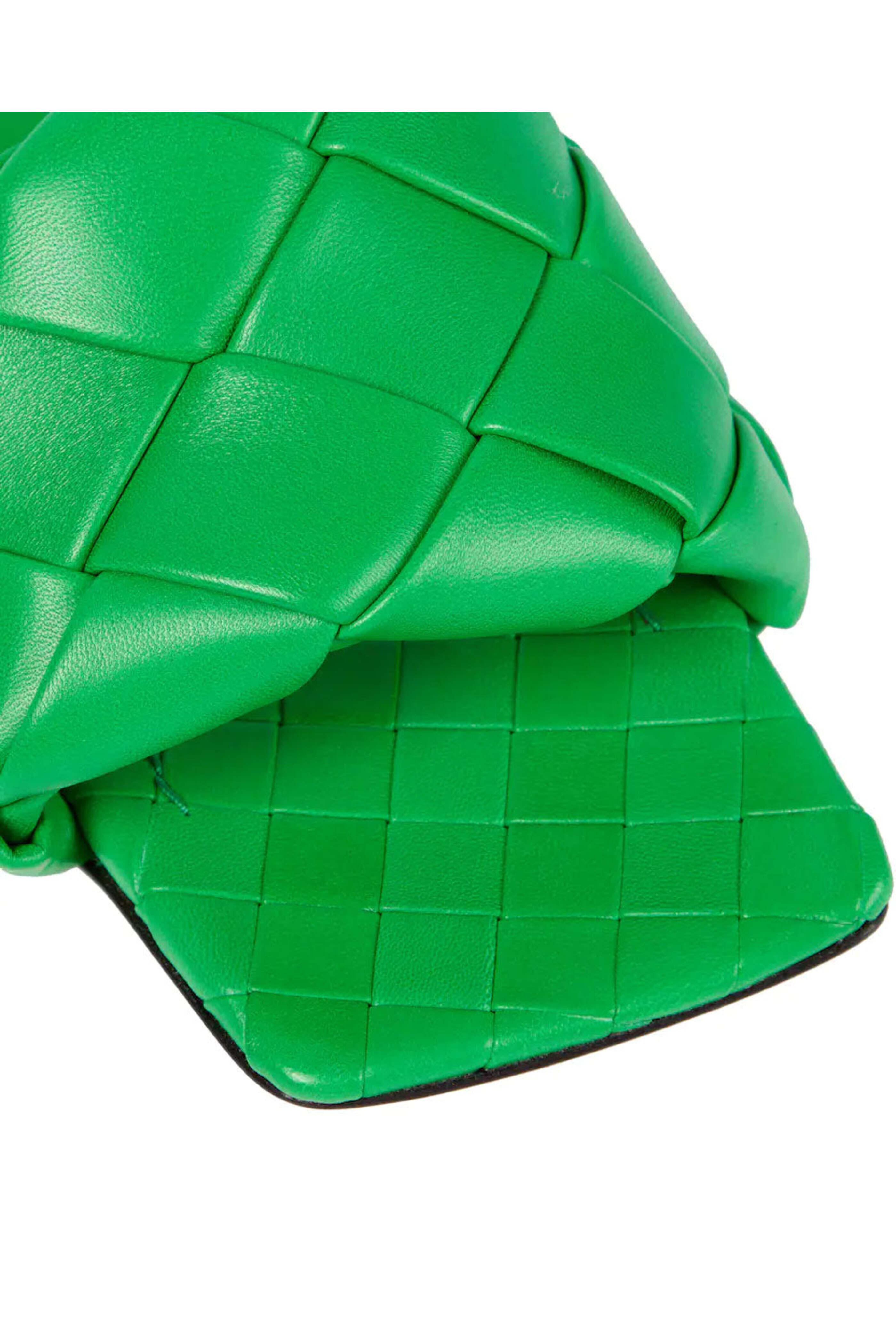 Bottega Veneta Lido Flat Sandal in Grass. Open square toe. Woven leather strap. Slip on. Leather upper and lining. Leather and rubber sole. Made in Italy.