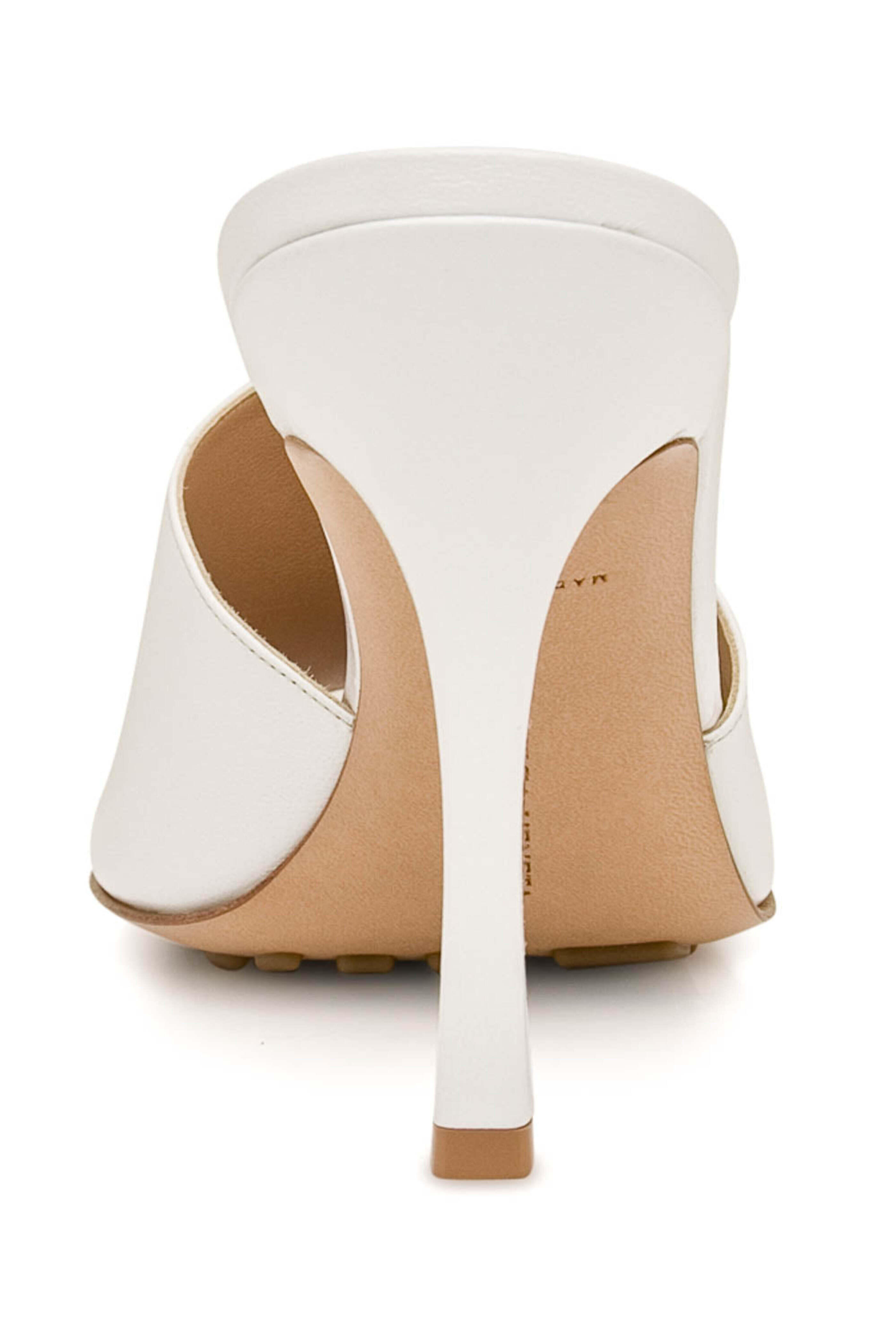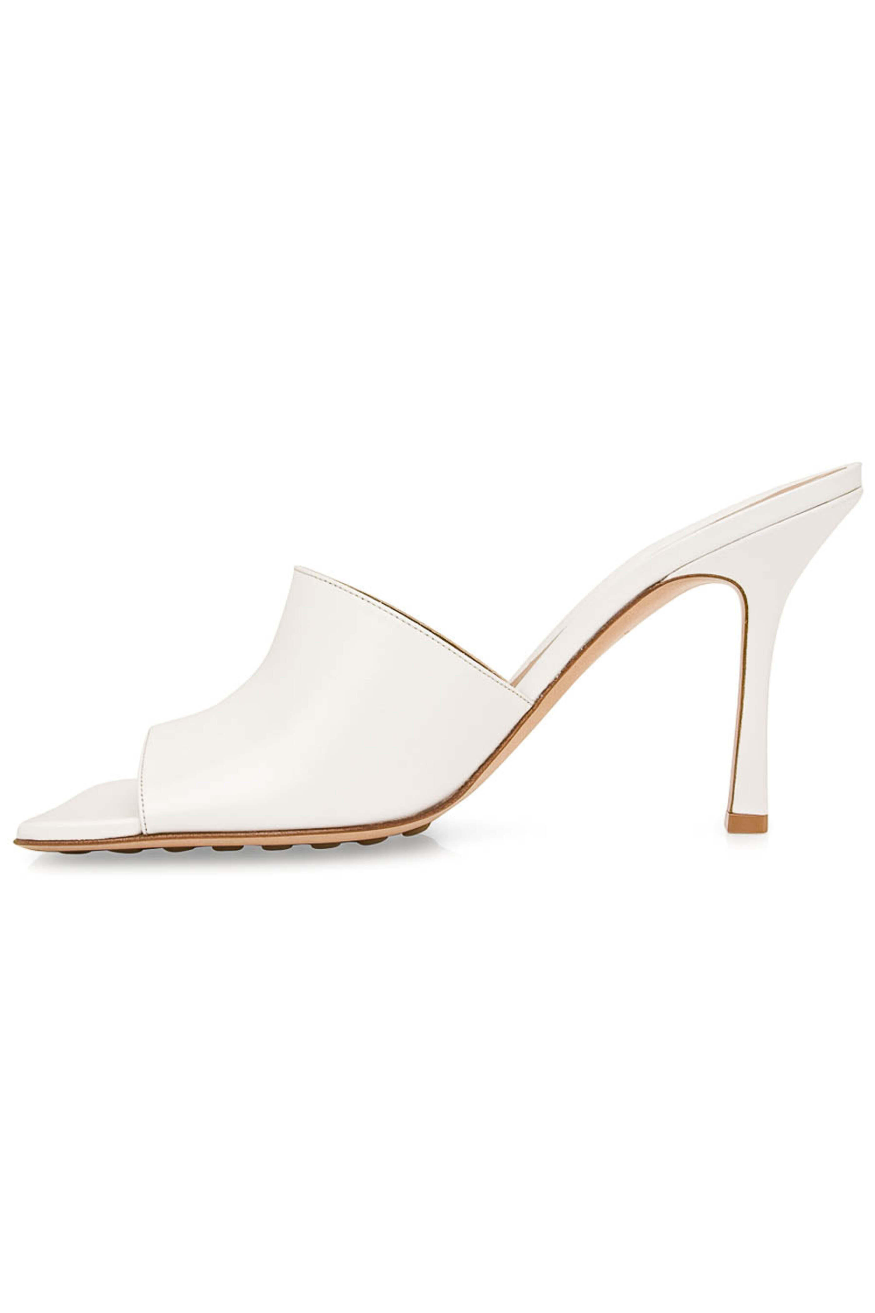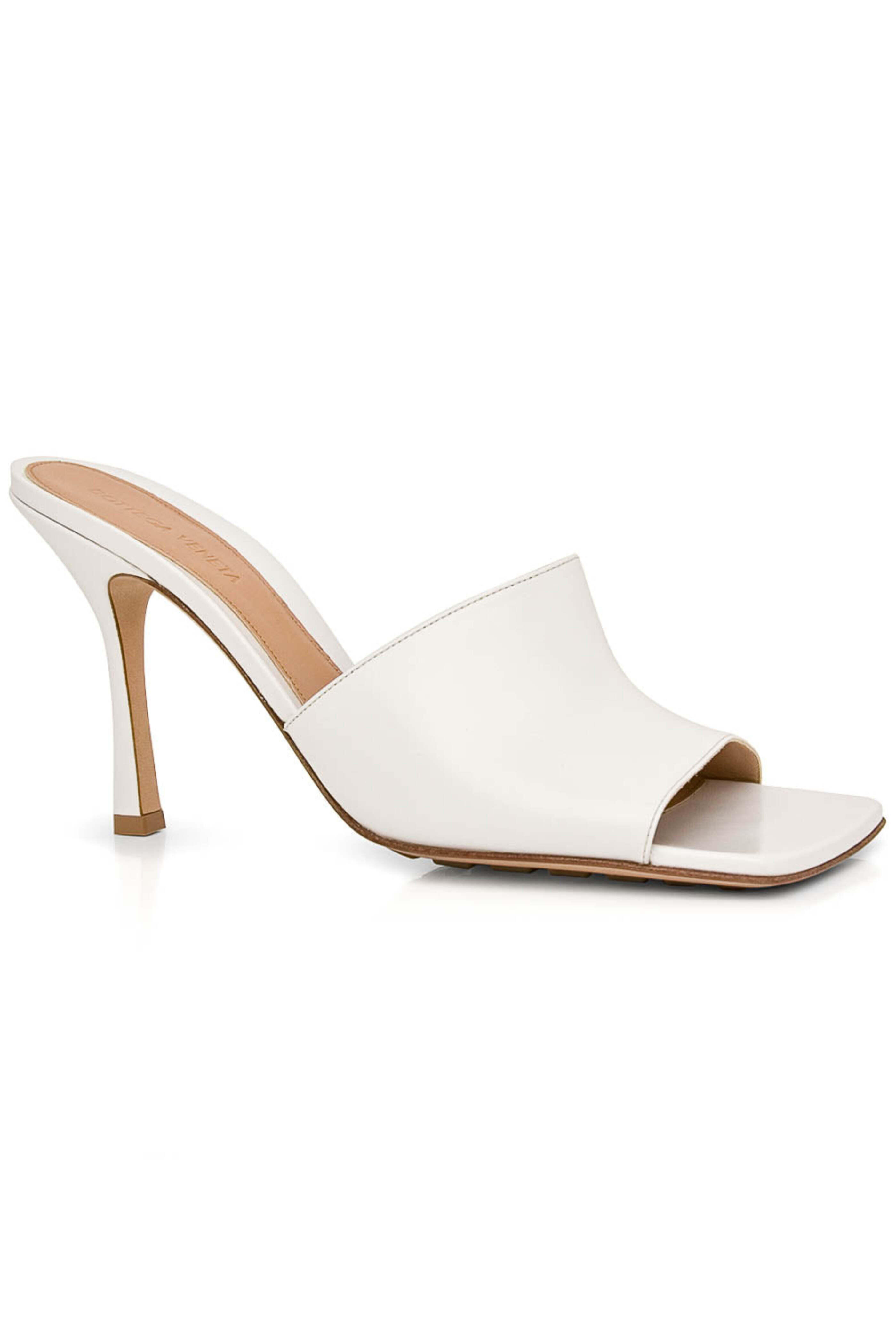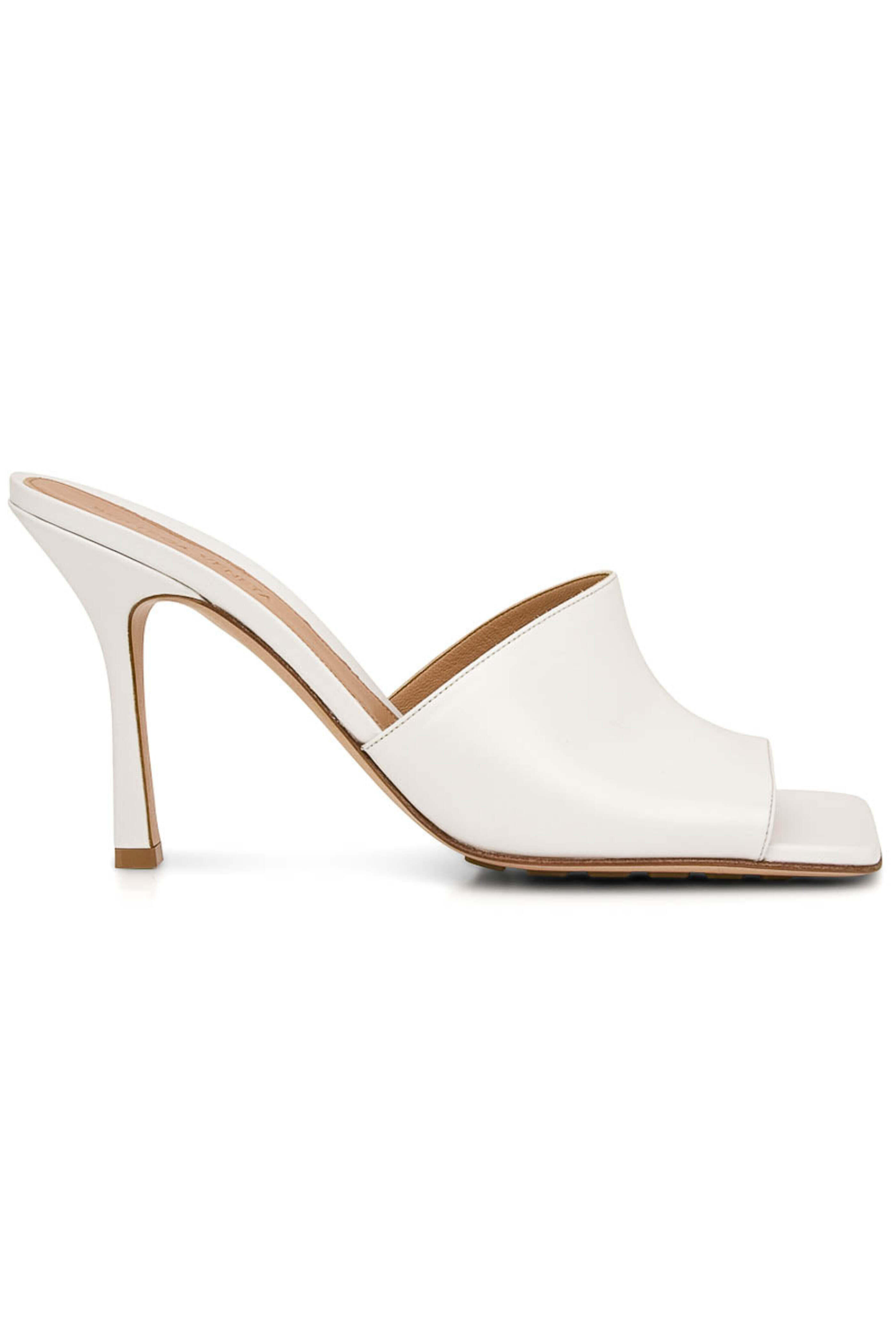 - Bottega Veneta Stretch Sandal in Optic White Leather upper Squared open toe Tonal stitching Leather lining and insole Padded footbed Rubber injected leather sole 4 heel Made in Italy