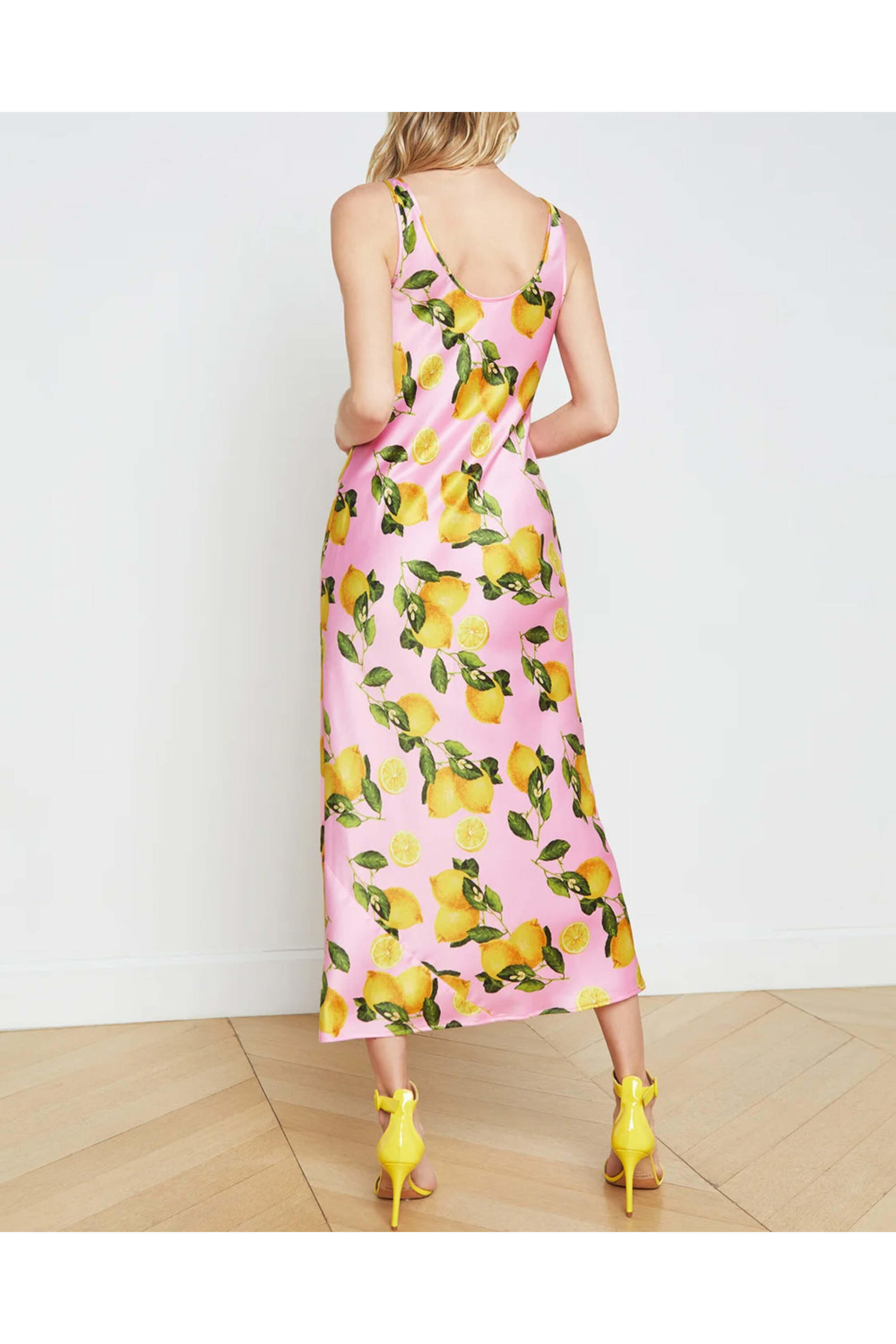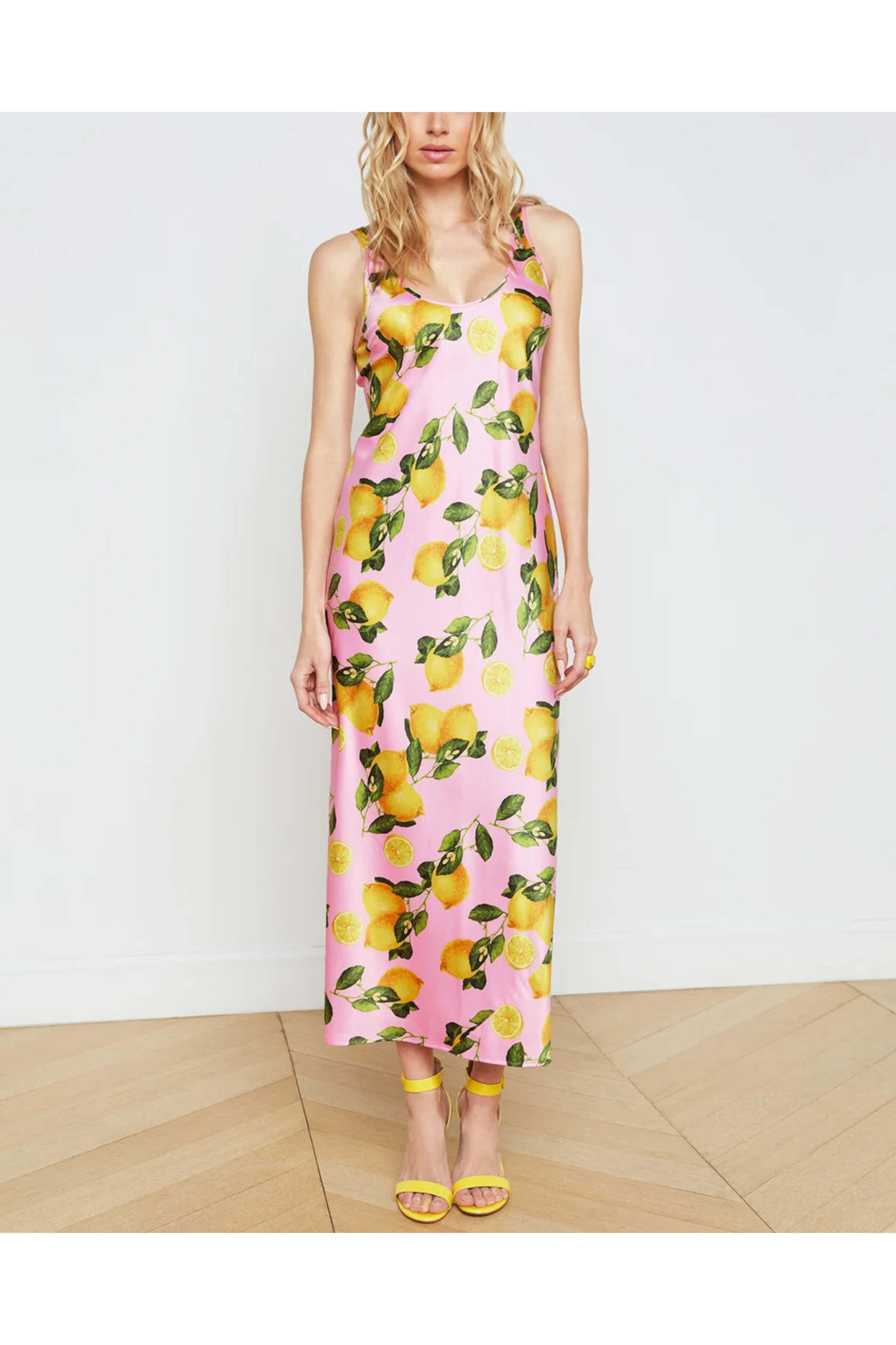 LAgence Cotton Candy Lemon Print Akiya Tank Dress. Scoop neck. Scoop back. Slip silhouette. Relaxed fit. Midi length. 100% polyester.