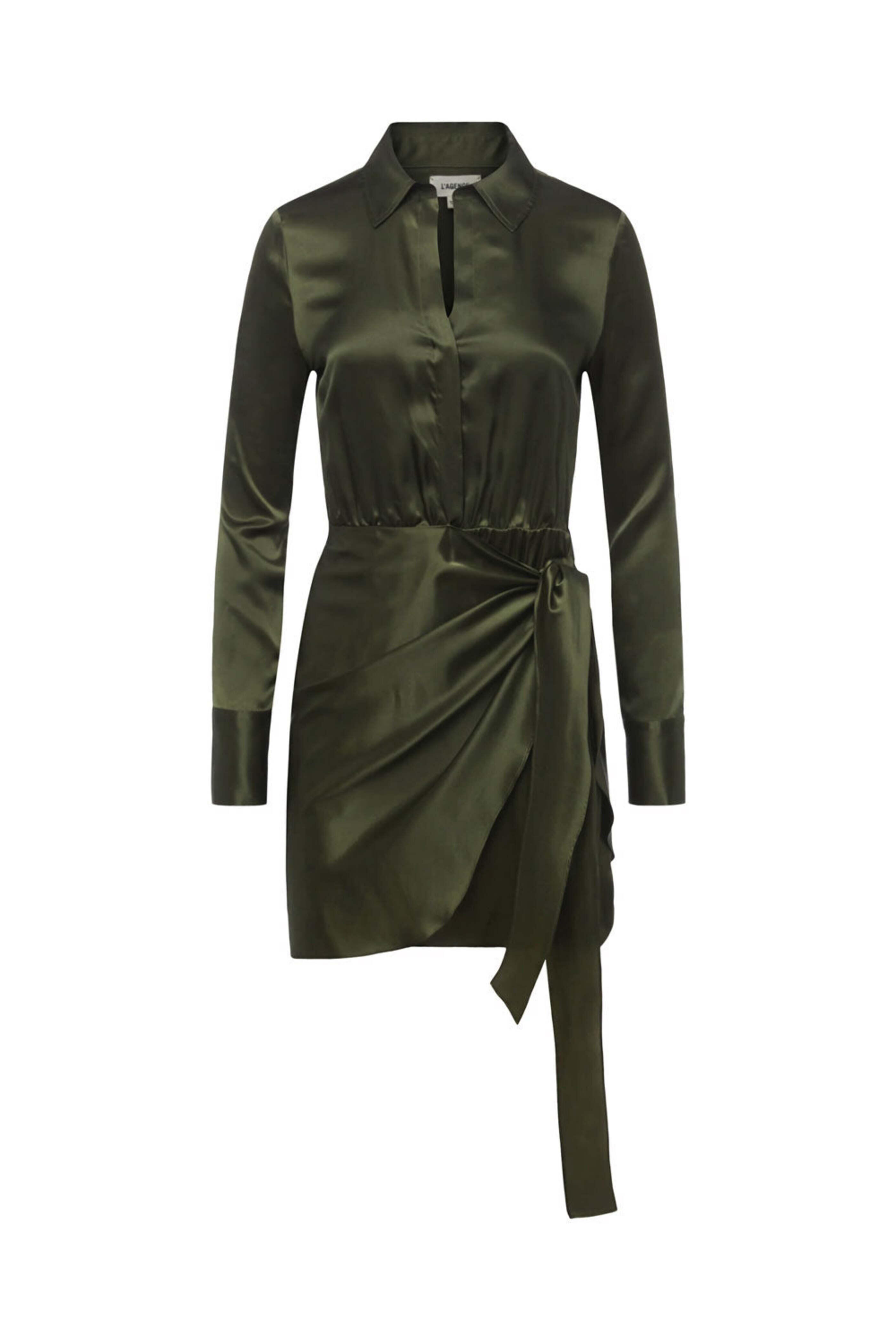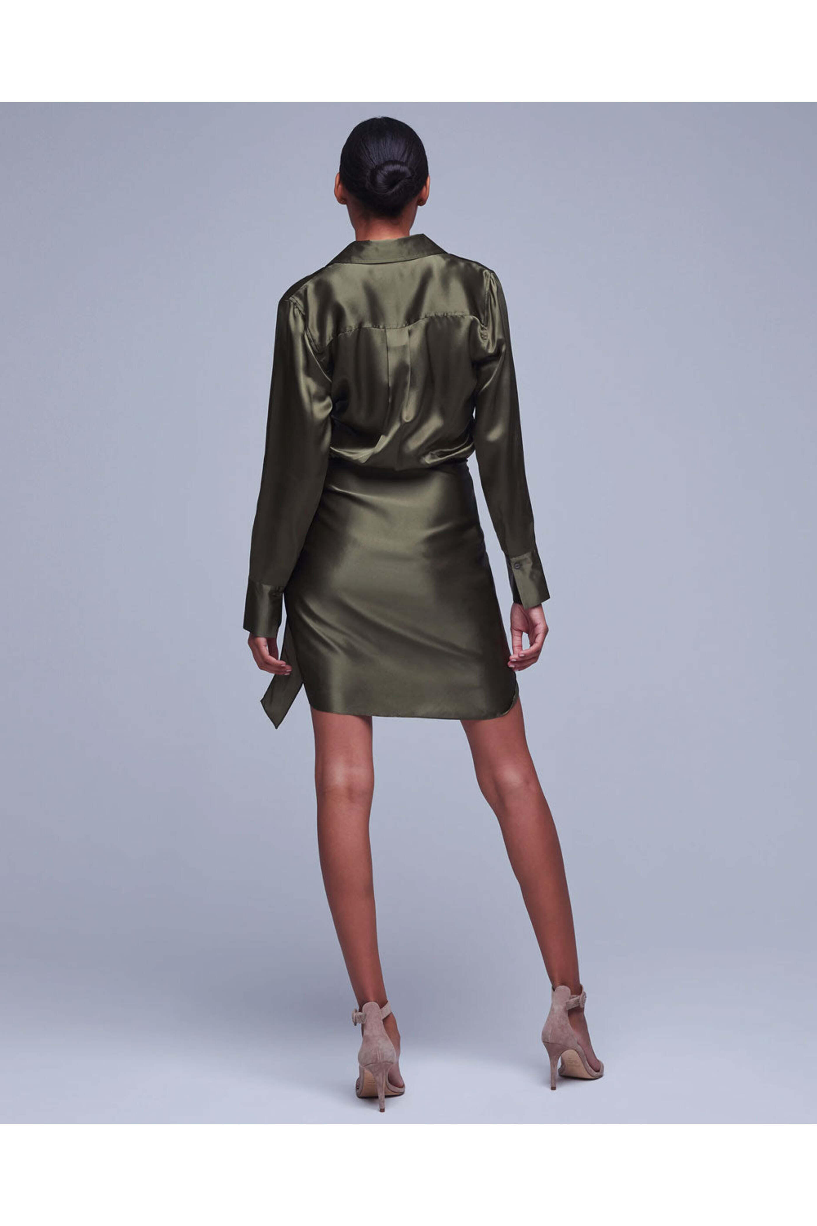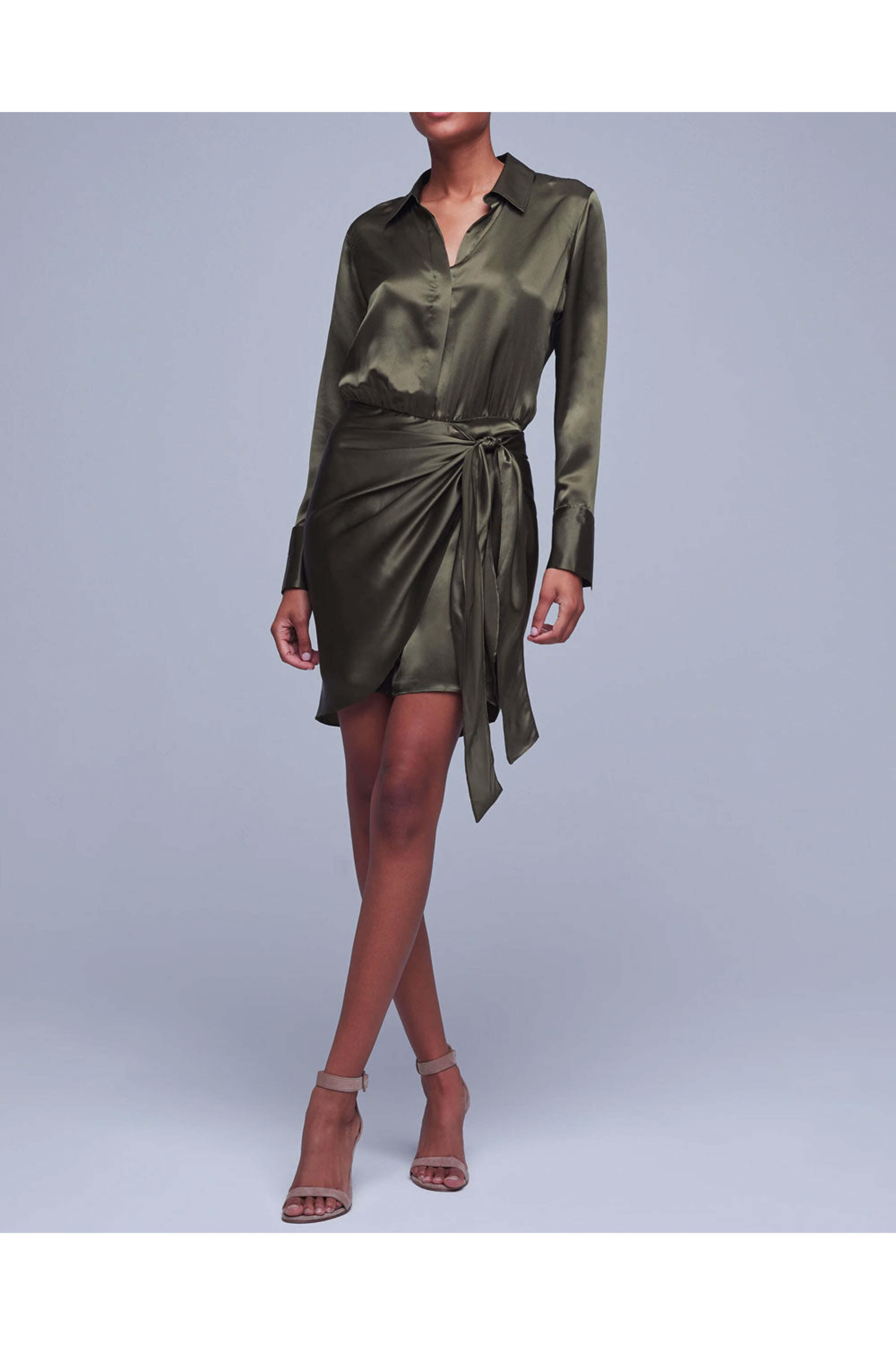 LAgence Winter Moss Atlas Wrap Front Dress. Sharp collar. Long sleeves; button cuffs. Concealed half button up front placket. Concealed side zip closure. Elasticized waist; self tie. Mini length. Wrap effect silhouette. Slim fit. 100% Silk.