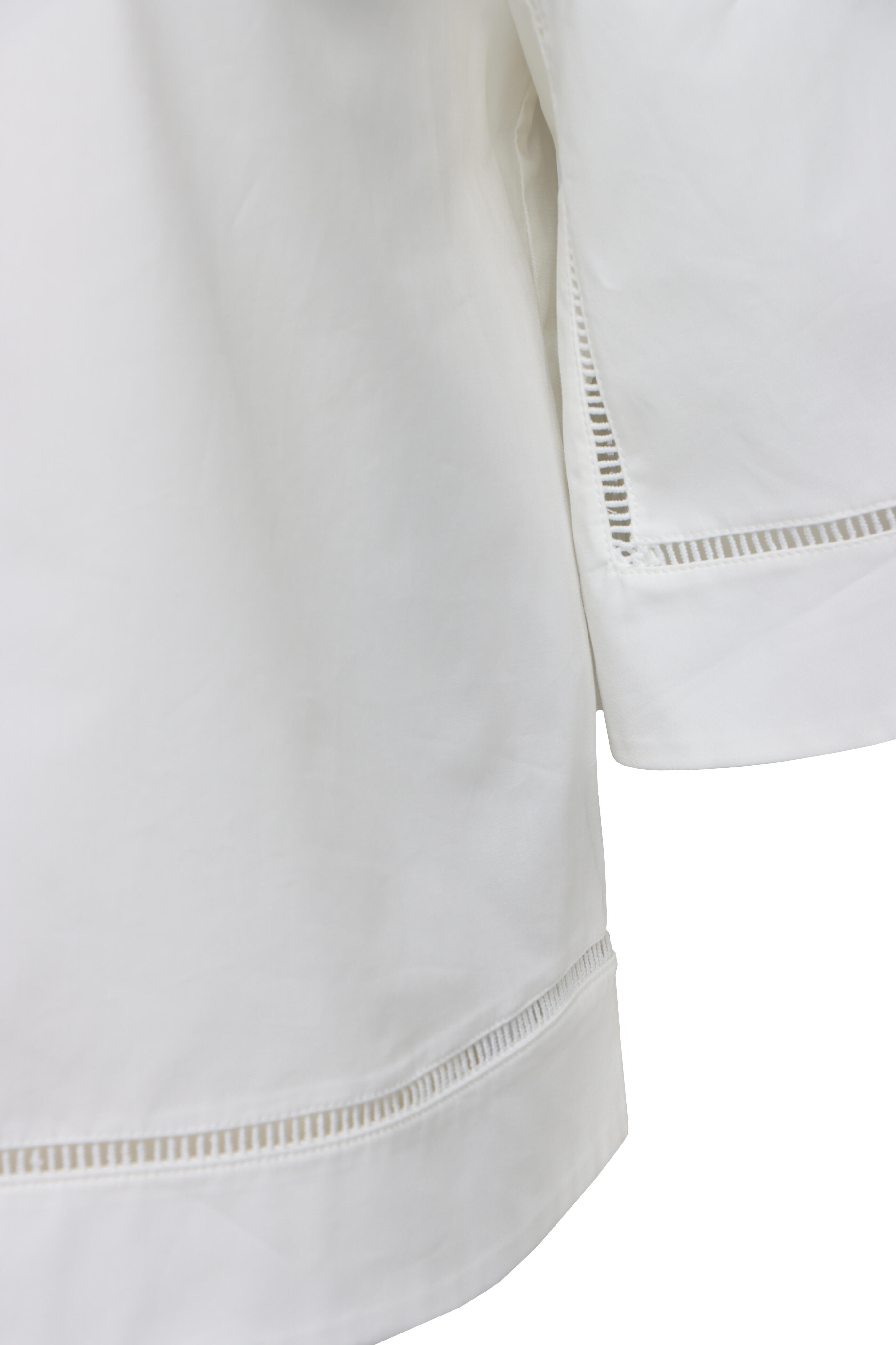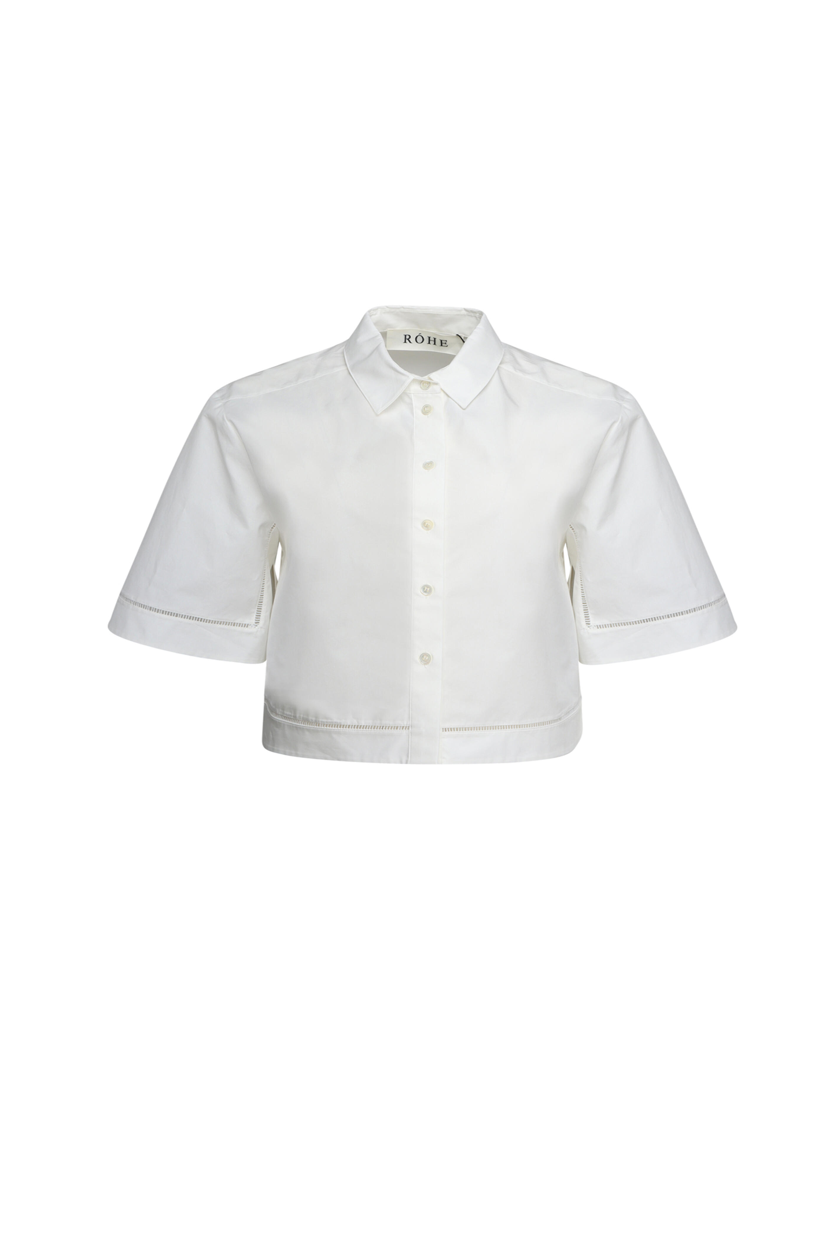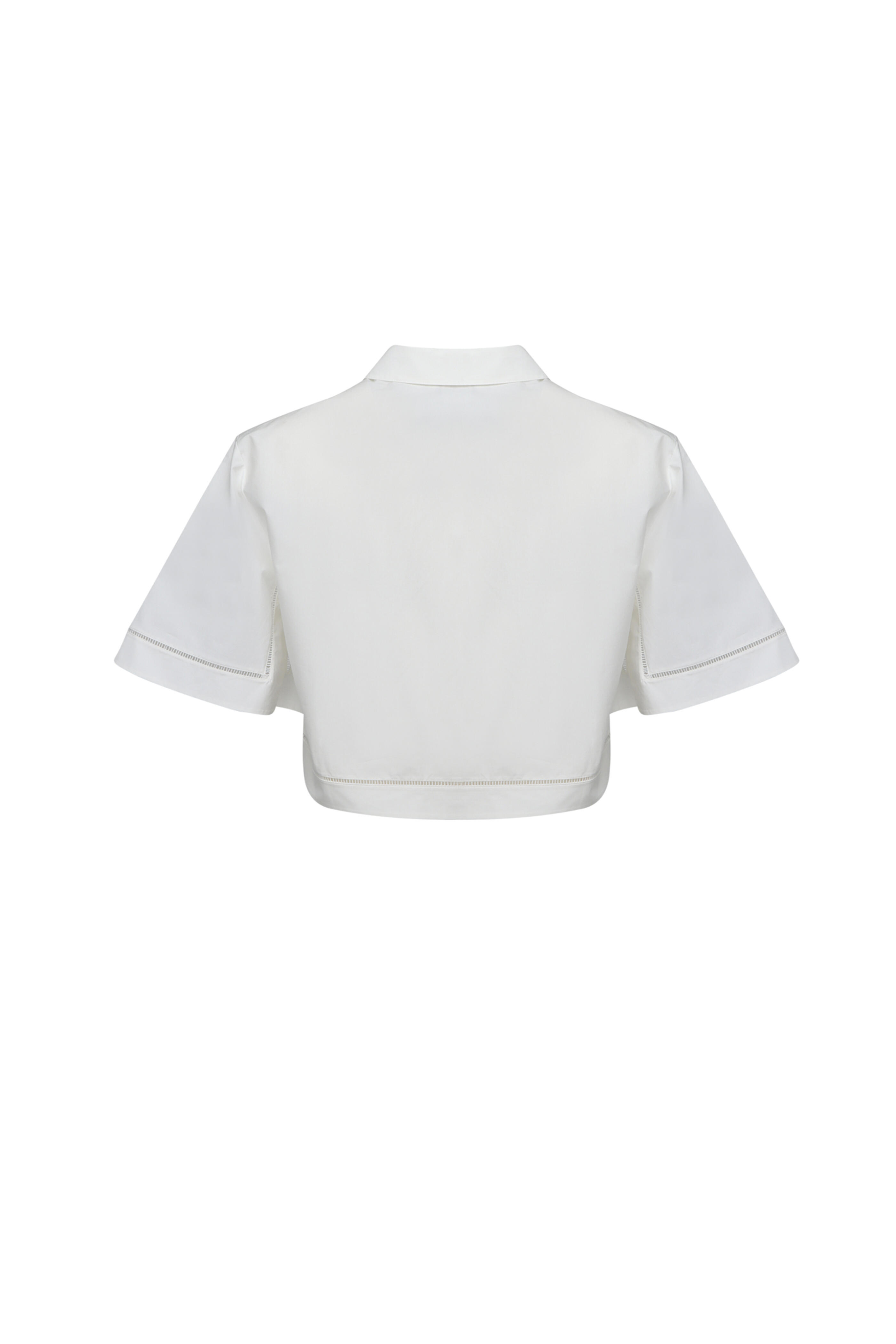 Spread collar. Elbow length wide sleeves. Button down front closure. Straight hem. Embroidered trim detail. Imported. Boxy, cropped fit. 100% cotton. Dry clean.