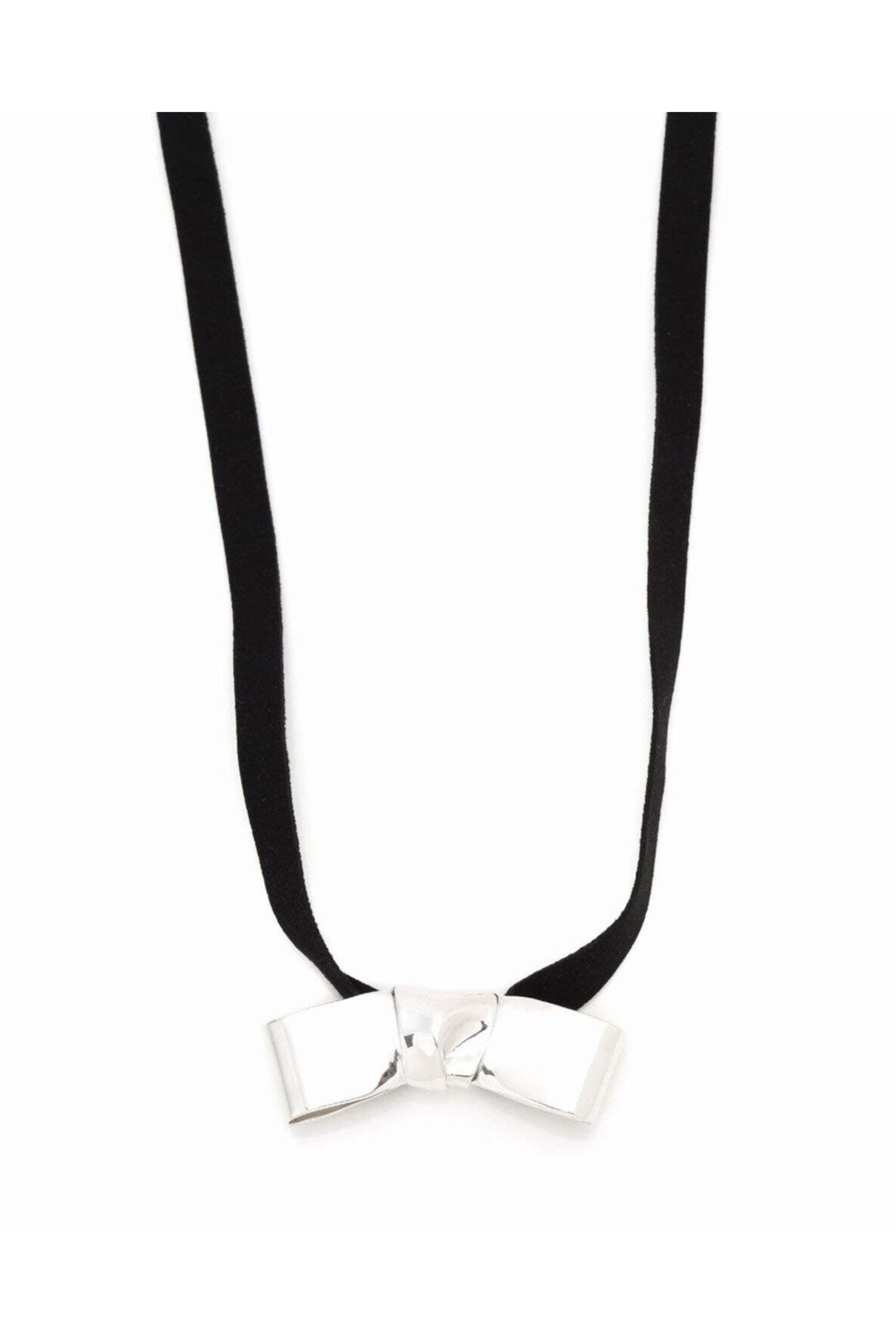 Annika Inez Petite Cravat Bow Necklace. Sterling silver. Faux suede ribbon. Petite cravat shaped pendant. Pendant 1.25. 27 L. Tie fastening.