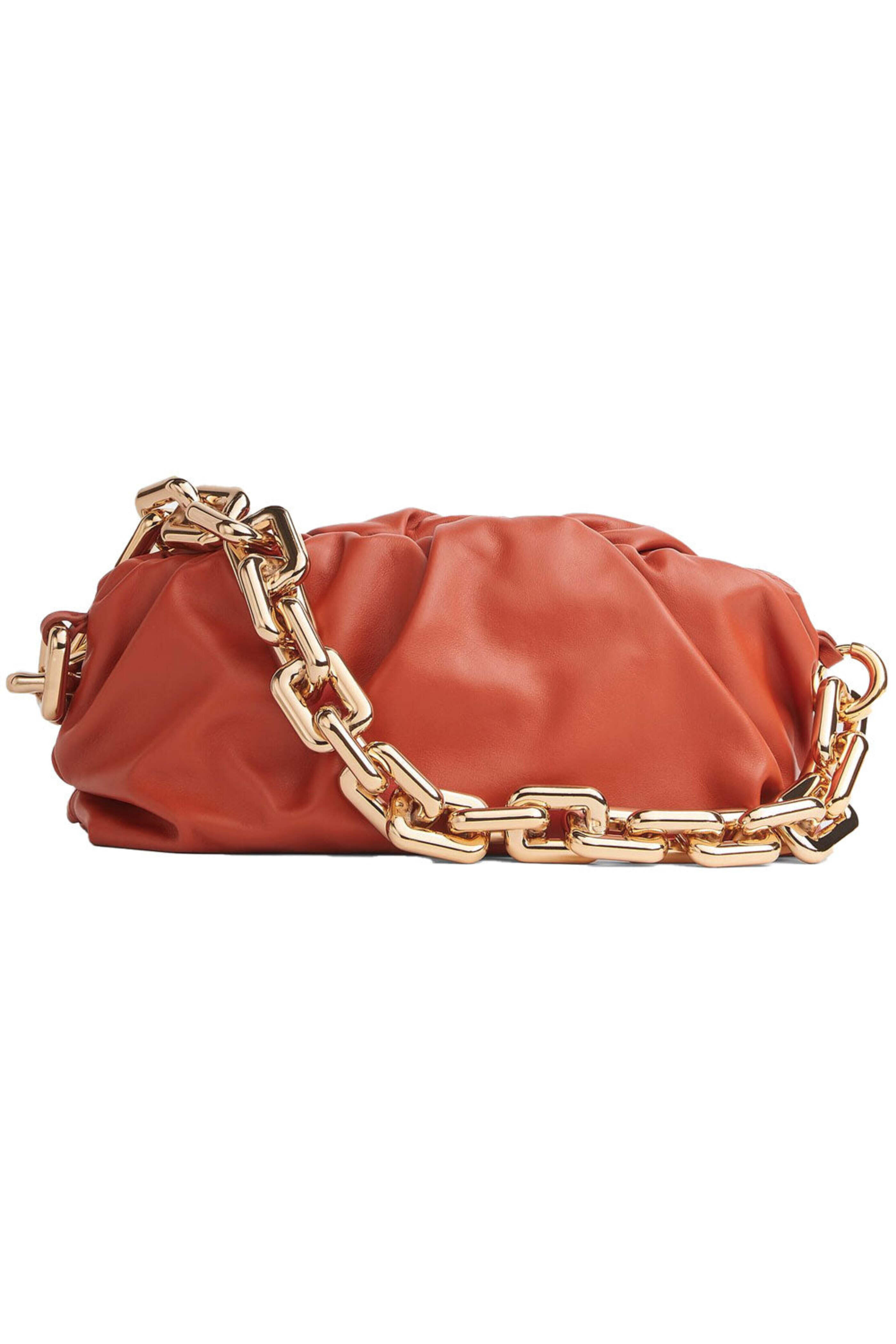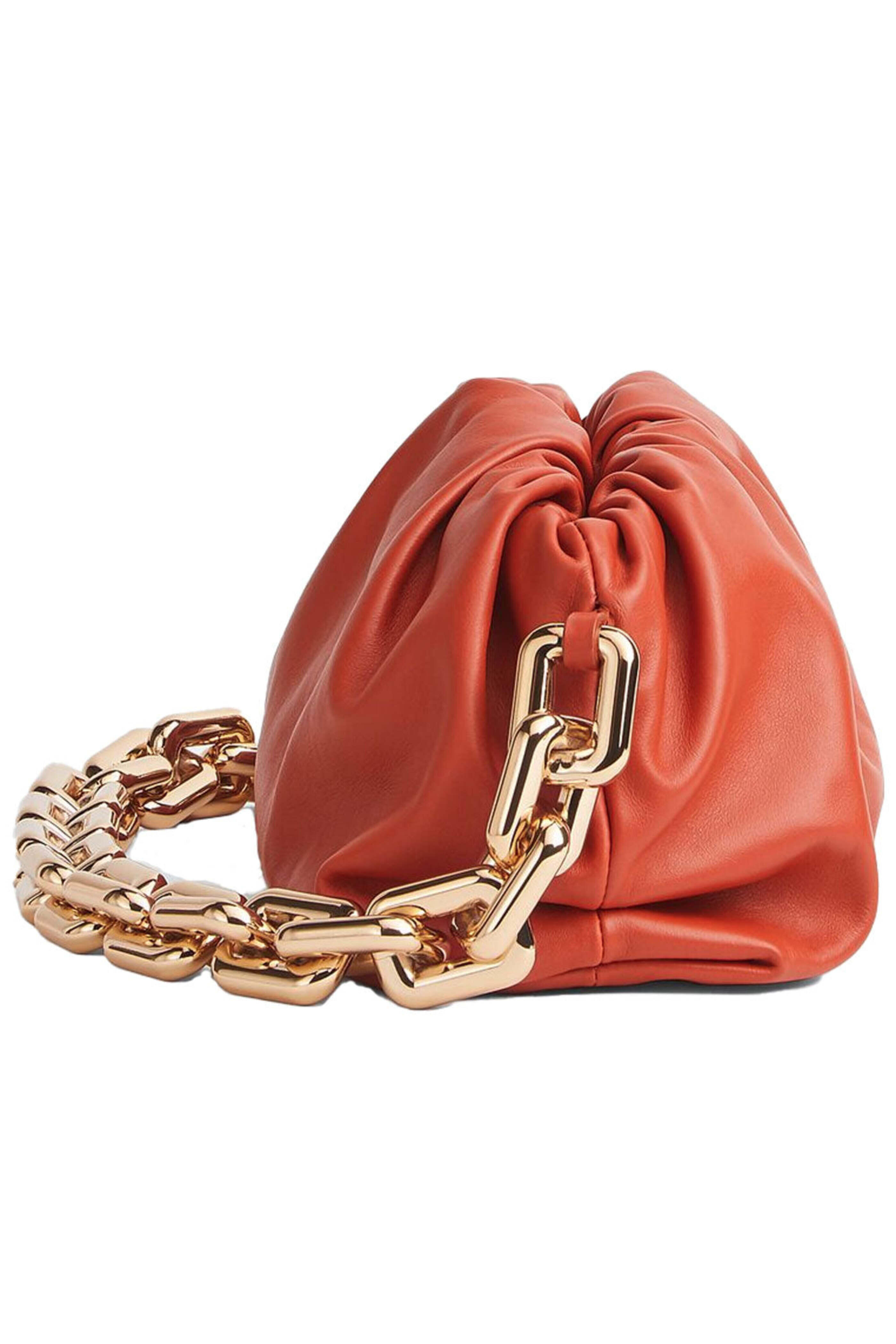 Bottega Veneta Chain Pouch in Maple. Clutch with shoulder chain. Magnetic frame closure. Single compartment. Gold tone hardware. Calfskin outer and lining. 12.2 W X 4.72 H X 6.2 D. 9.84 strap drop. Made in Italy.