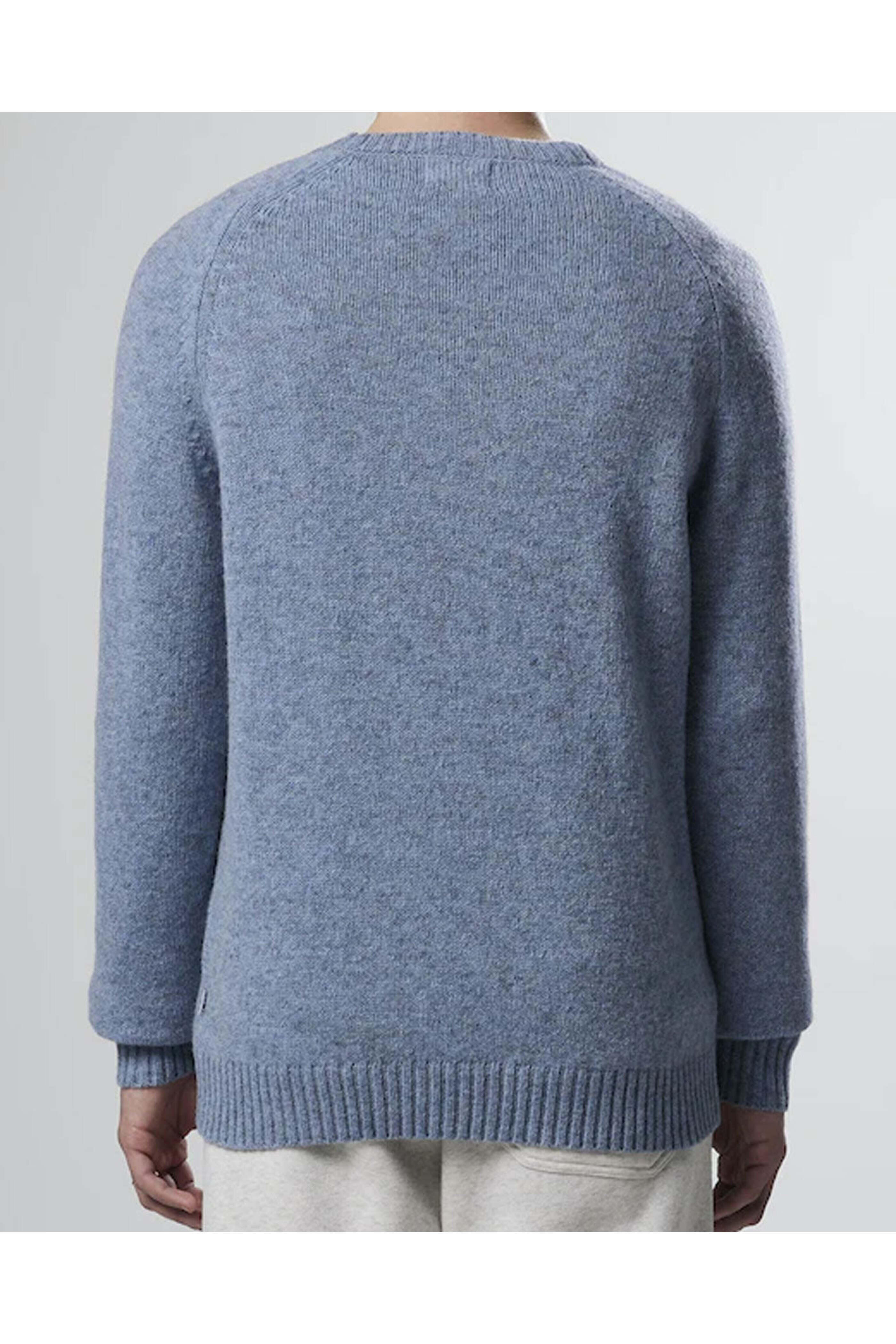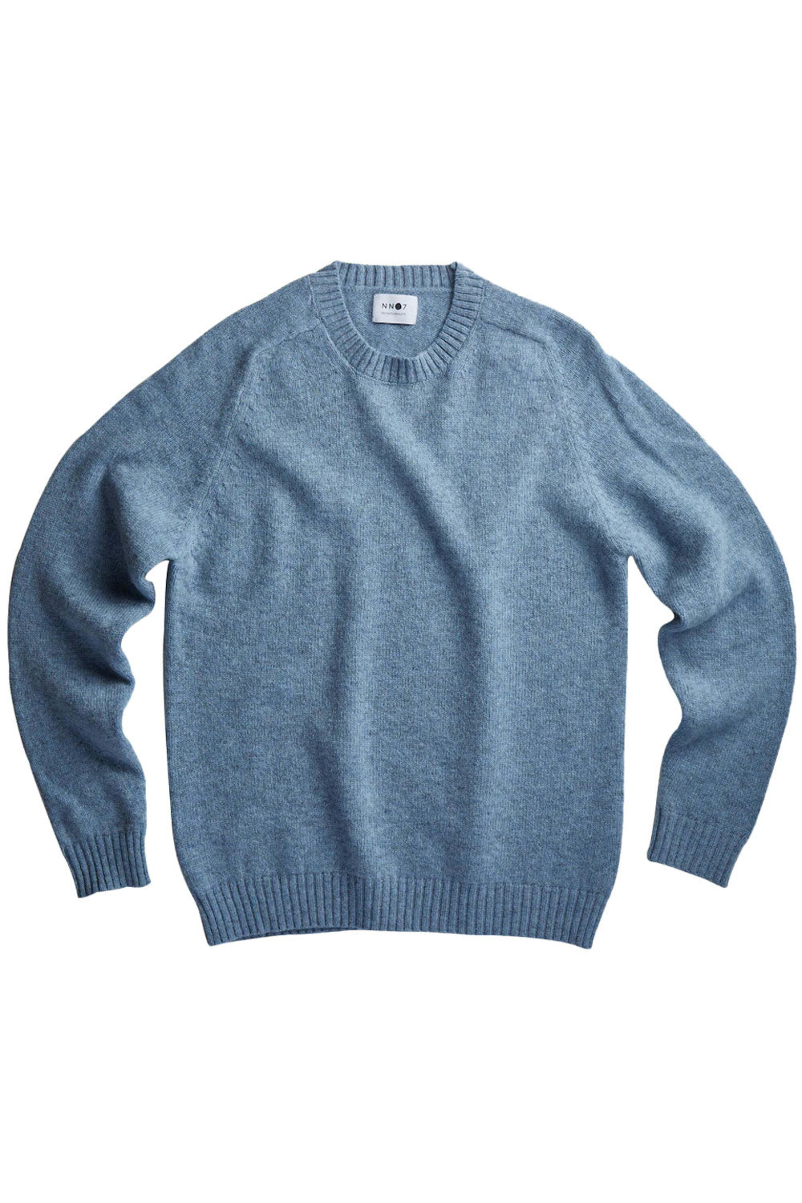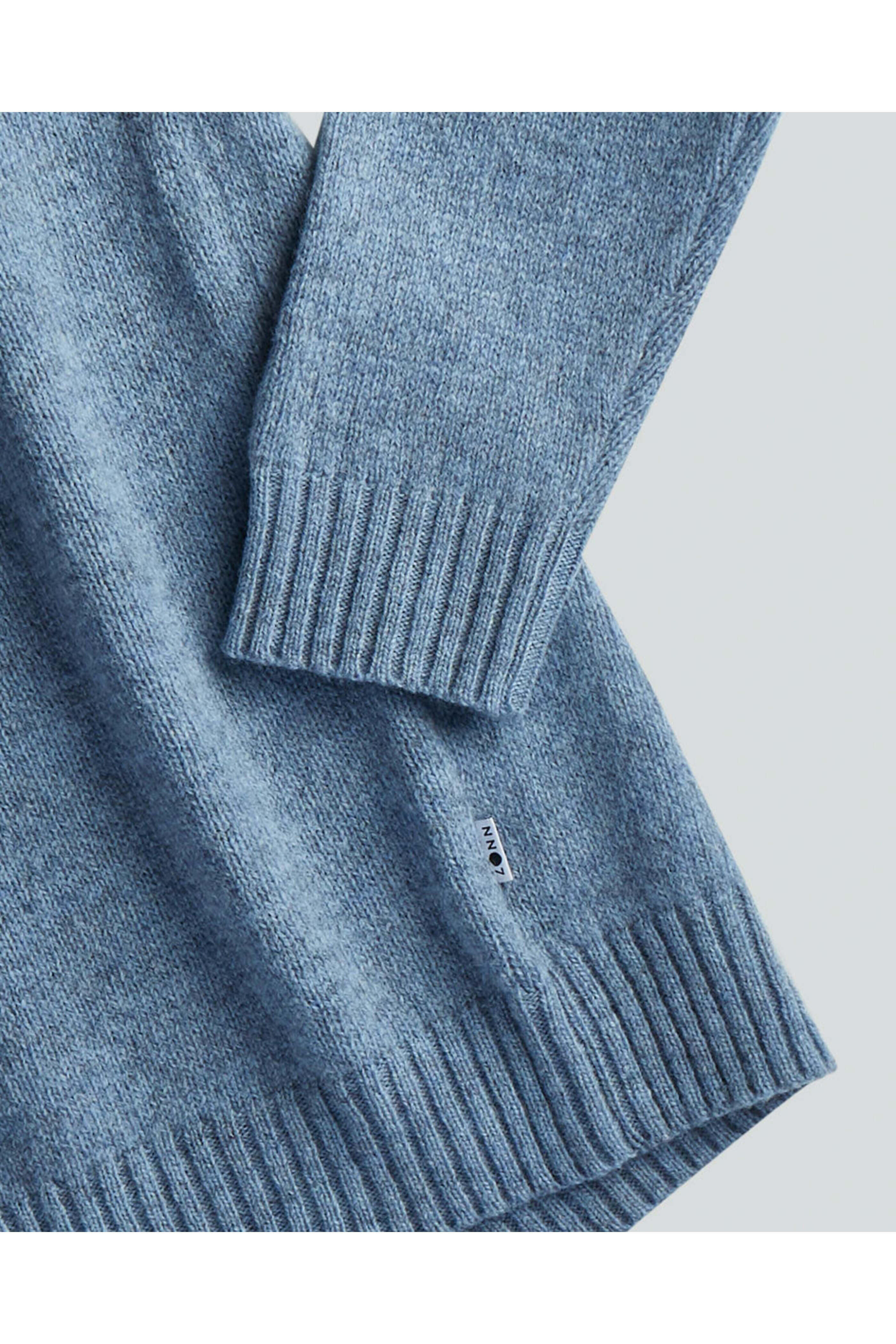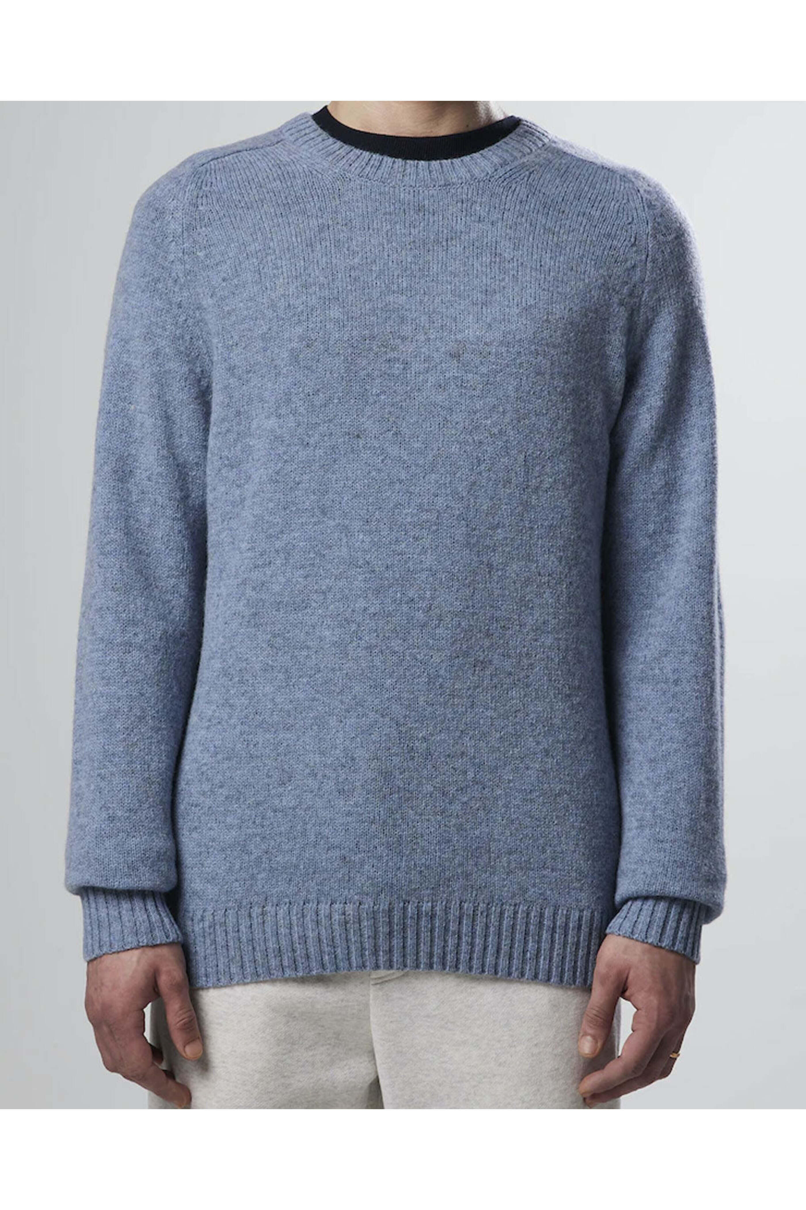 NN07 Nathan Light Blue Sweater. Crew neckline. Saddle shoulder. Pull over style. Long sleeves. Ribbed trim. 100% pure wool.