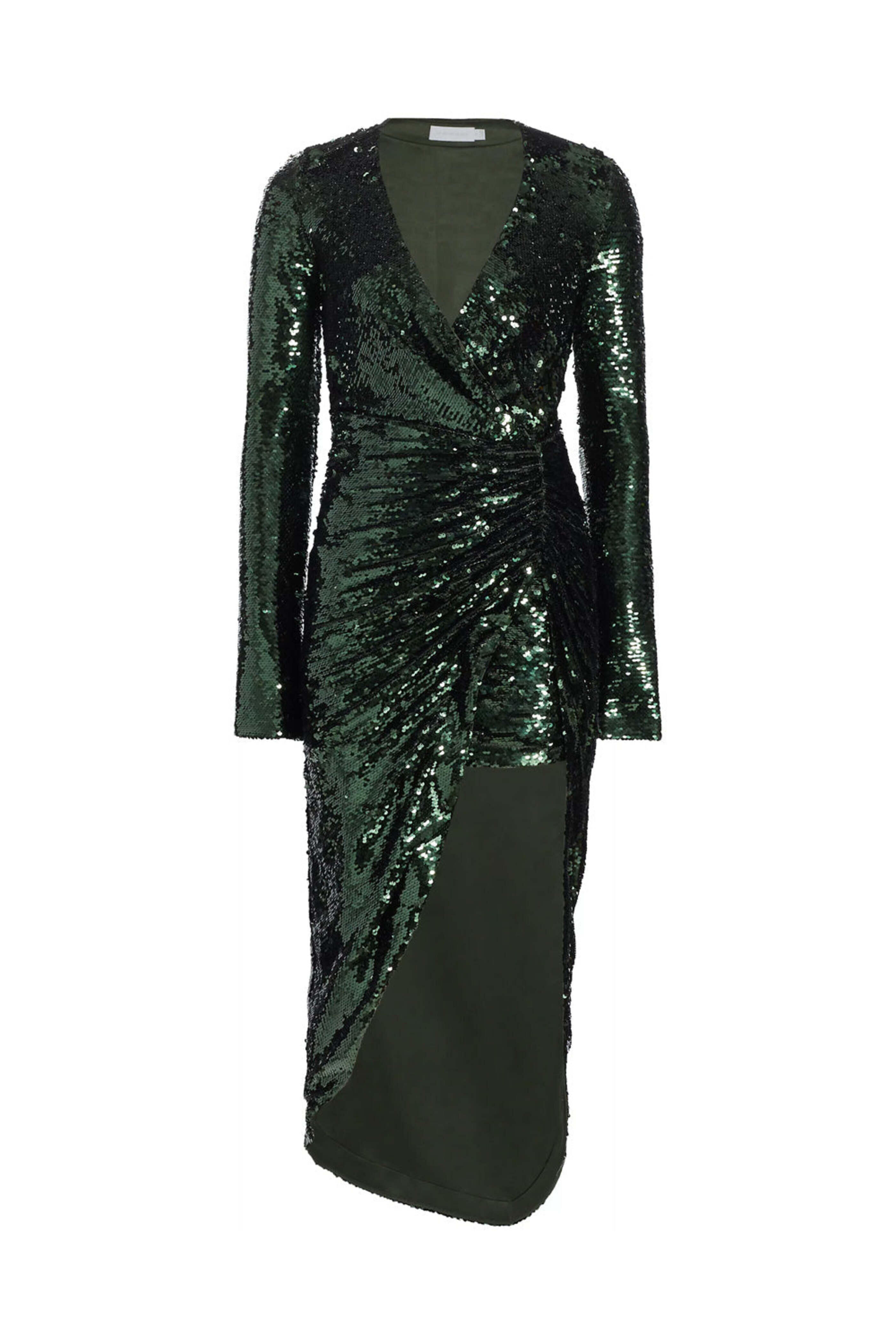 SIMKHAI Emerald Sequin Emersyn Long Sleeve Midi Dress. V neck. Long sleeves. Concealed side zip closure. Ruched detail at hip. Asymmetrical hem. Slim fit. Mini to midi length. Sequin fabrication throughout. Lined. 100% polyester outer and lining.