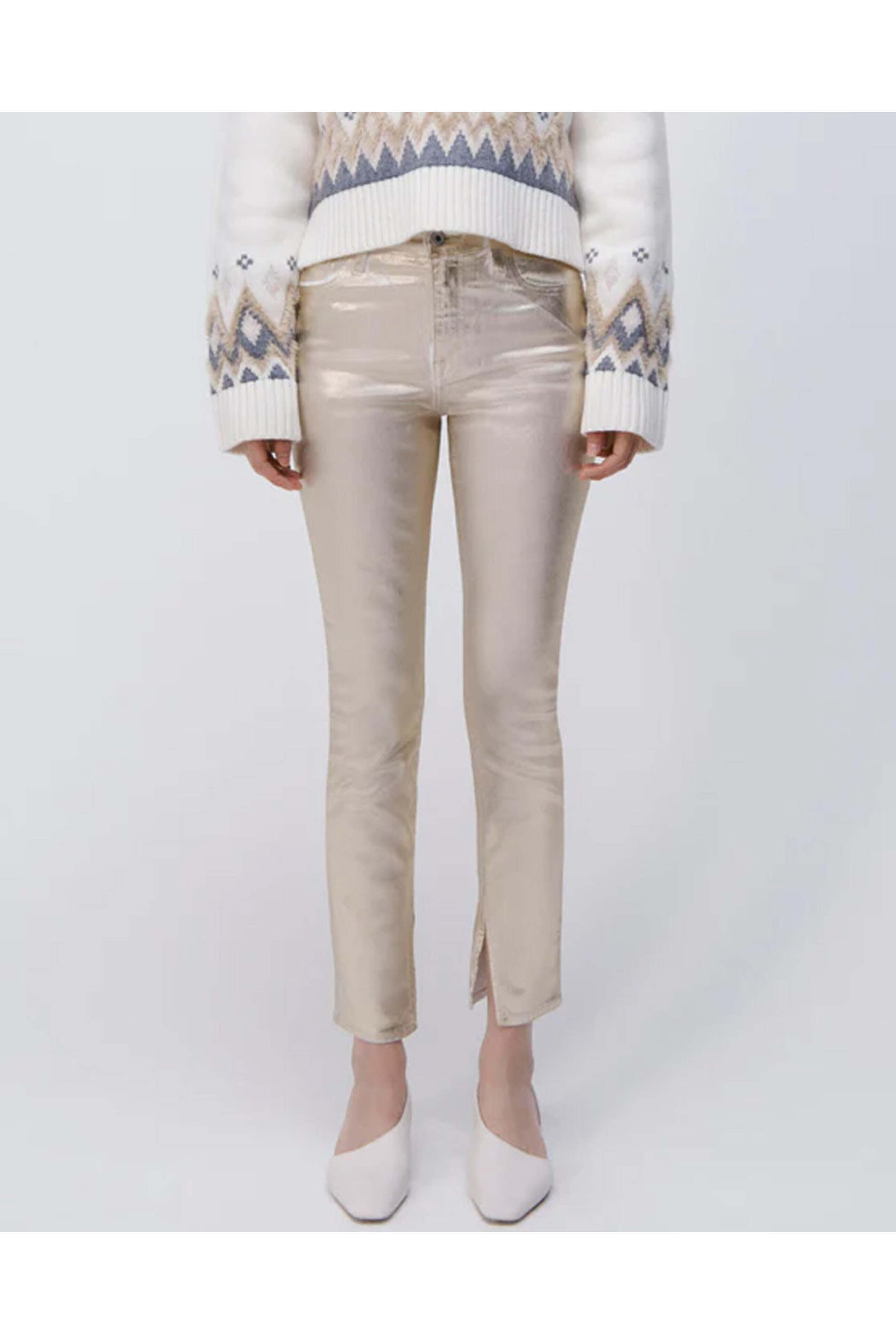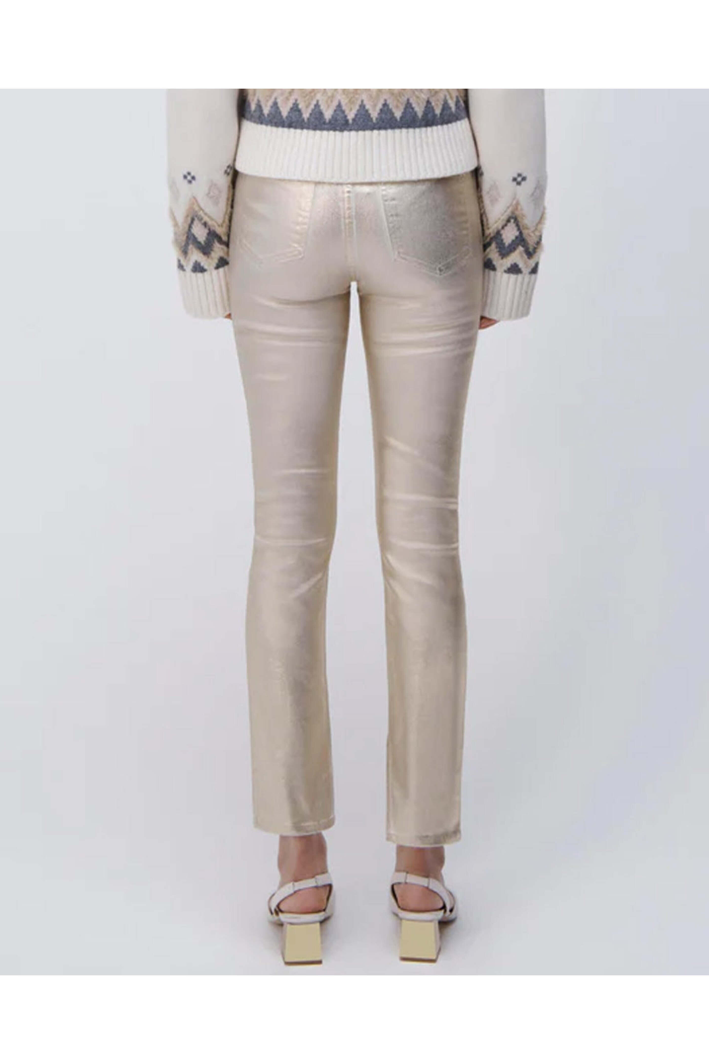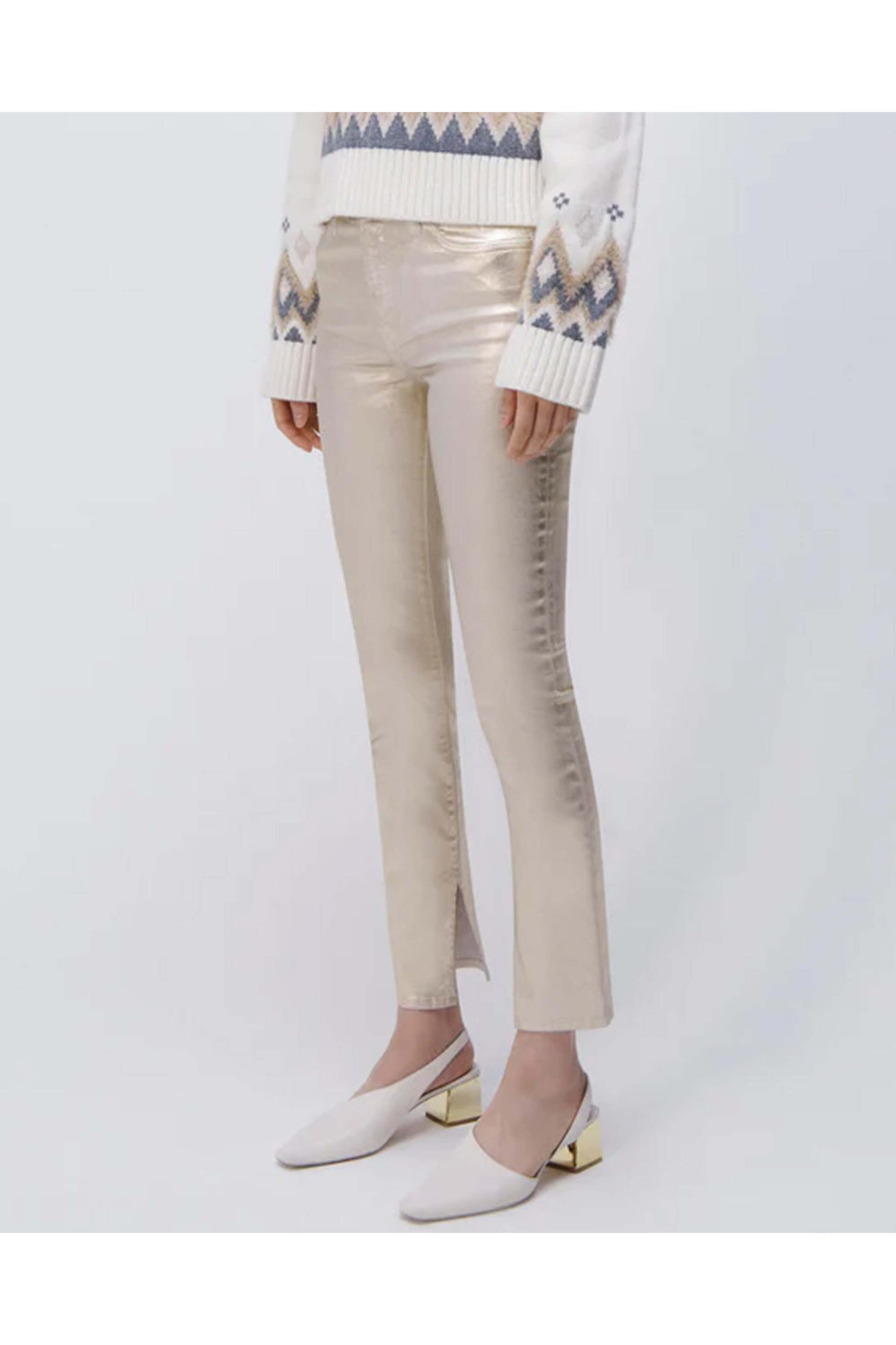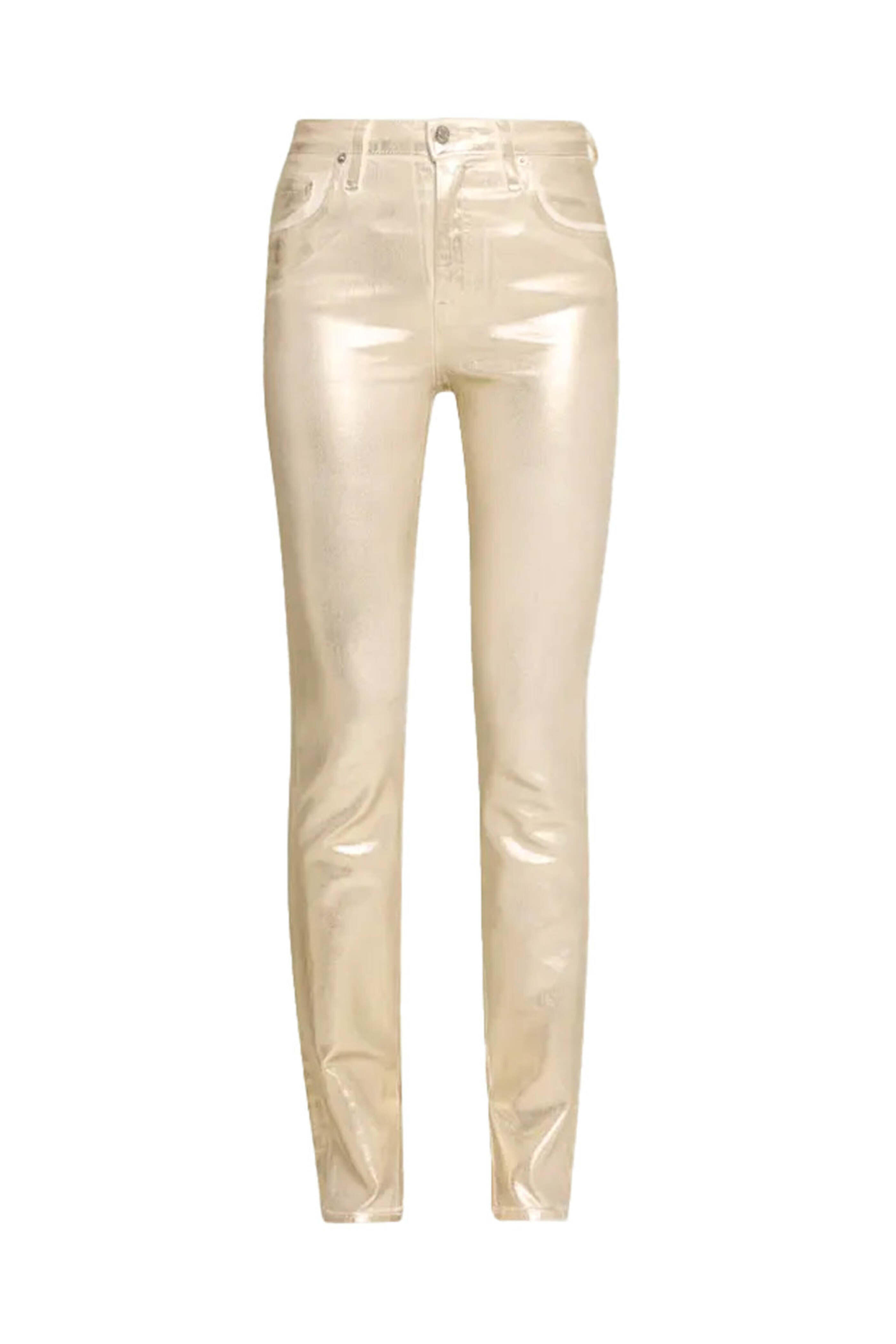 SIMKHAI Rae High Rise Ankle Skinny Jean in Gold Foil. High rise. Button closure. Zip fly. Belt loops. Five pocket style. Skinny silhouette. Ankle length. 92% cotton, 6% elastomultiestere, 2% elastane.