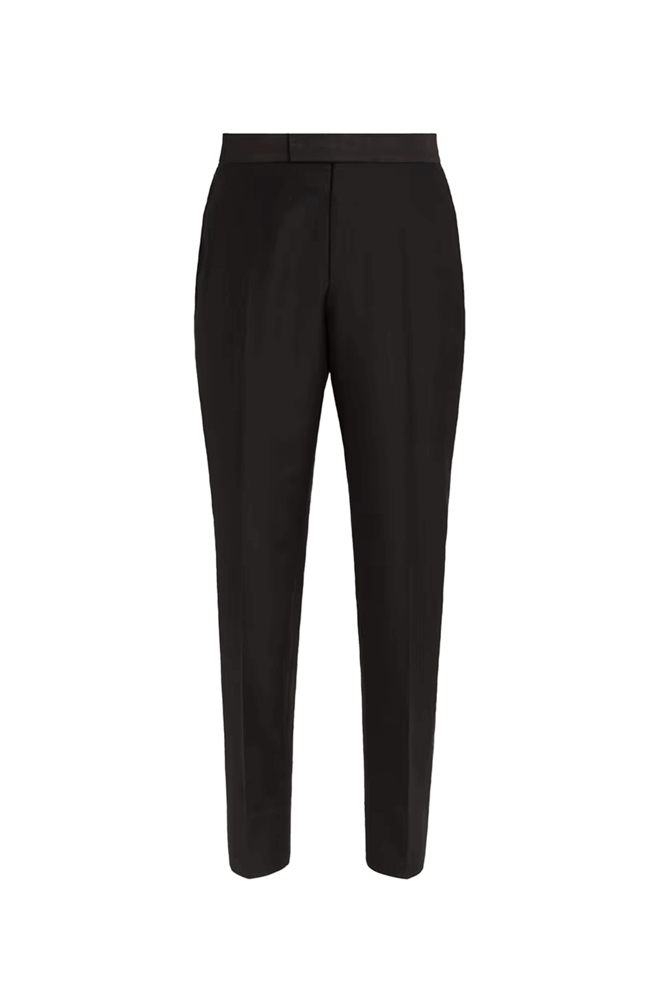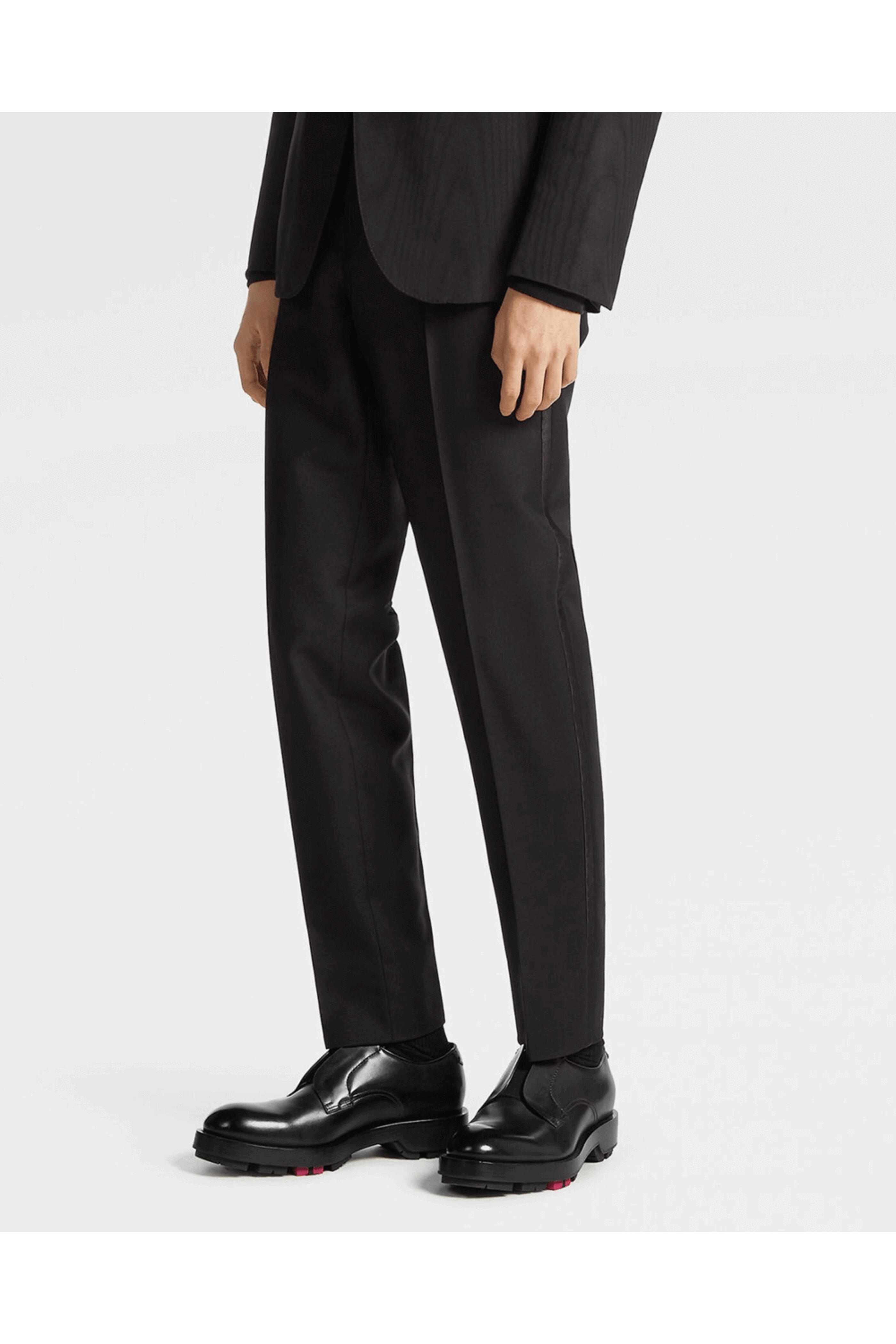 Zegna Black Evening Trouser. Zip fly. Hook and button closure. Side slip pockets. Back welt pockets. Satin stripe detail. Unfinished hem . 84% Wool, 16% mohair.