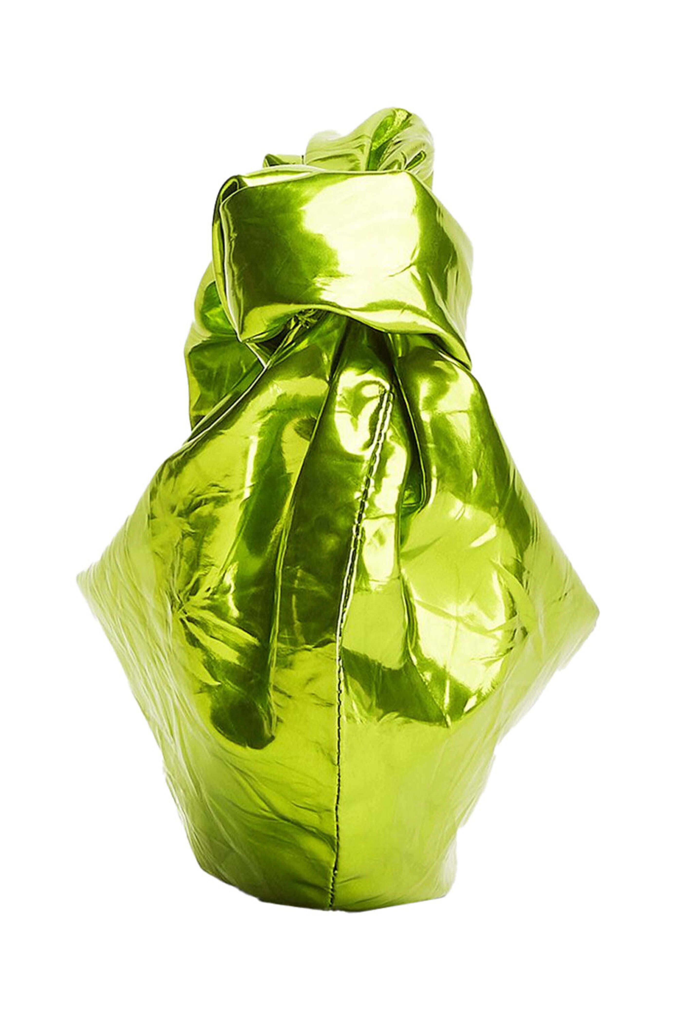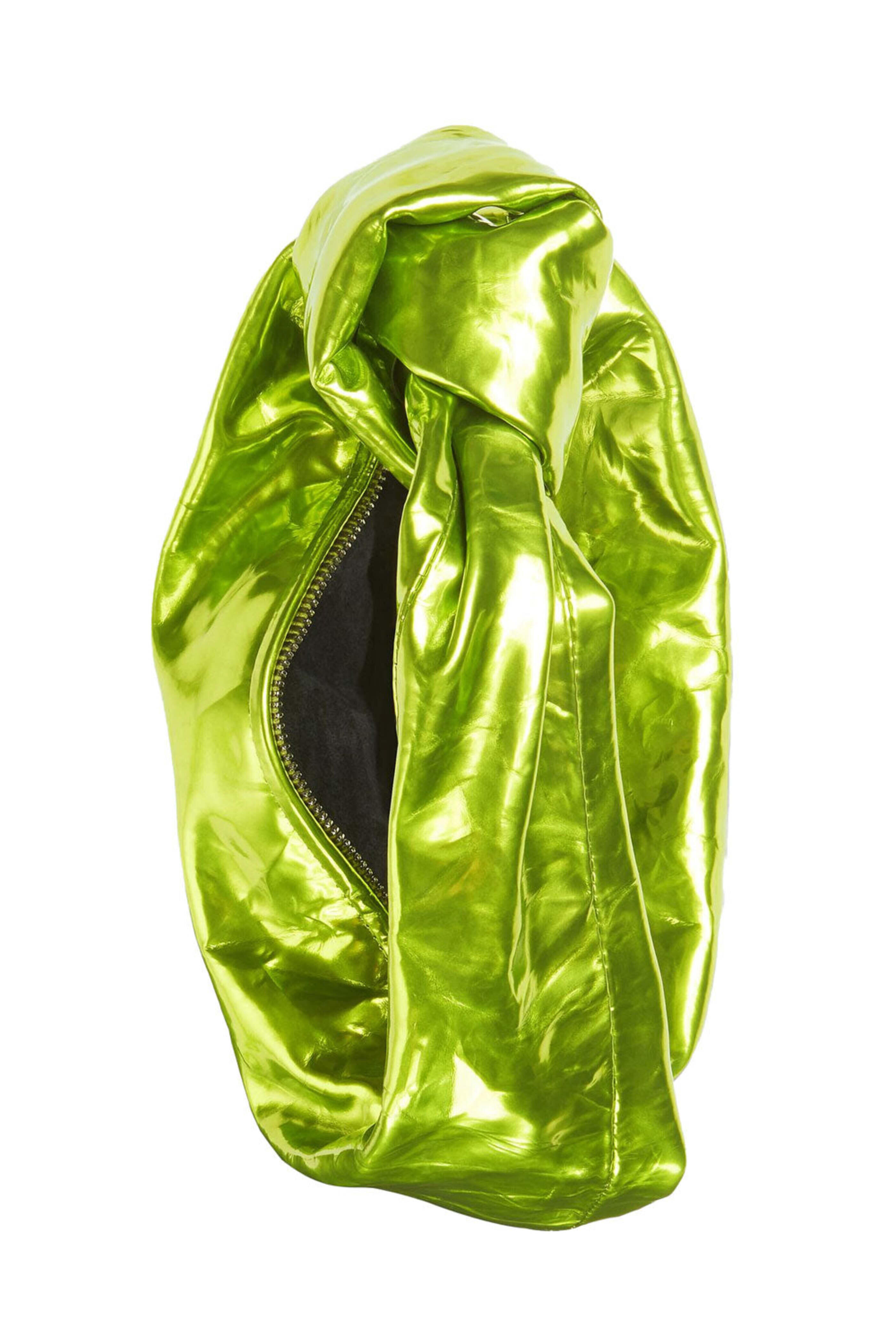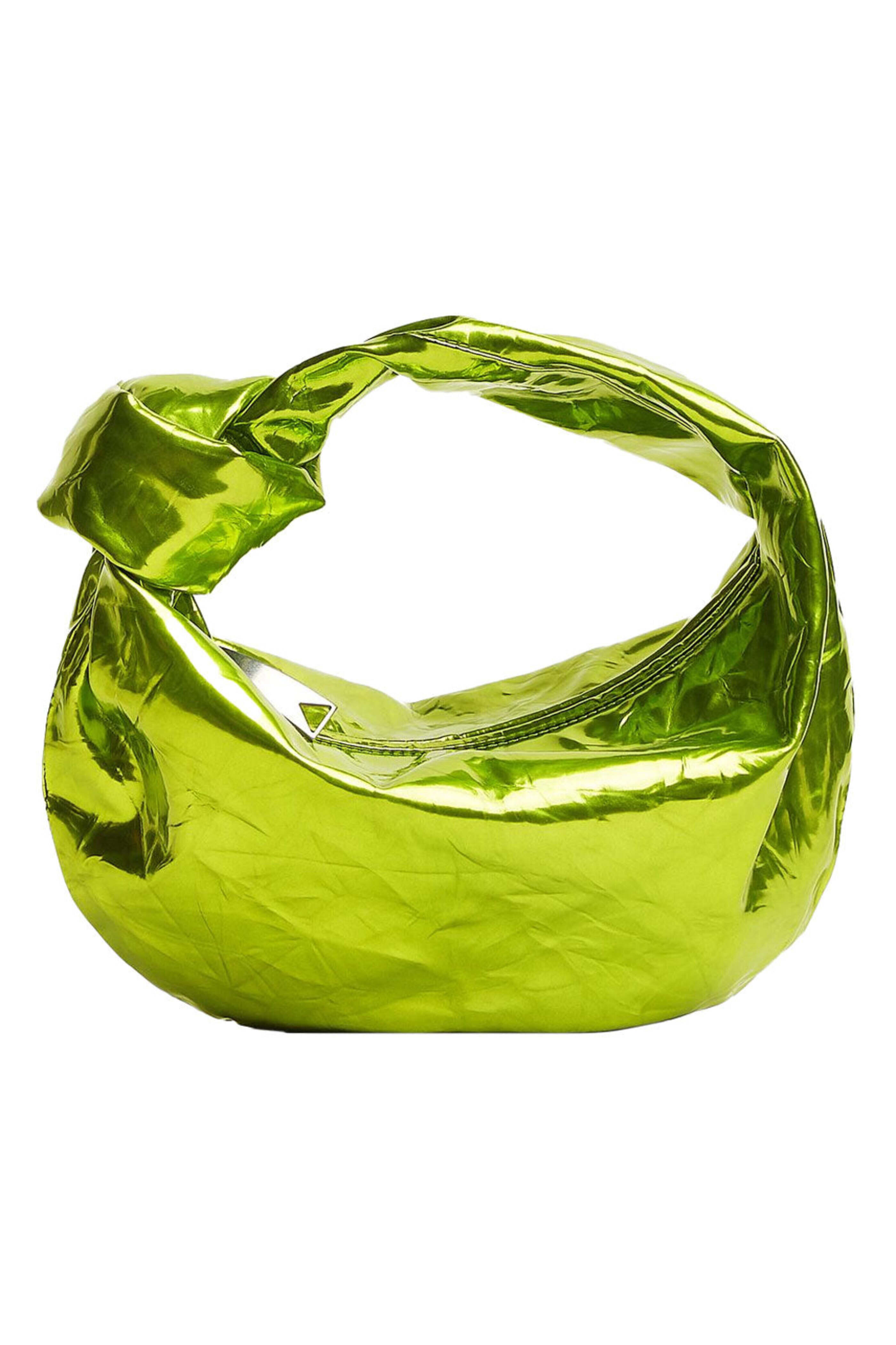 Bottega Veneta Mini Jodie Bag in Chlorophyl. Zip closure. Knotted top handle. Single compartment. Silver tone hardware. Metalized crinkle calfskin leather. Suede lining. 11 W X 9 H X 3.1 D. 3.9 handle drop. Made in Italy.