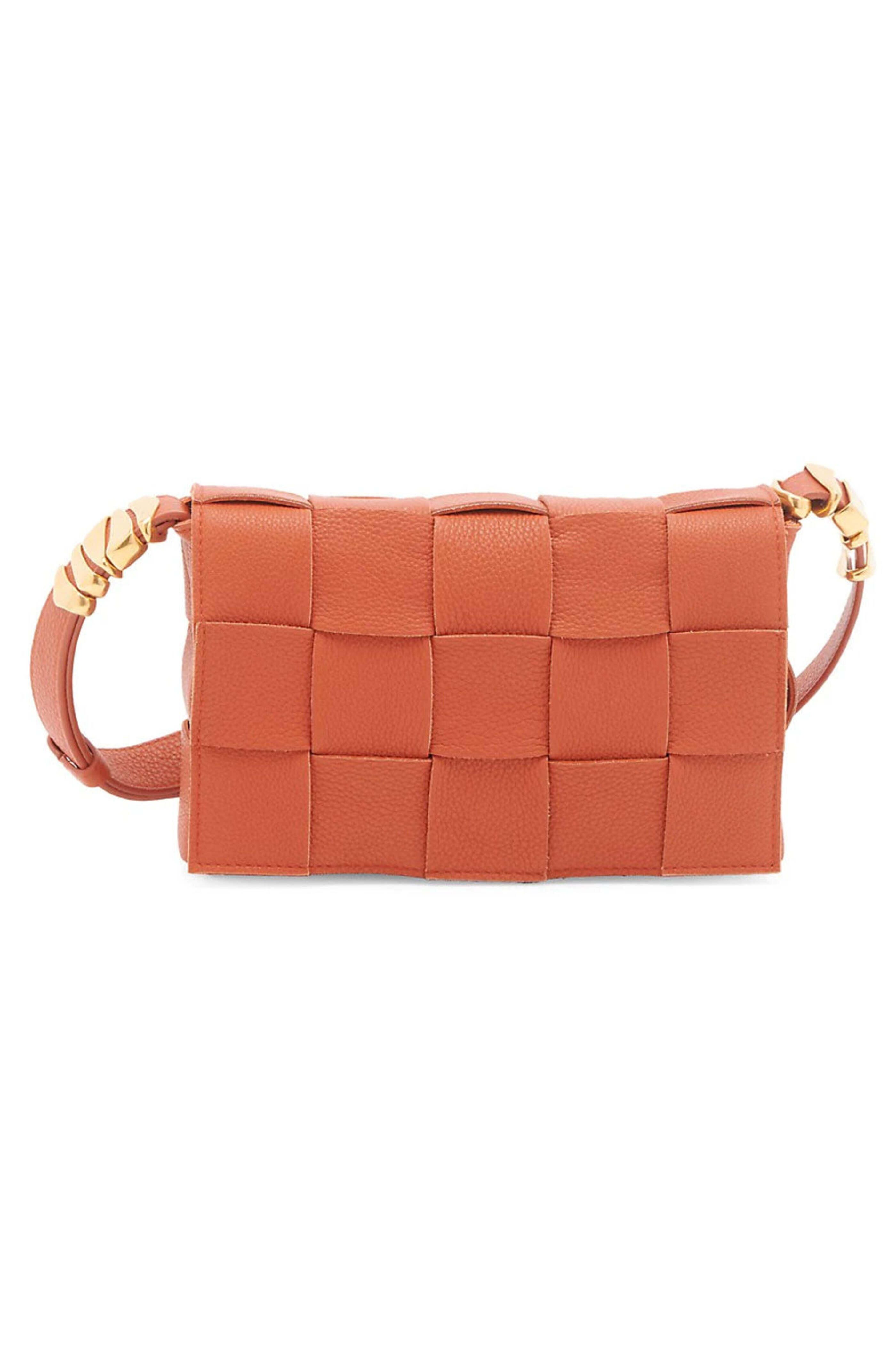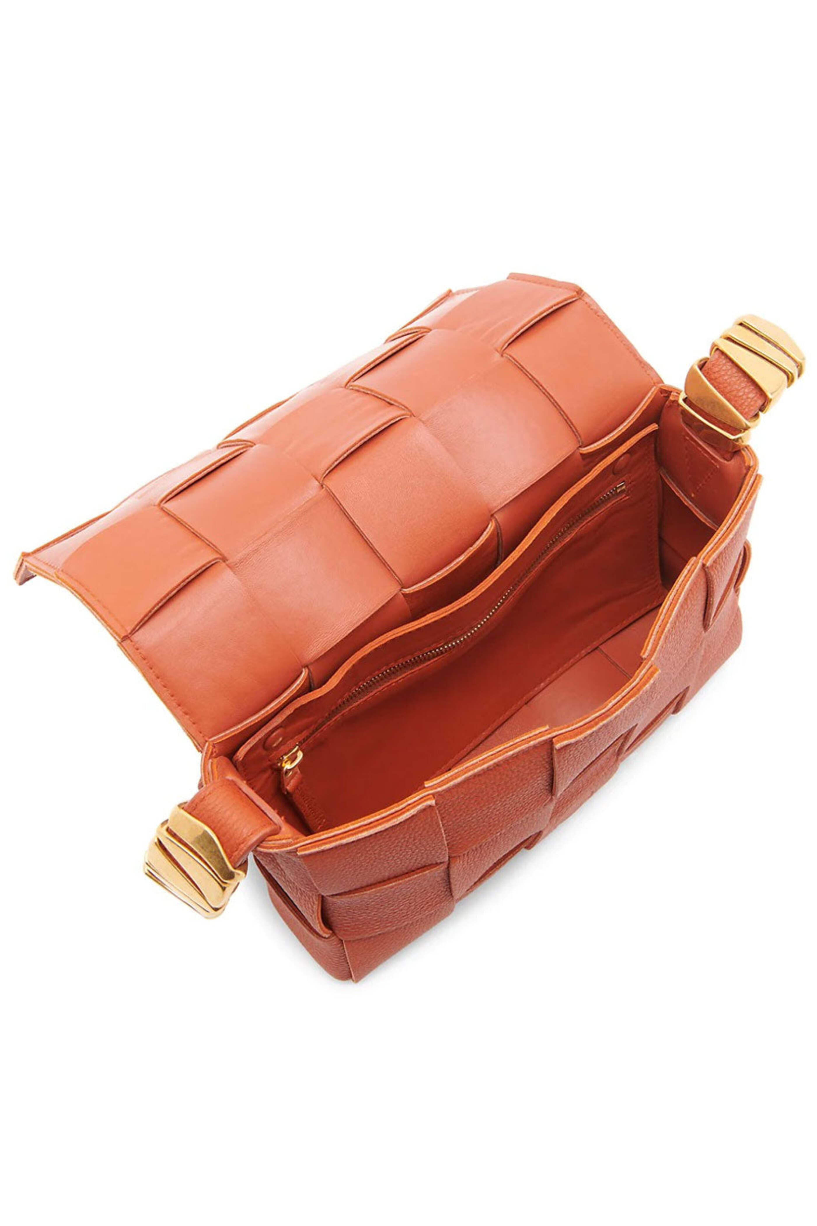 Bottega Veneta Maple New Cassette Crossbody. Magnetic top flap. Gold tone hardware. One interior compartment. Interior zip pocket. Leather. Lining: Leather. Made in Italy. Adjustable crossbody strap, 21.75" drop. 9"W x 6"H.