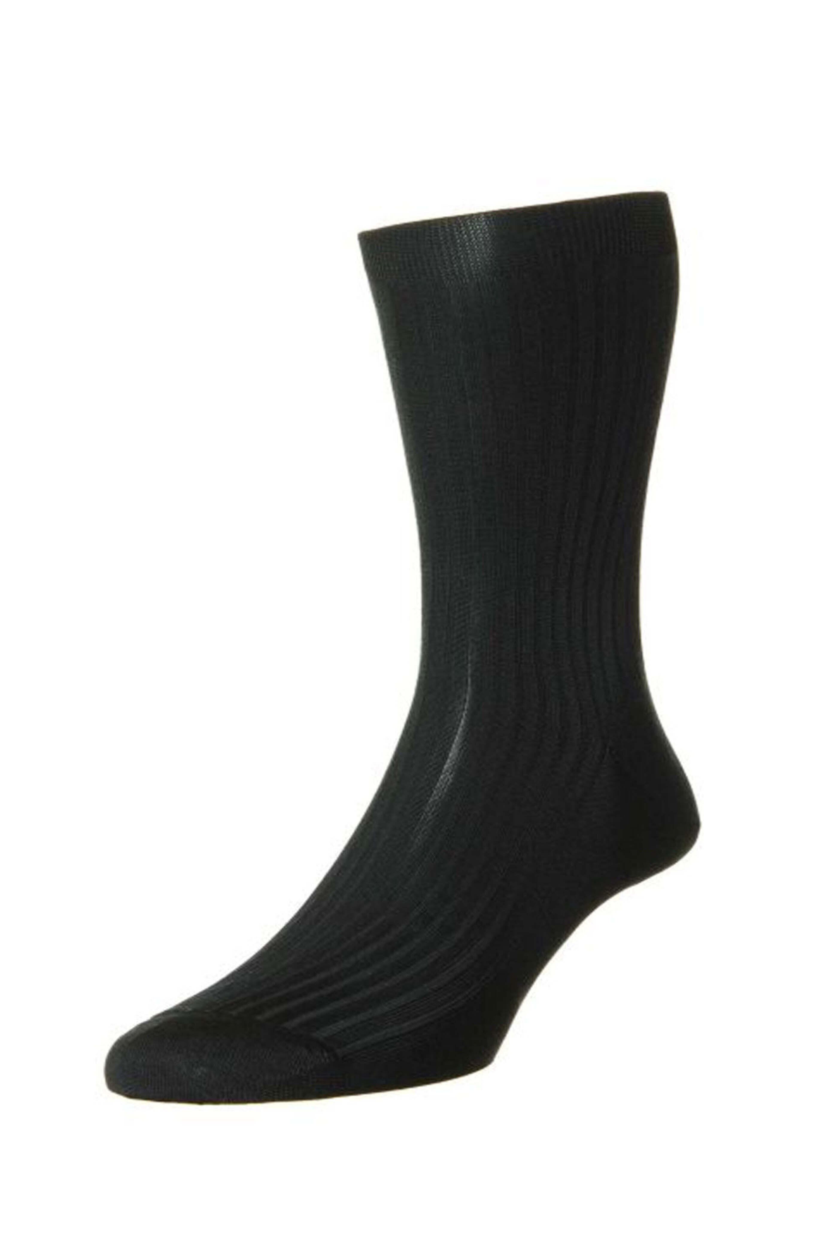 Pantherella Black Baffin Over The Calf Sock. Luxury collection. Seamless toe. Tailored. Over the calf. Made in England. 100% Silk.