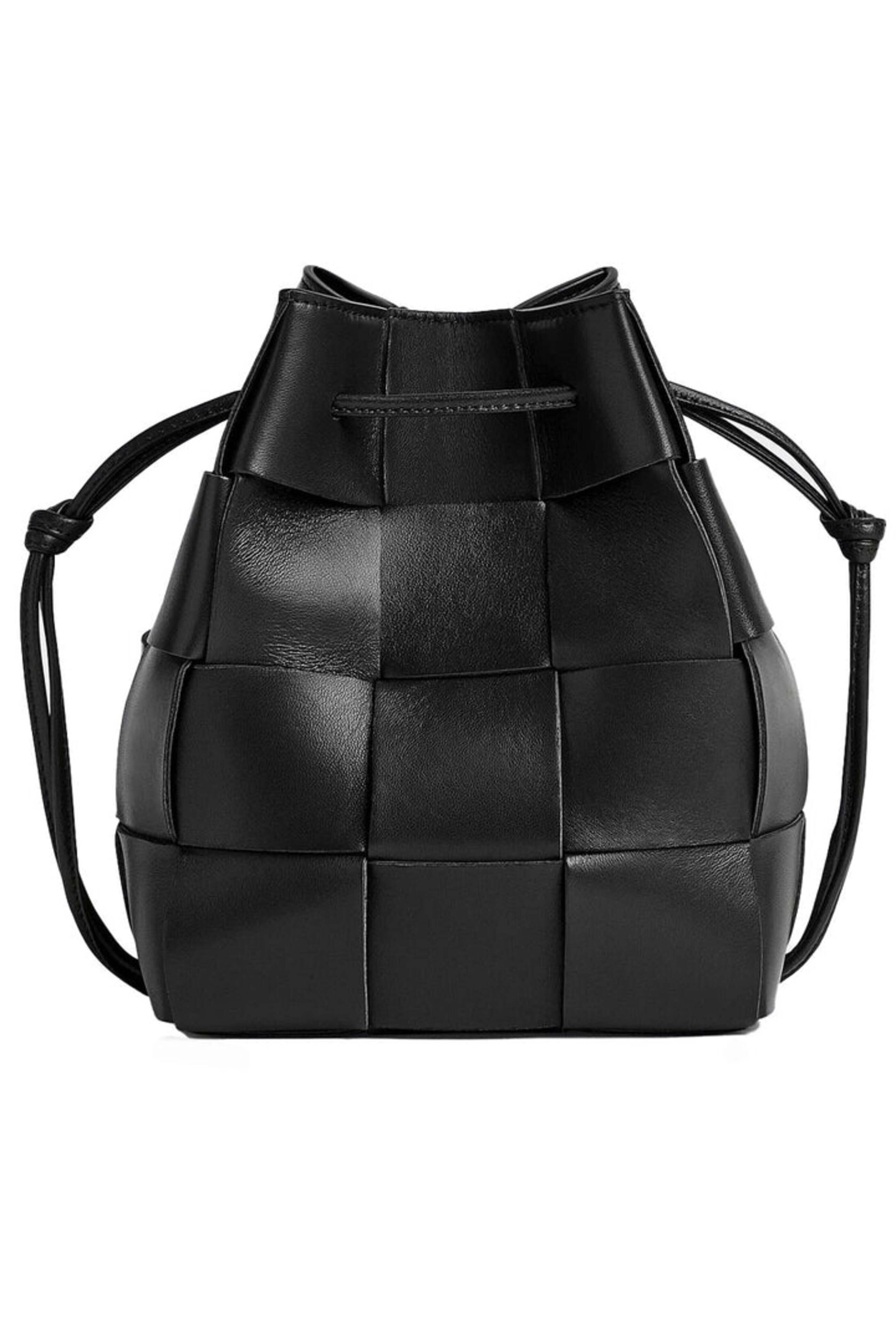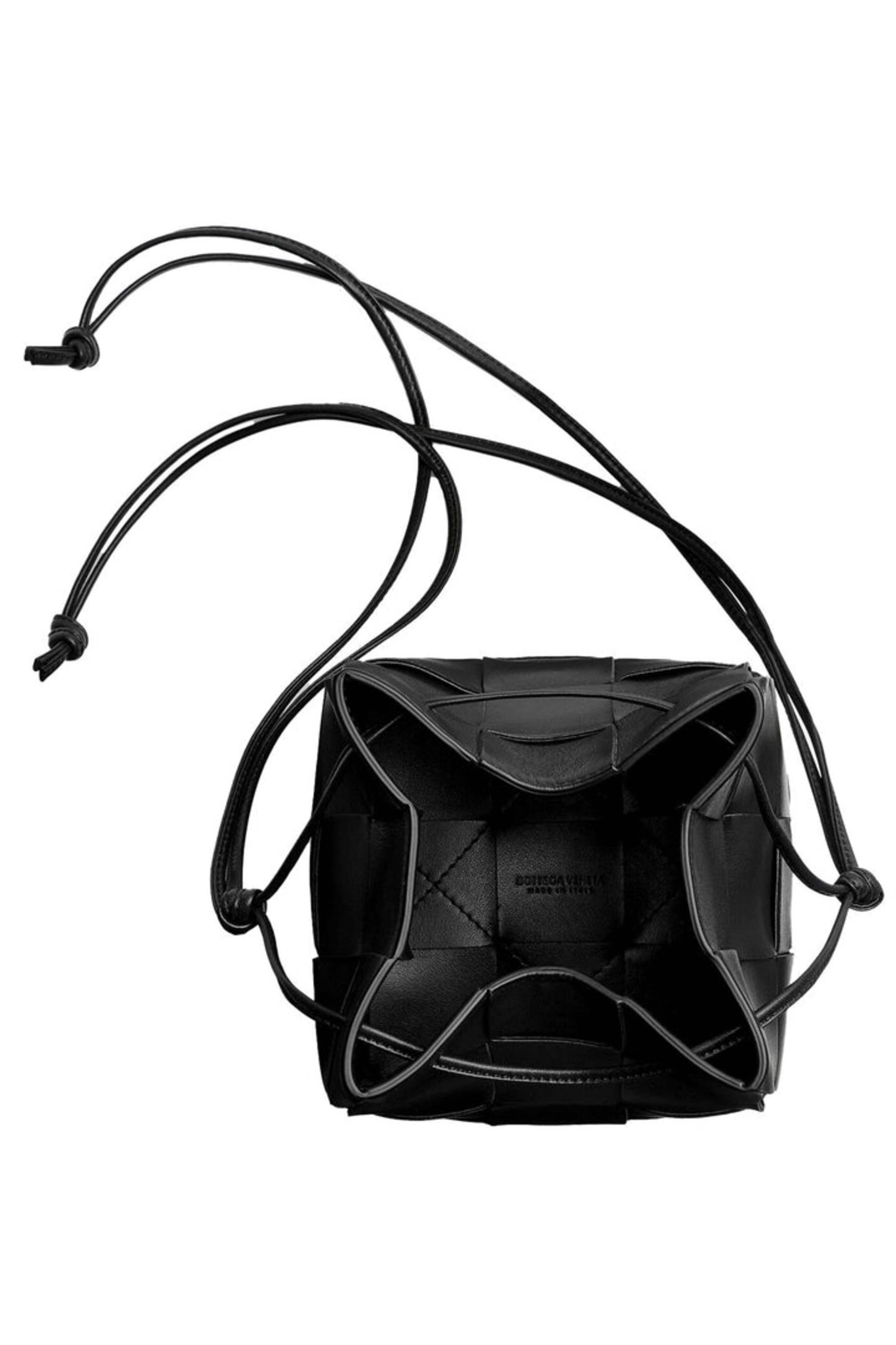 Bottega Veneta Cassette Bucket Bag in Black. Drawstring closure. Single interior open pocket. Gold tone hardware. Signature woven leather. Lambskin and calfskin outer. Calfskin lining. 5.5 W X 7.1 H X 5.5 D. 19.7 strap drop. Made in Italy.