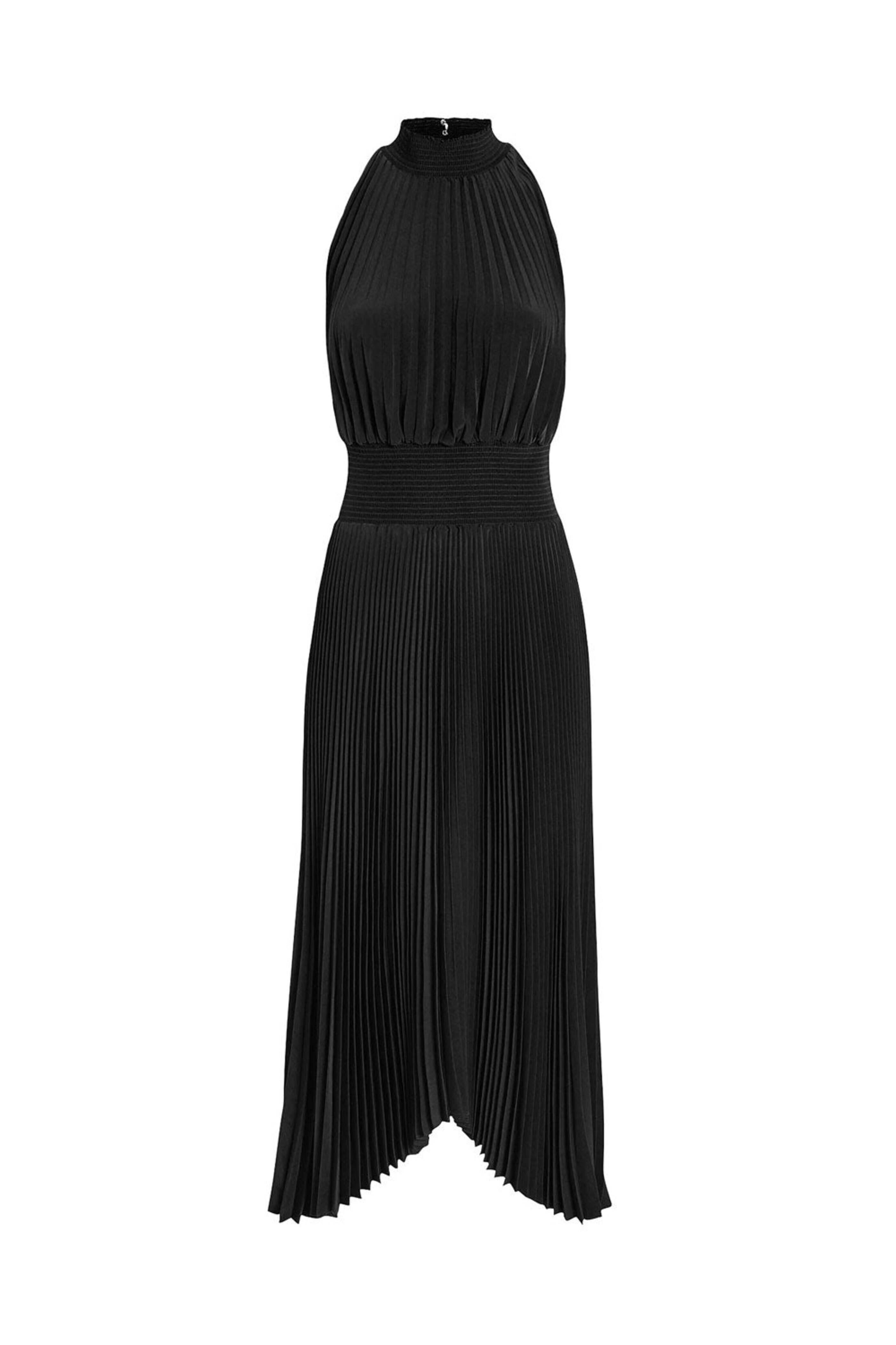 A.L.C. Black Halter Neck Renzo Midi Dress. High, smocked neck; back button closure. Keyhole detail. Sleeveless. Elastic waist. Pleated throughout. Handkerchief hem. Midi length. Pleated throughout. 100% polyester.