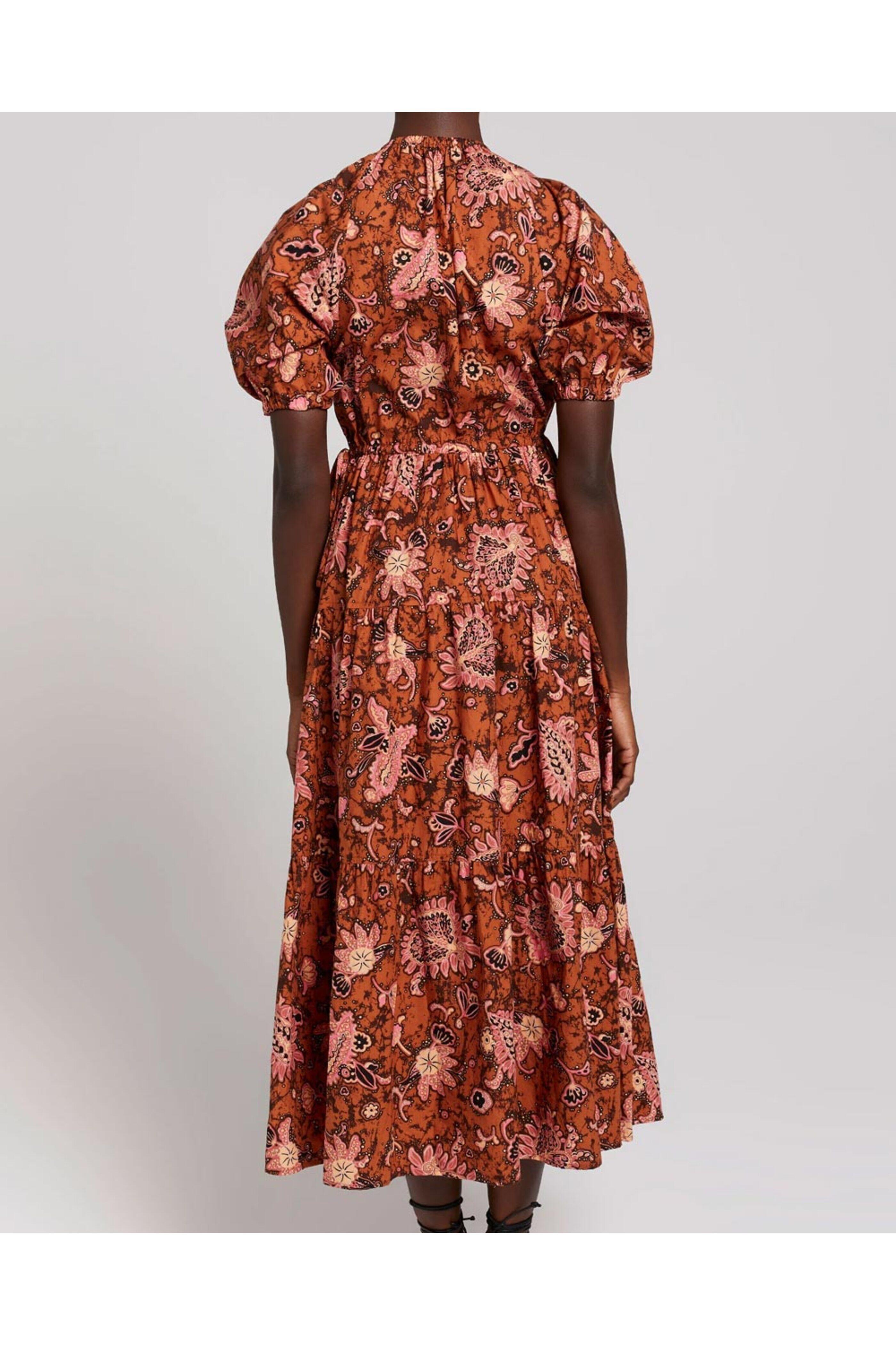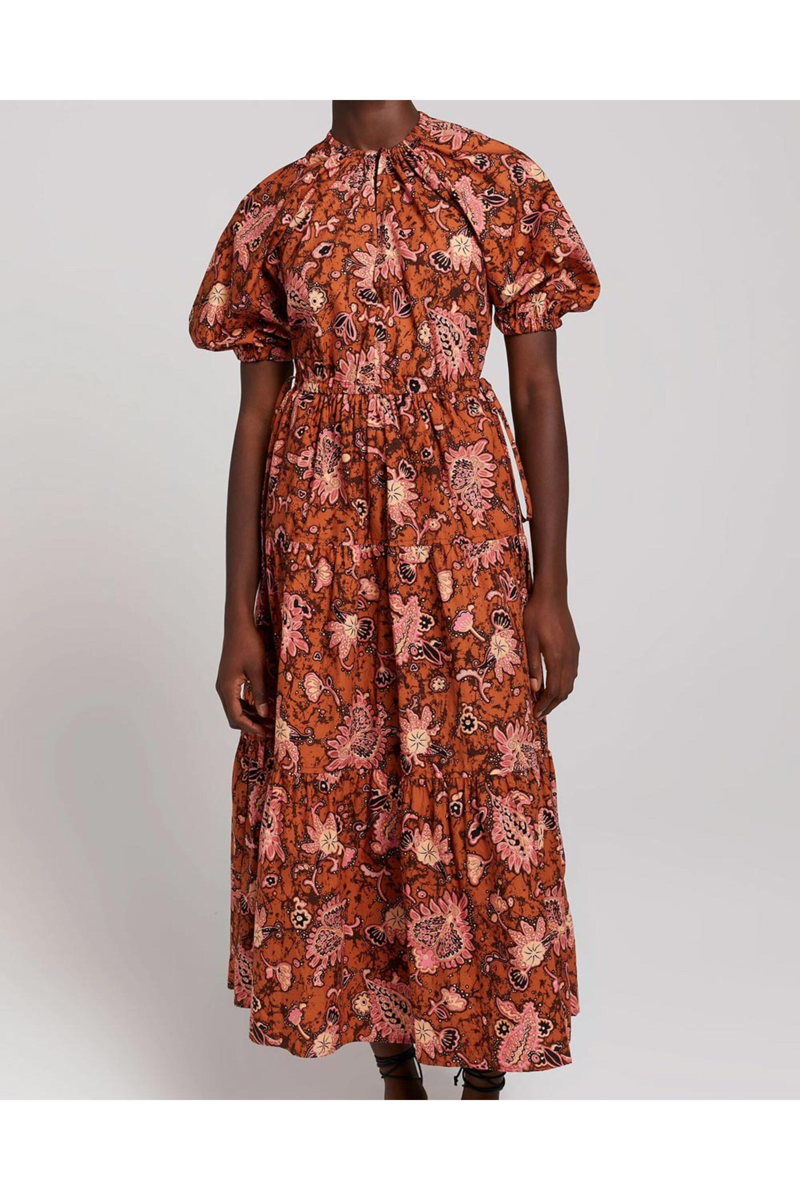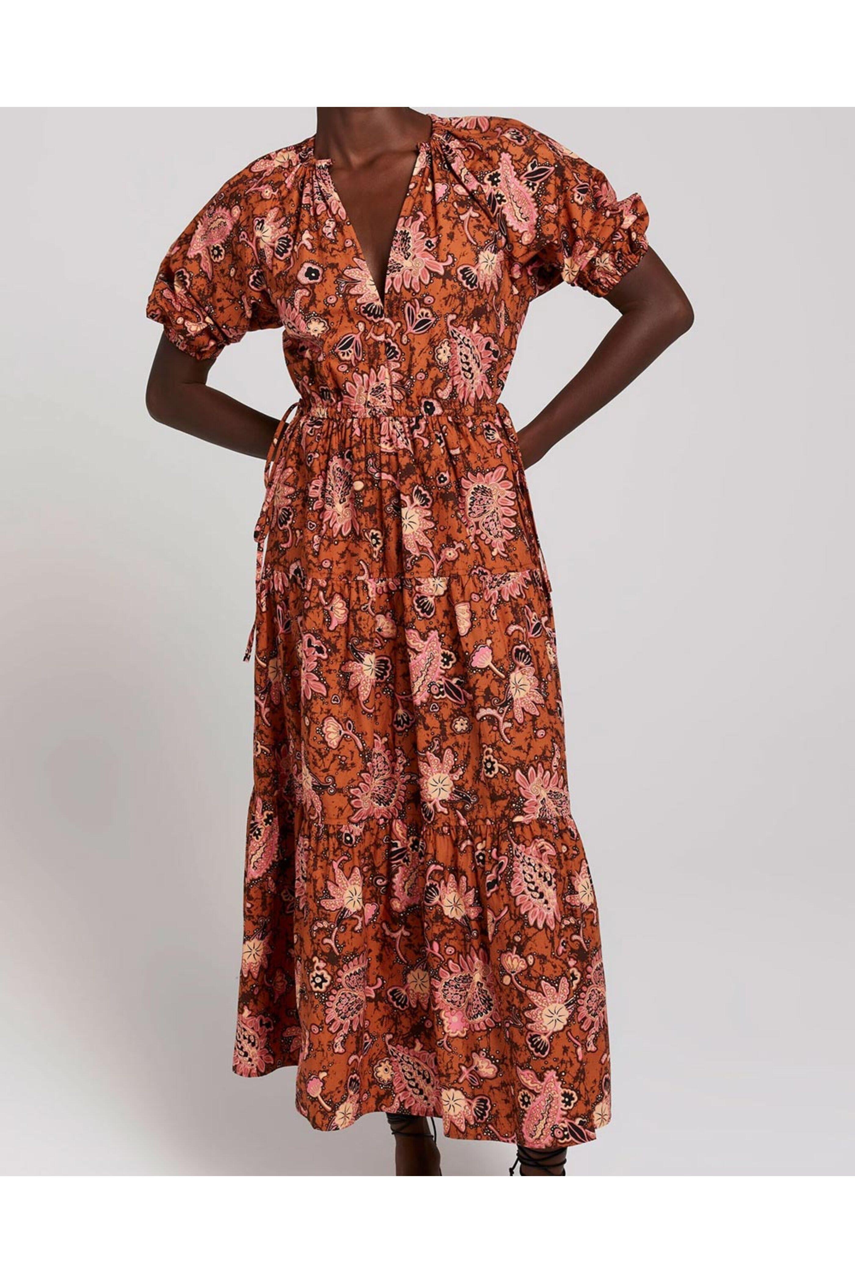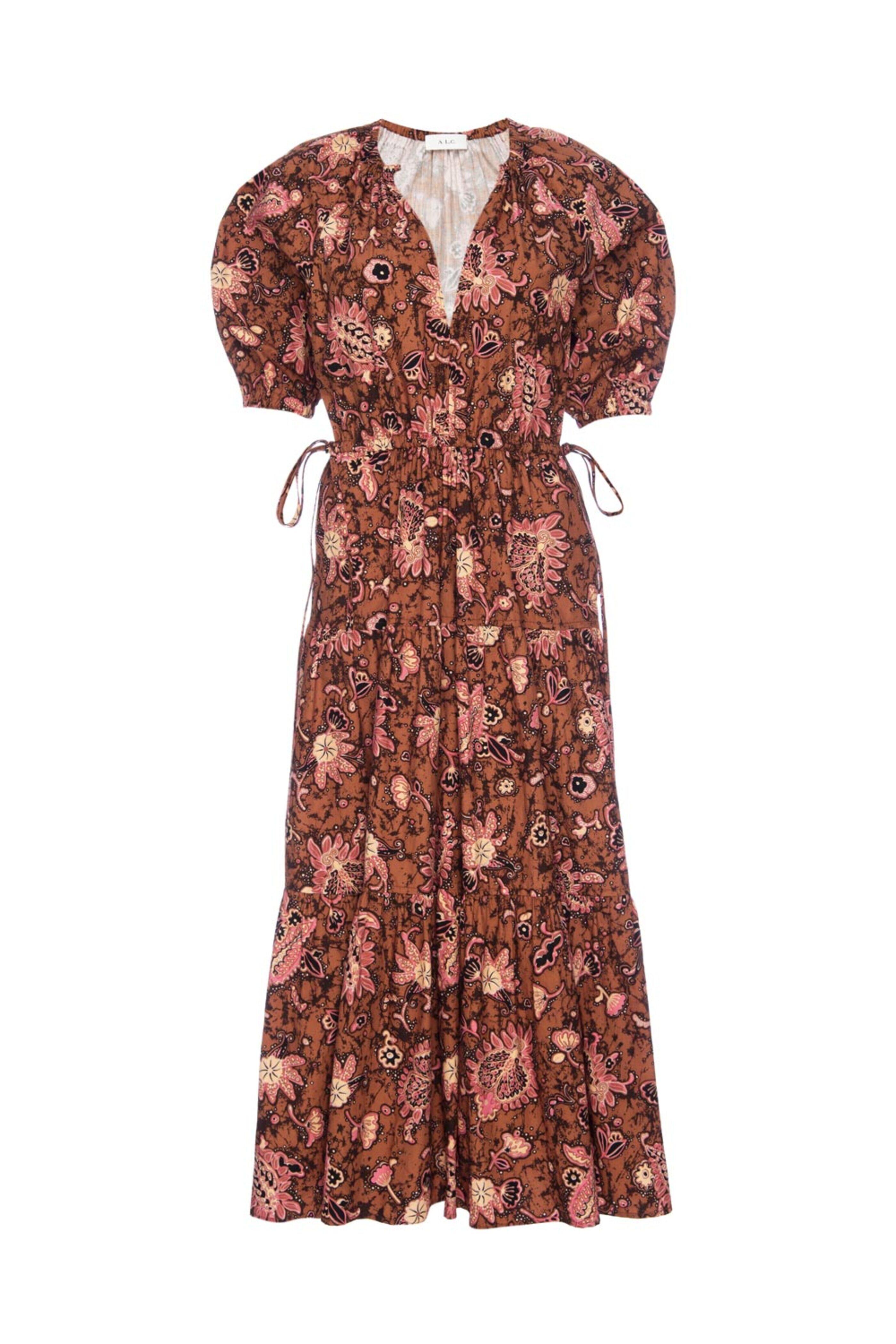 - A.L.C. Cognac and Coral Paisley Mischa Midi Dress V neck Short puffed sleeves; elastic cuffs Button down front closure Drawstring waist Relaxed fit Tiered skirt silhouette Midi length Unlined 100% cotton