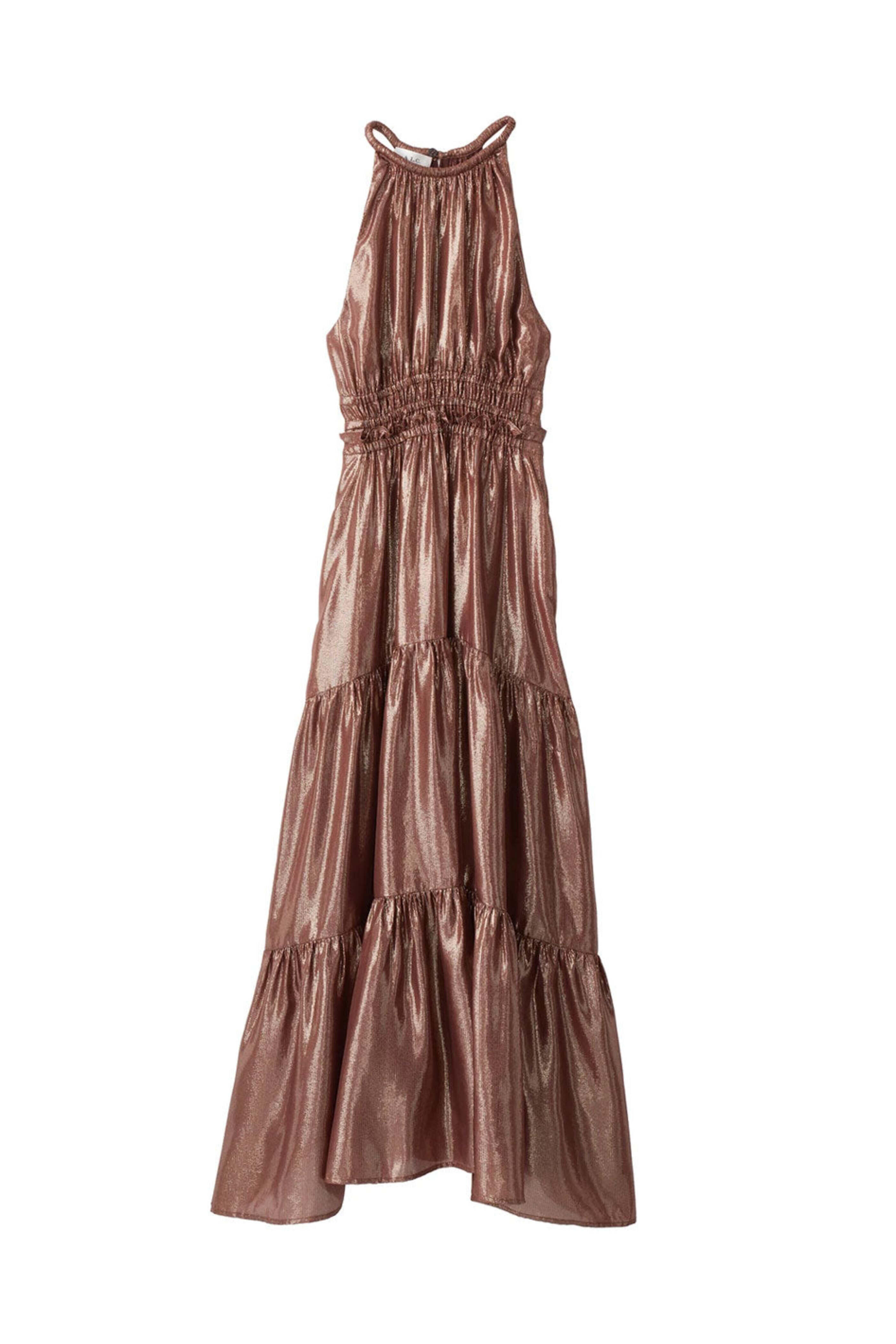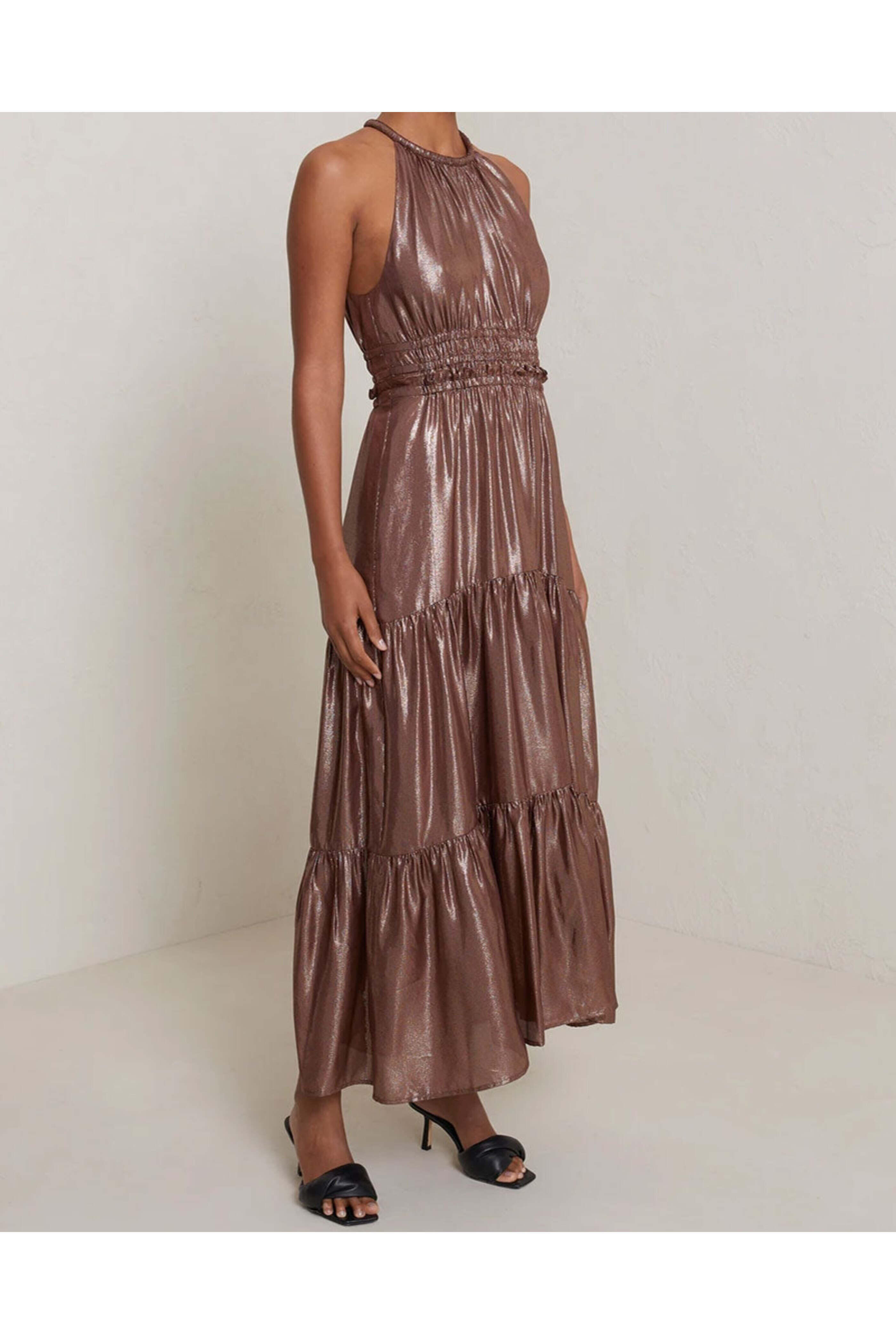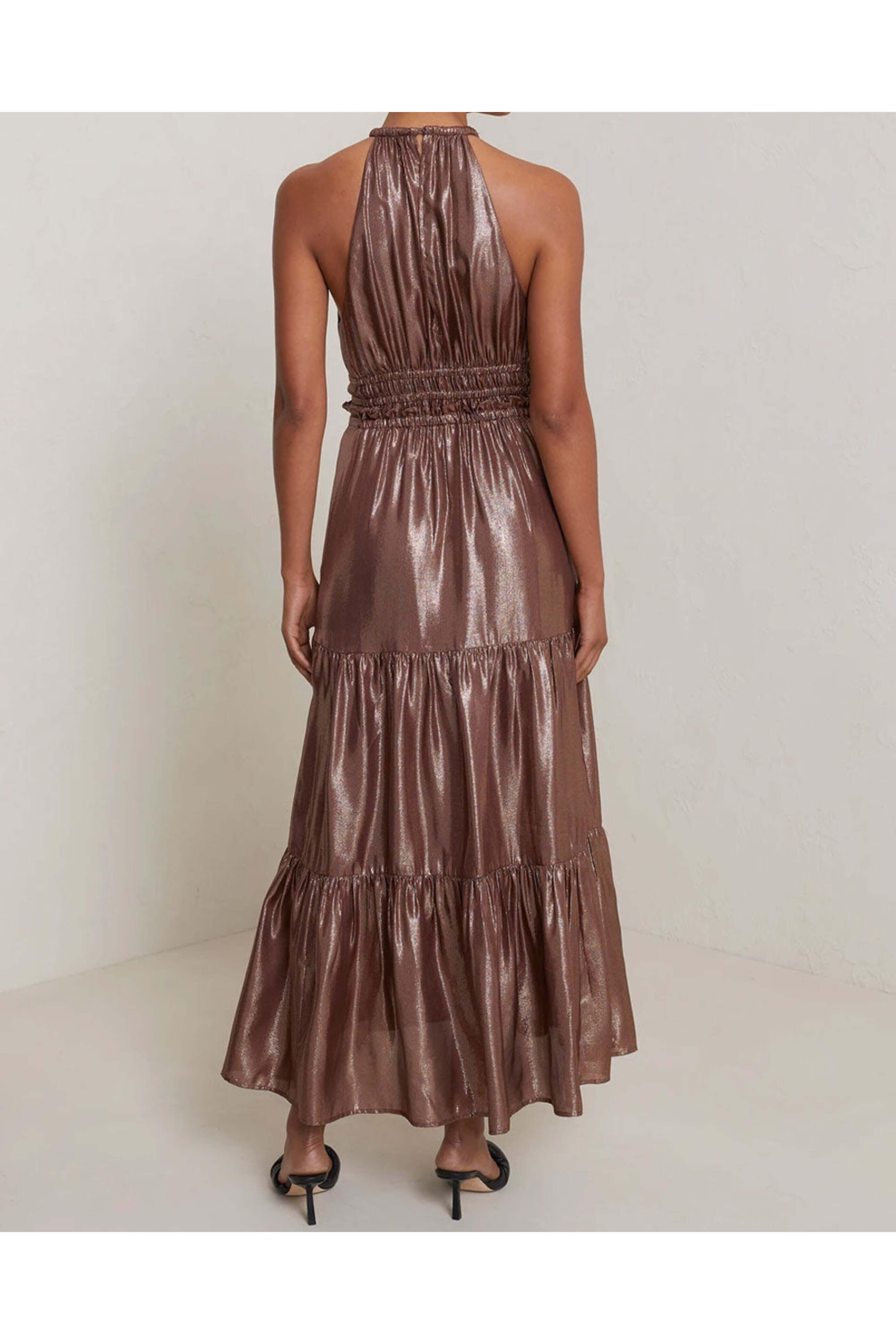 A.L.C. Chocolate Gold Elara Midi Dress. Halter neck. Back button closure; keyhole detail. Sleeveless. Elastic waist. Tiered skirt. Midi to maxi length. Metallic finish. Lined. 83% silk, 17% polyester.