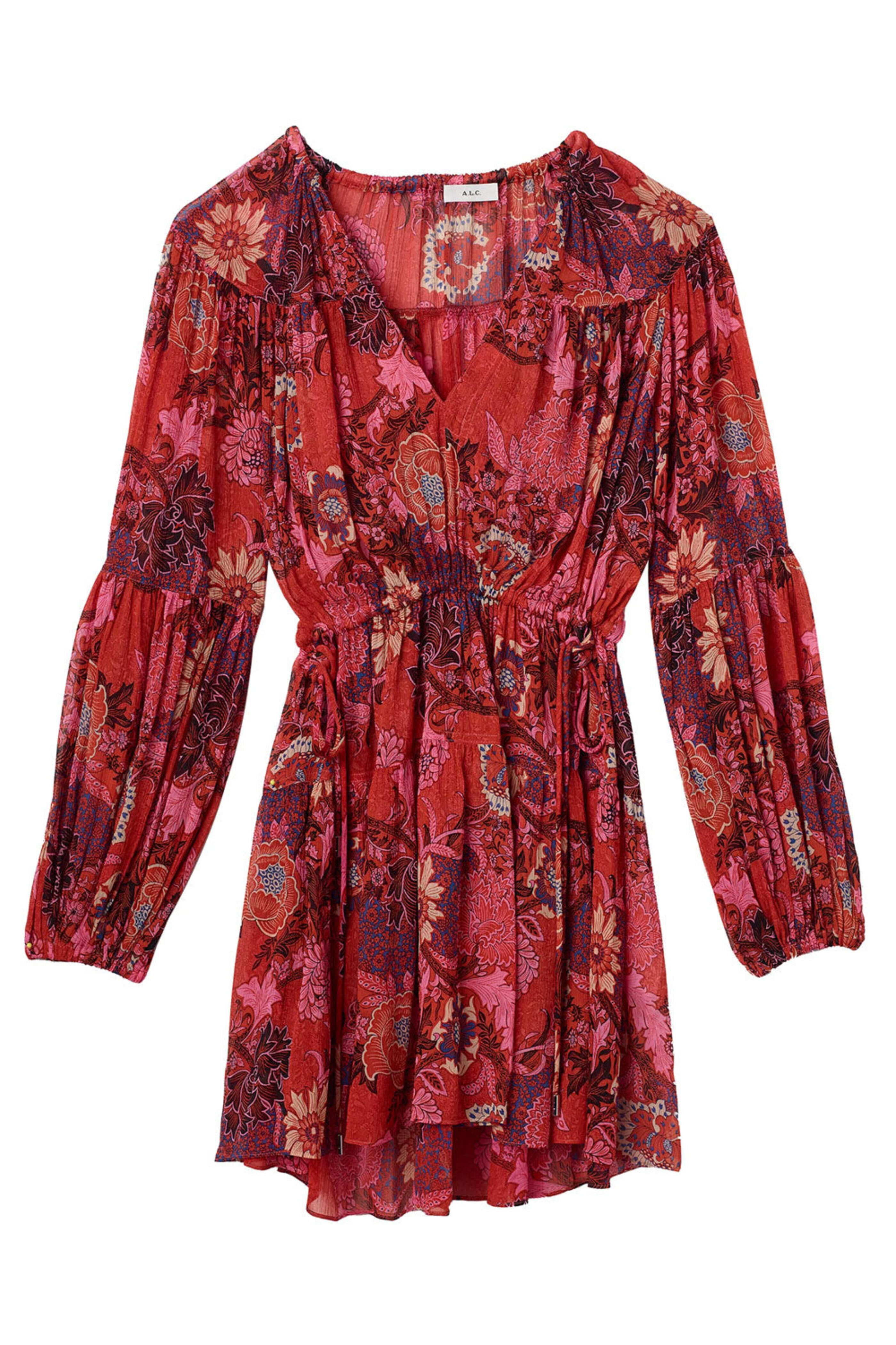 A.L.C. Pink and Russet Floral Elises Mini Dress. Split v neck. Long puff sleeves; elastic cuffs. Self-tie drawstring detail at waist. Crinkled chiffon fabrication. Mini length. Lined. 100% silk outer, 100% polyester lining.