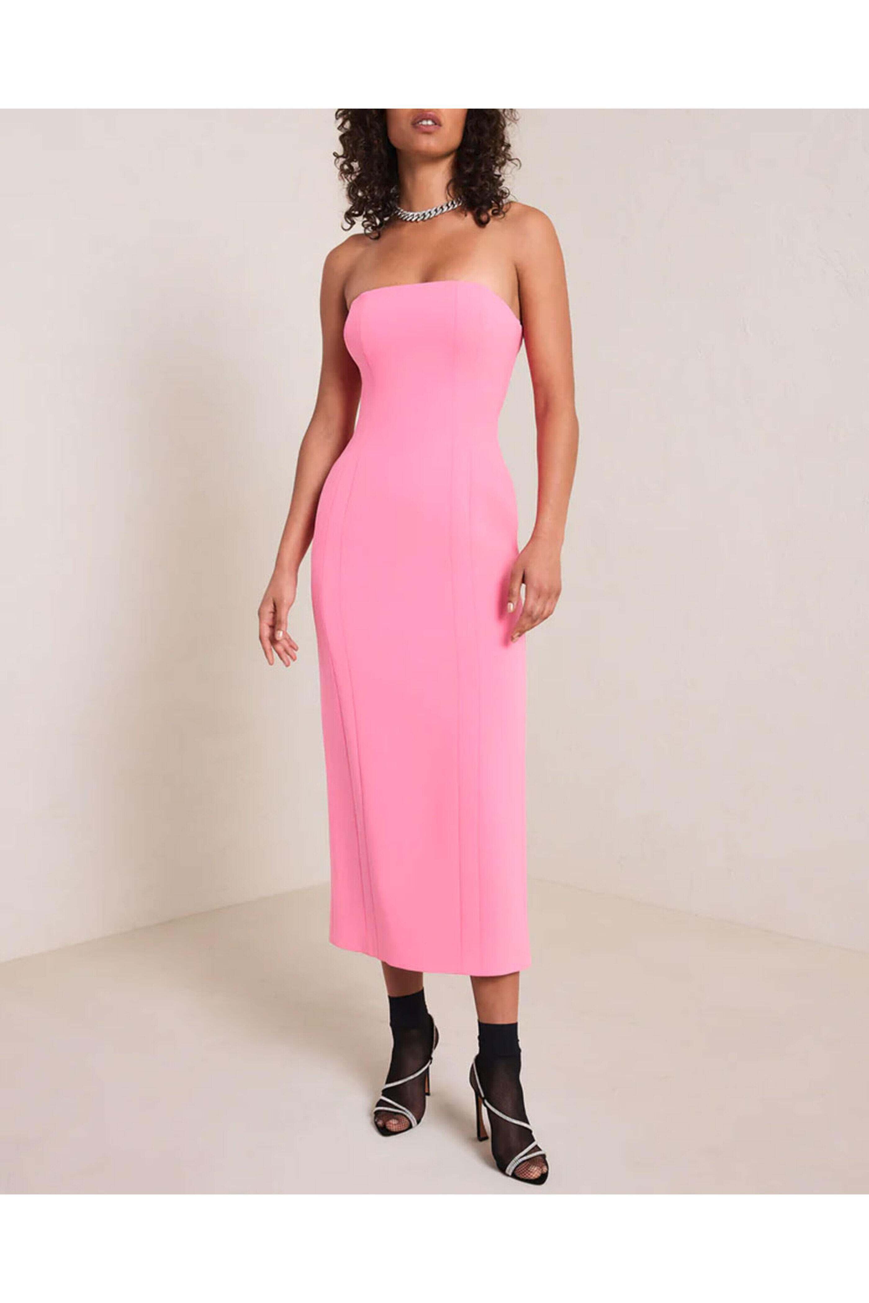 A.L.C. Grapefruit Elizabeth Strapless Midi Dress. Strapless. Concealed side zip closure. Side slit pockets. Darted seam detail. Interior corset seams. Vented back. Midi length. Slit at center back hem. Slim fit. Lined. 70% Triacetate, 30% Polyester.
