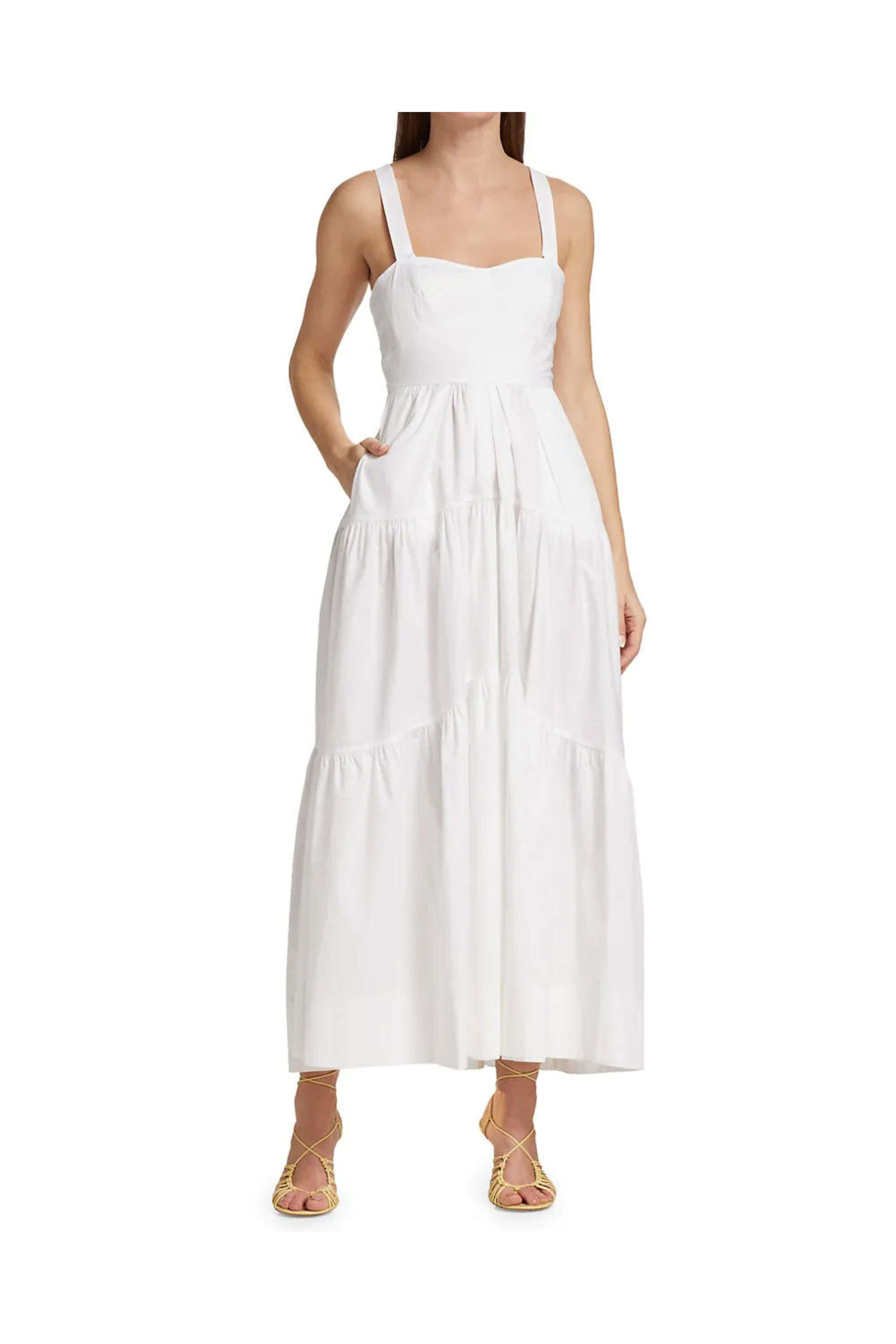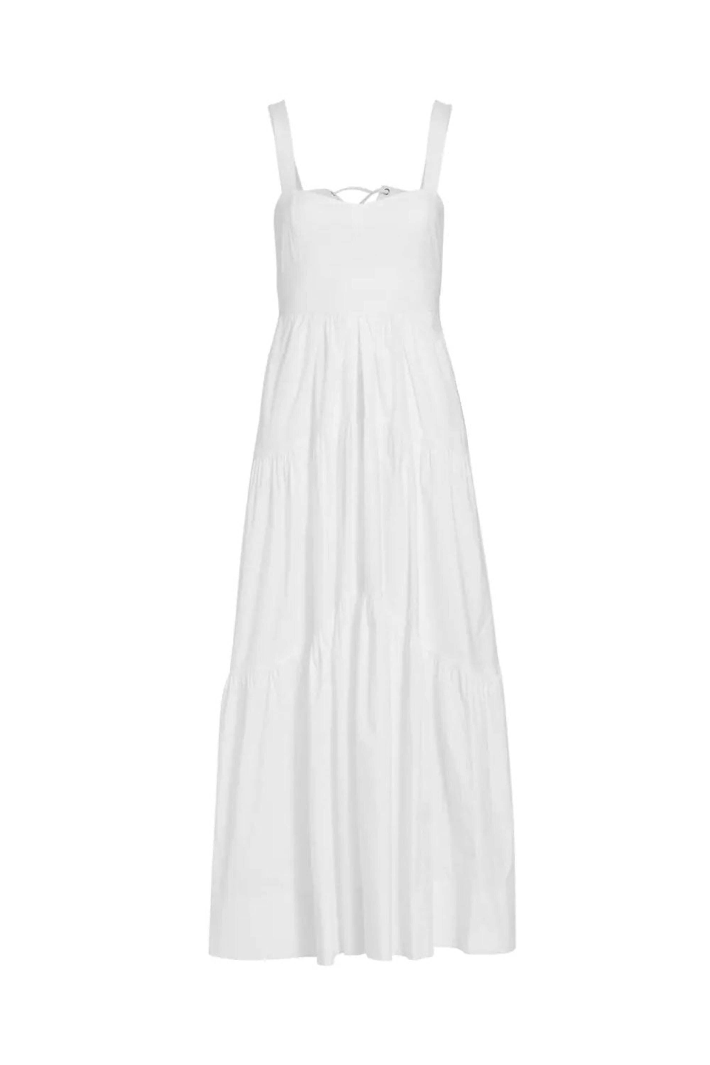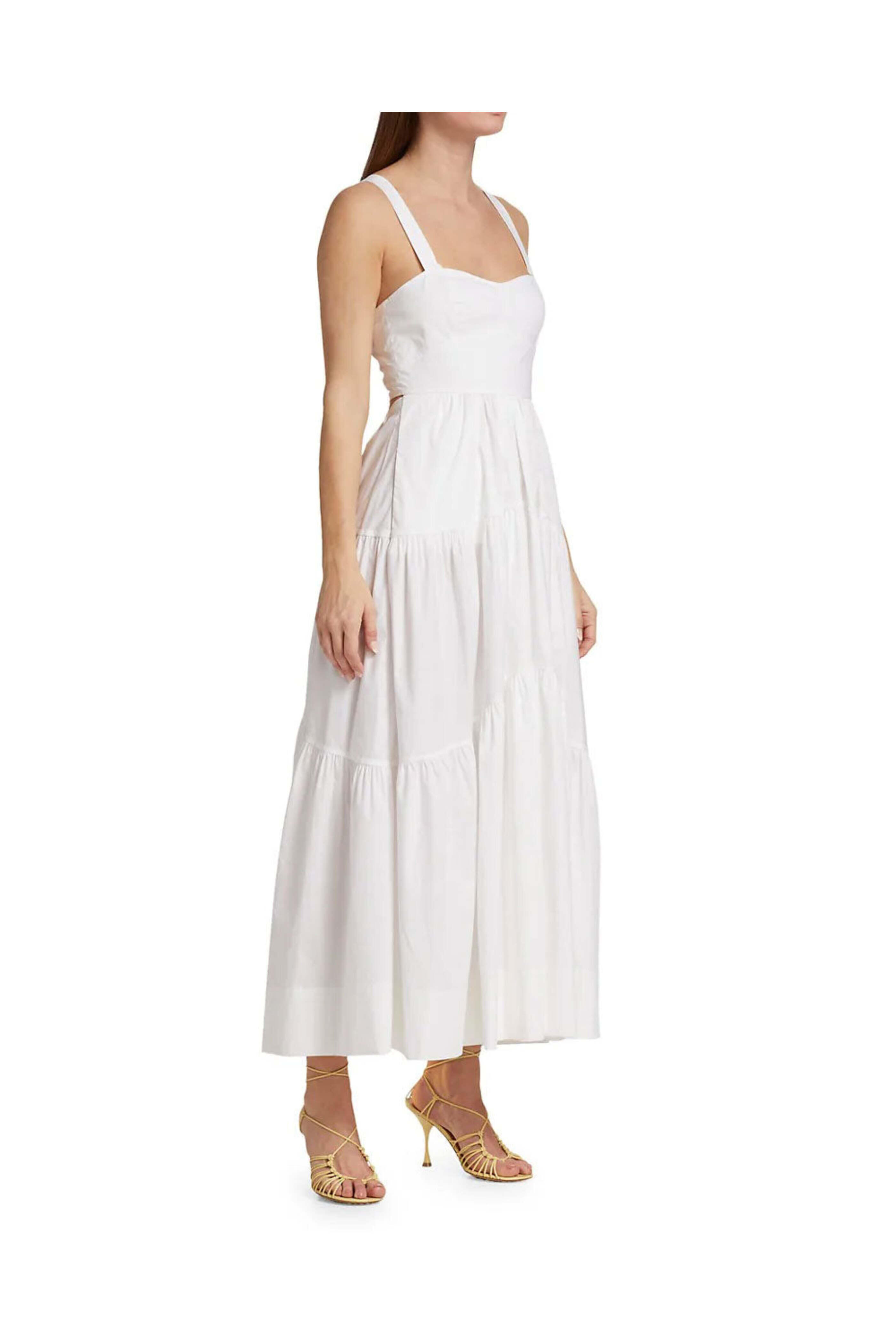 A.L.C. White Lily Dress. Sweetheart neckline. Sleeveless. Cutout open back with lace up detailing. Side zip. Midi length. Tiered midi skirt. Bustier-inspired bodice. Unlined. Imported. 100% cotton.