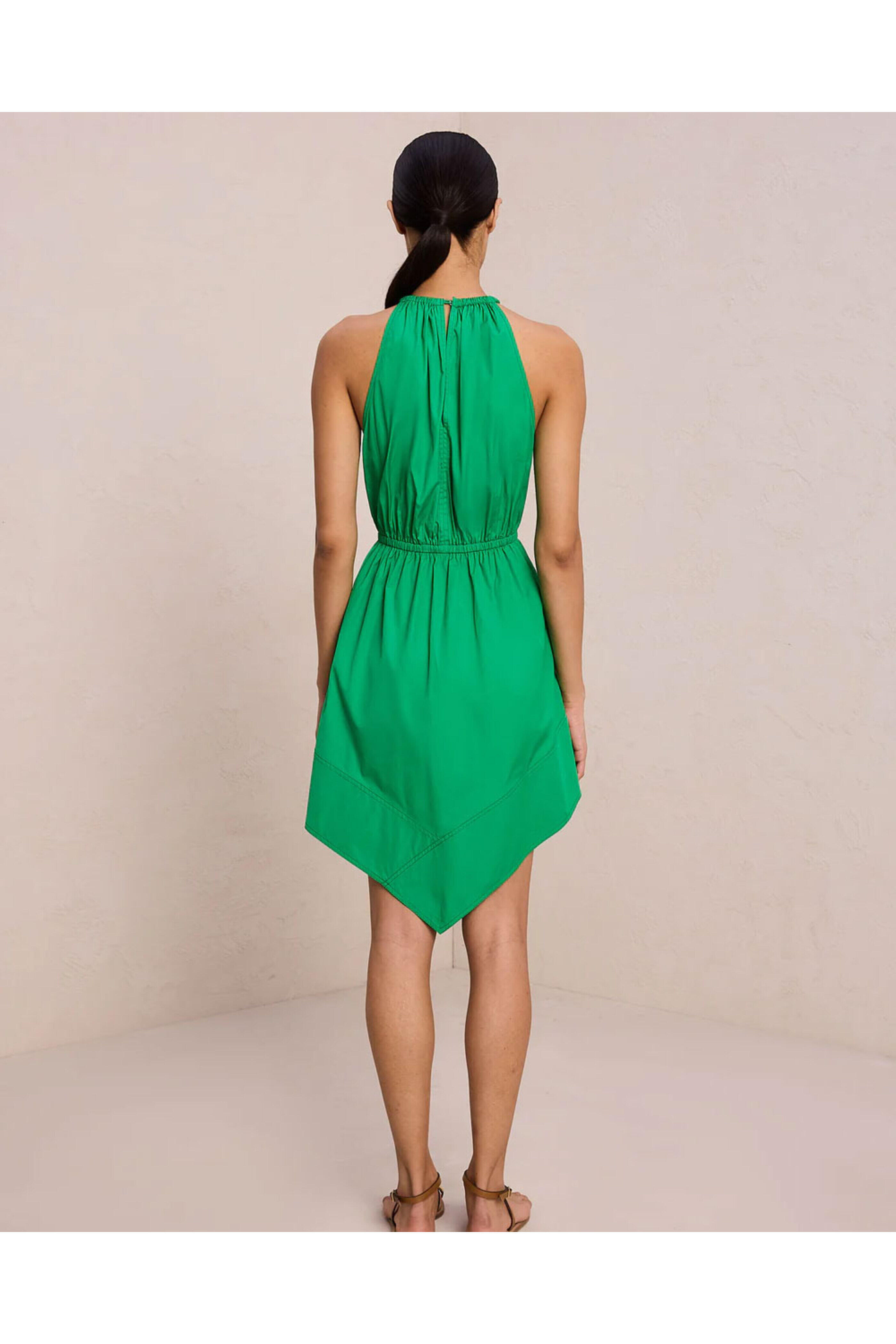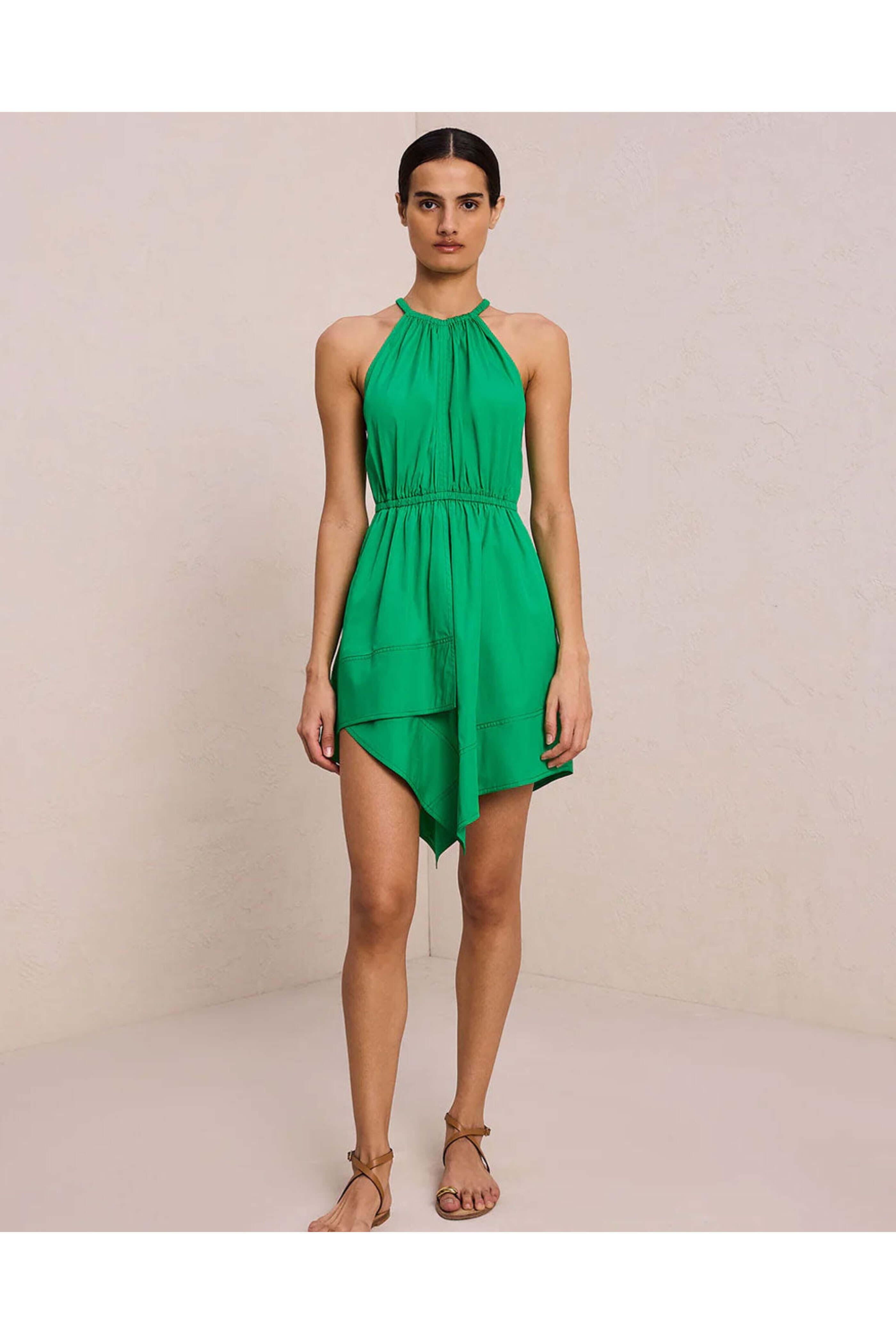 A.L.C Olympia Cotton Mini Dress. Halter neckline. Sleeveless. Asymmetric handkerchief hemline. Elasticized waist. 100% cotton.