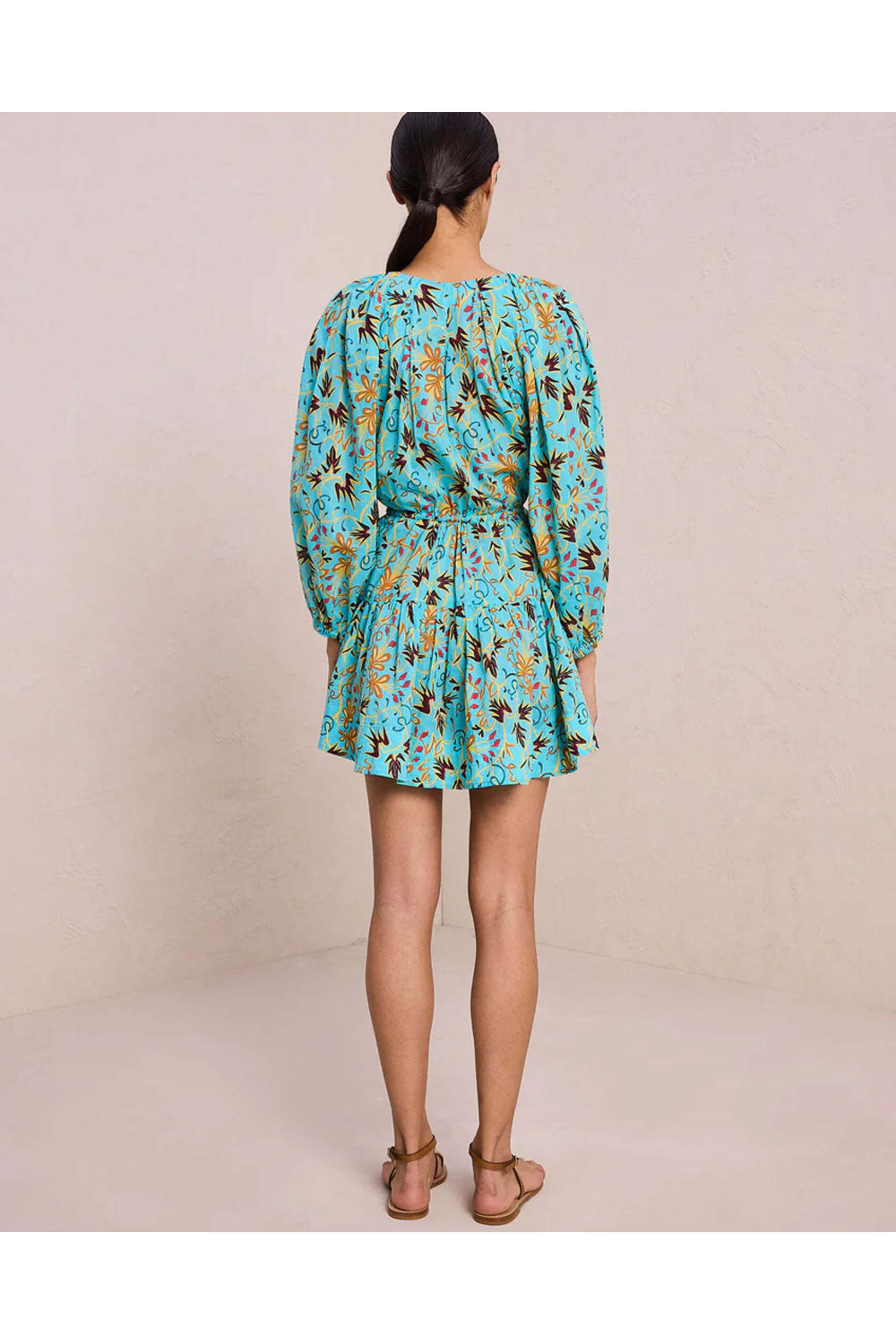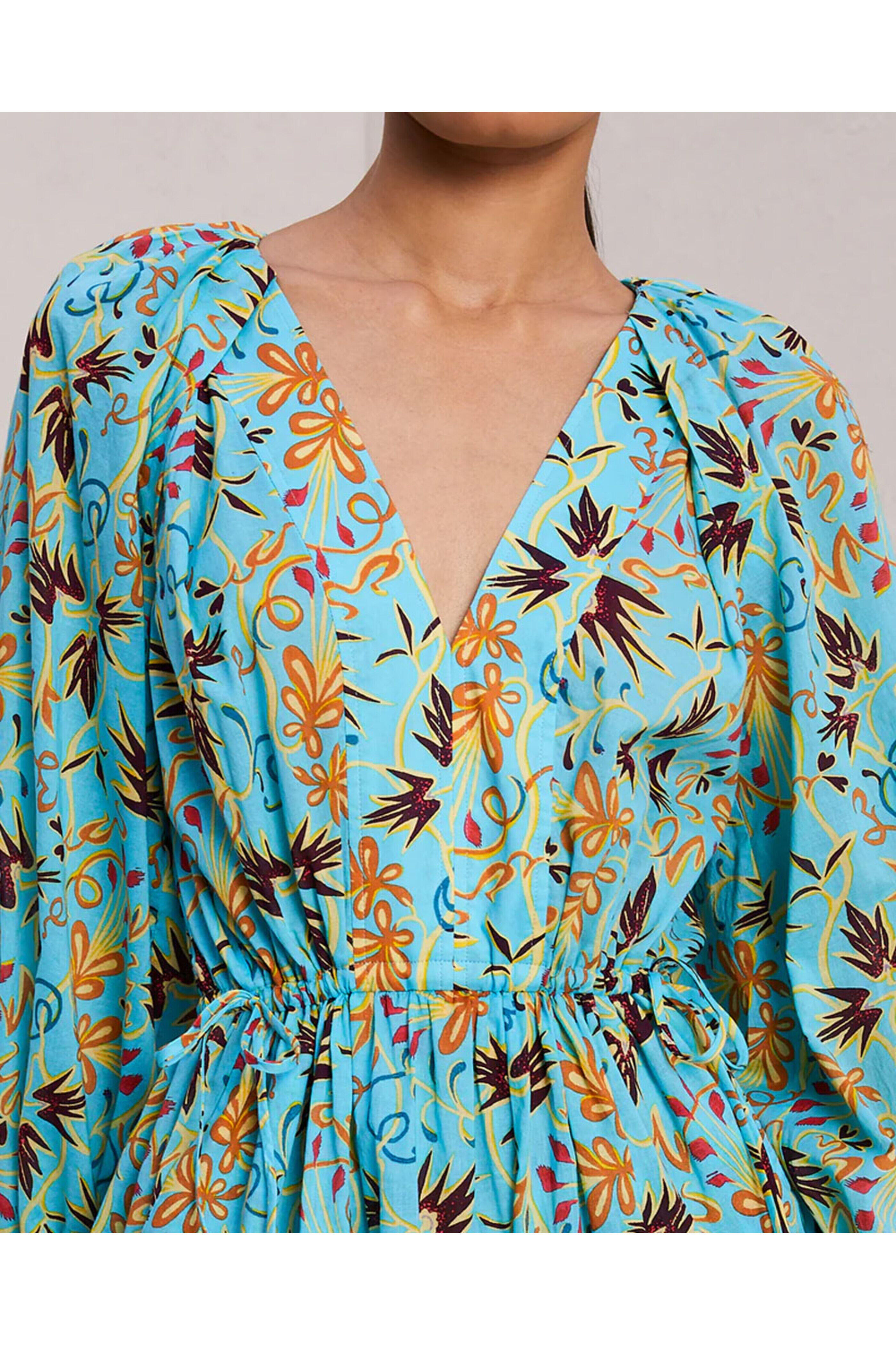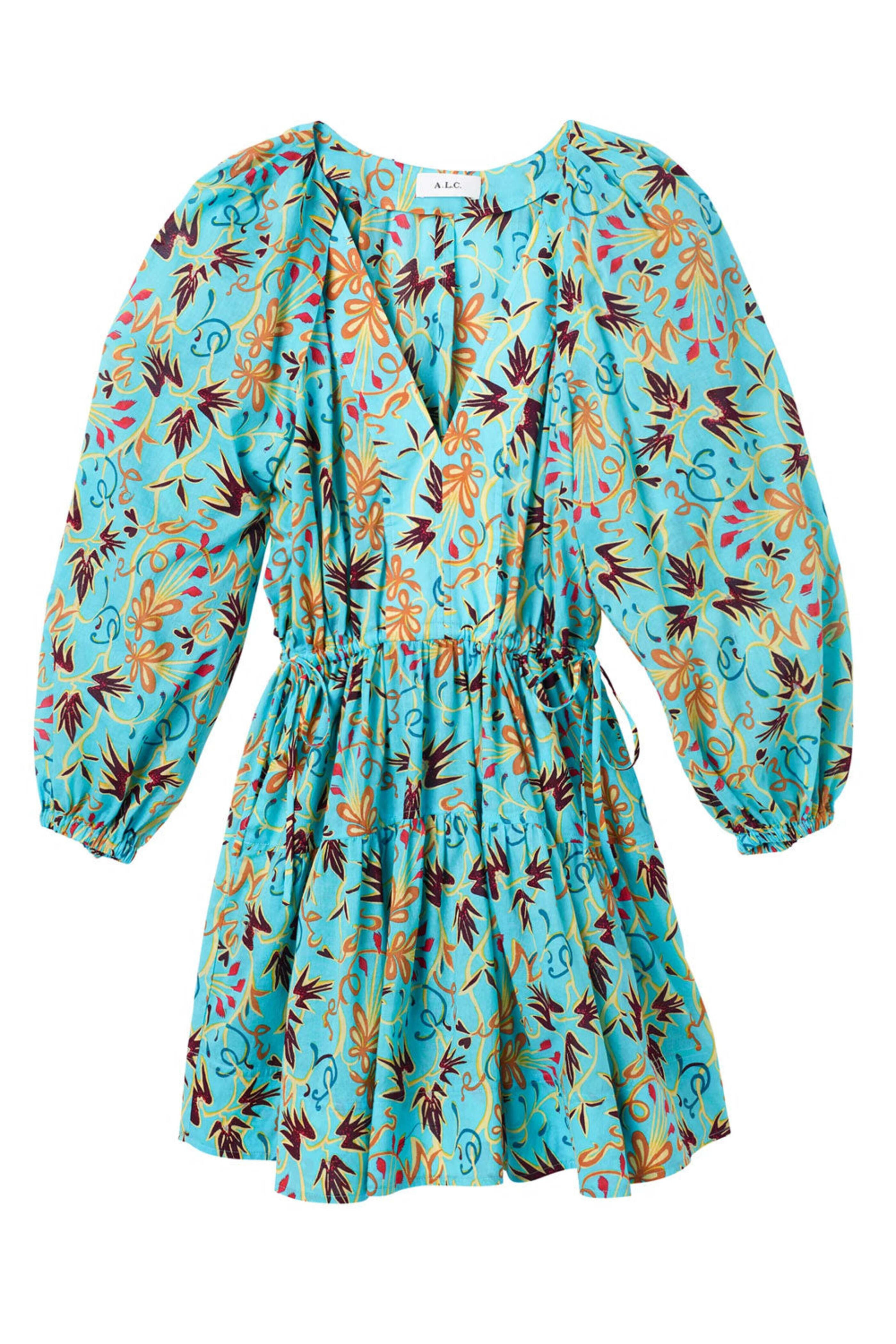 A.L.C. Grotto Sally Dress. V-neck. Three-quarter-length balloon sleeves, elasticized cuffs. Pullover style. Mini length. On-seam hip pockets. Drawstrings at sides of waist. A-line silhouette. Tiered skirt. Abstracted floral print. Imported. 100% cotton.