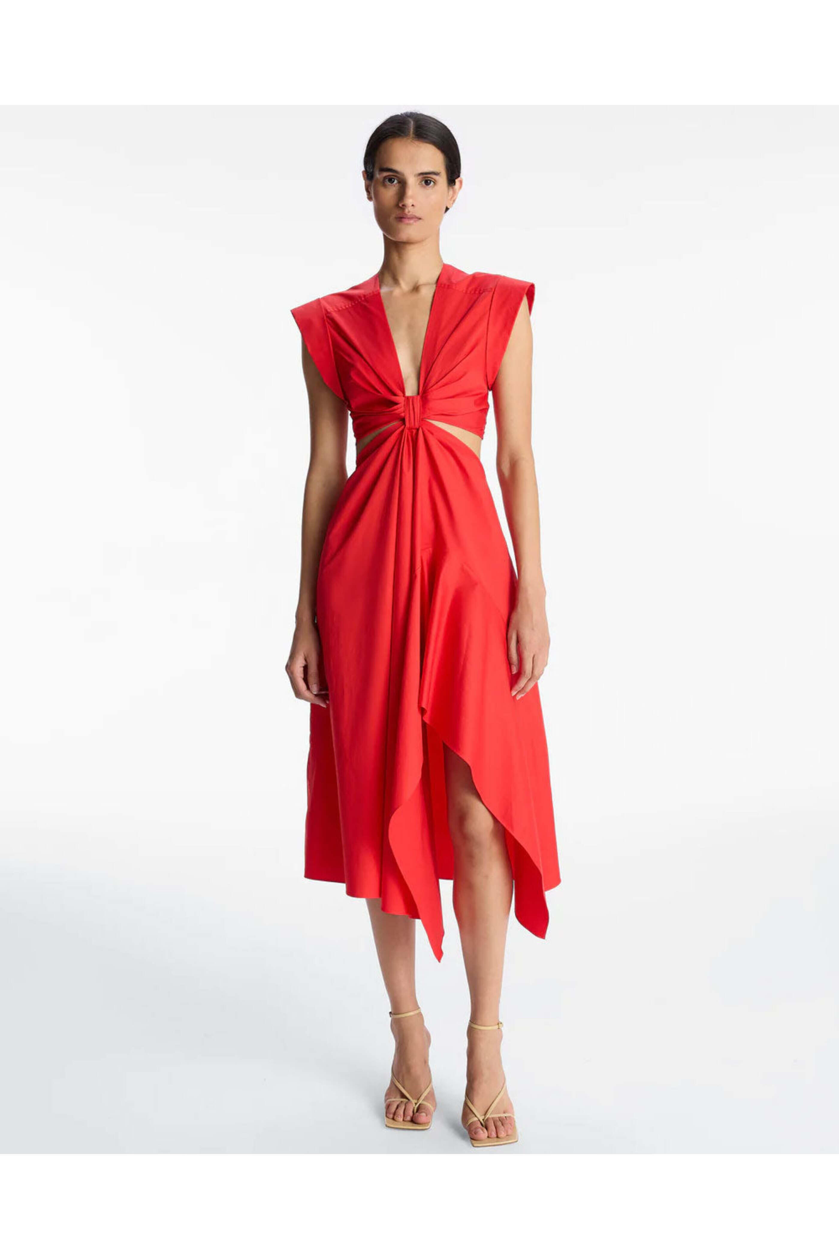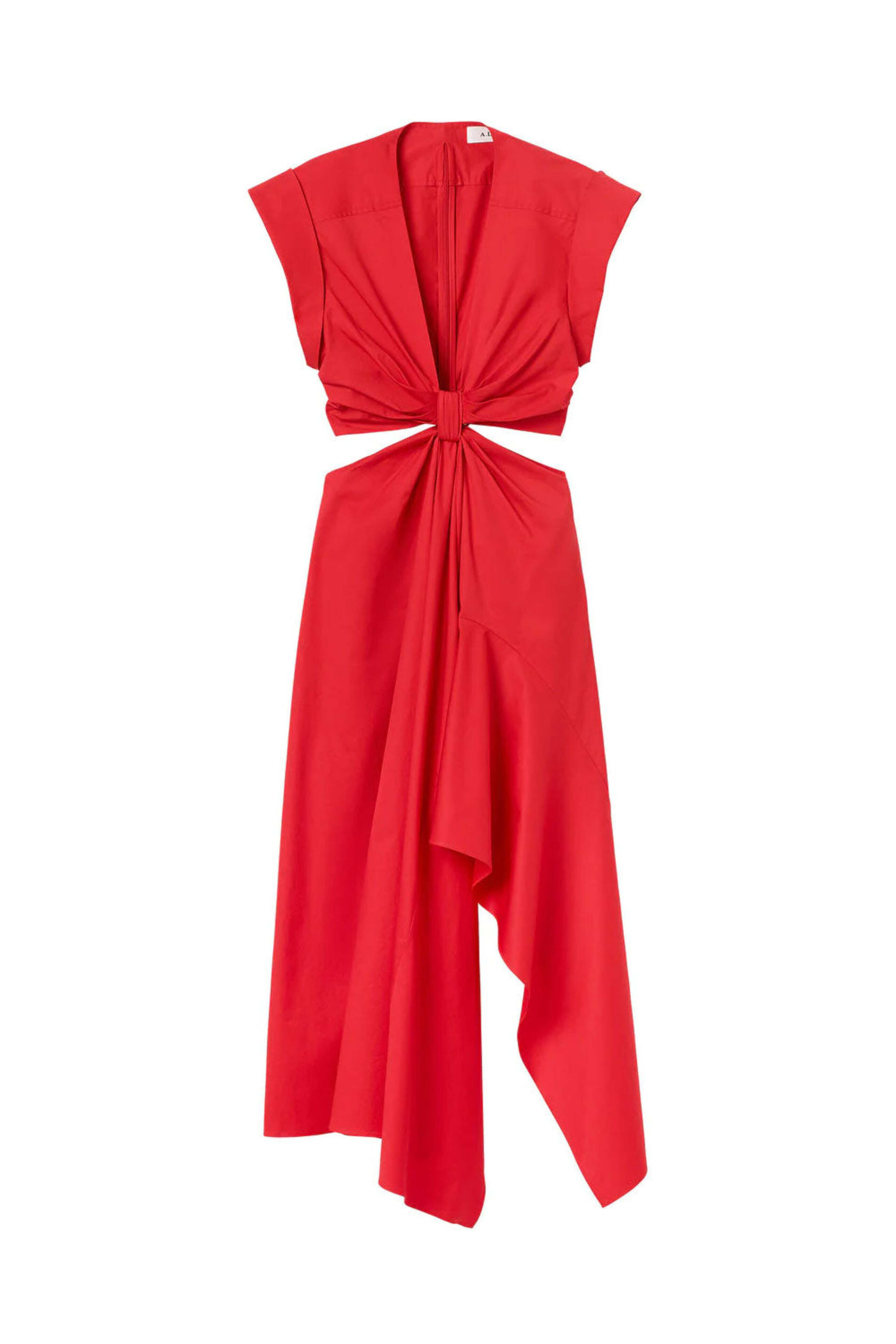 A.L.C. Ruby Alessia Dress. Plunging neckline; knot detail. Cap sleeves. Concealed back and side zip closures. Cutout detail at side. Midi length. Curved hemline. Relaxed fit through skirt. Unlined. Imported. 100% cotton.