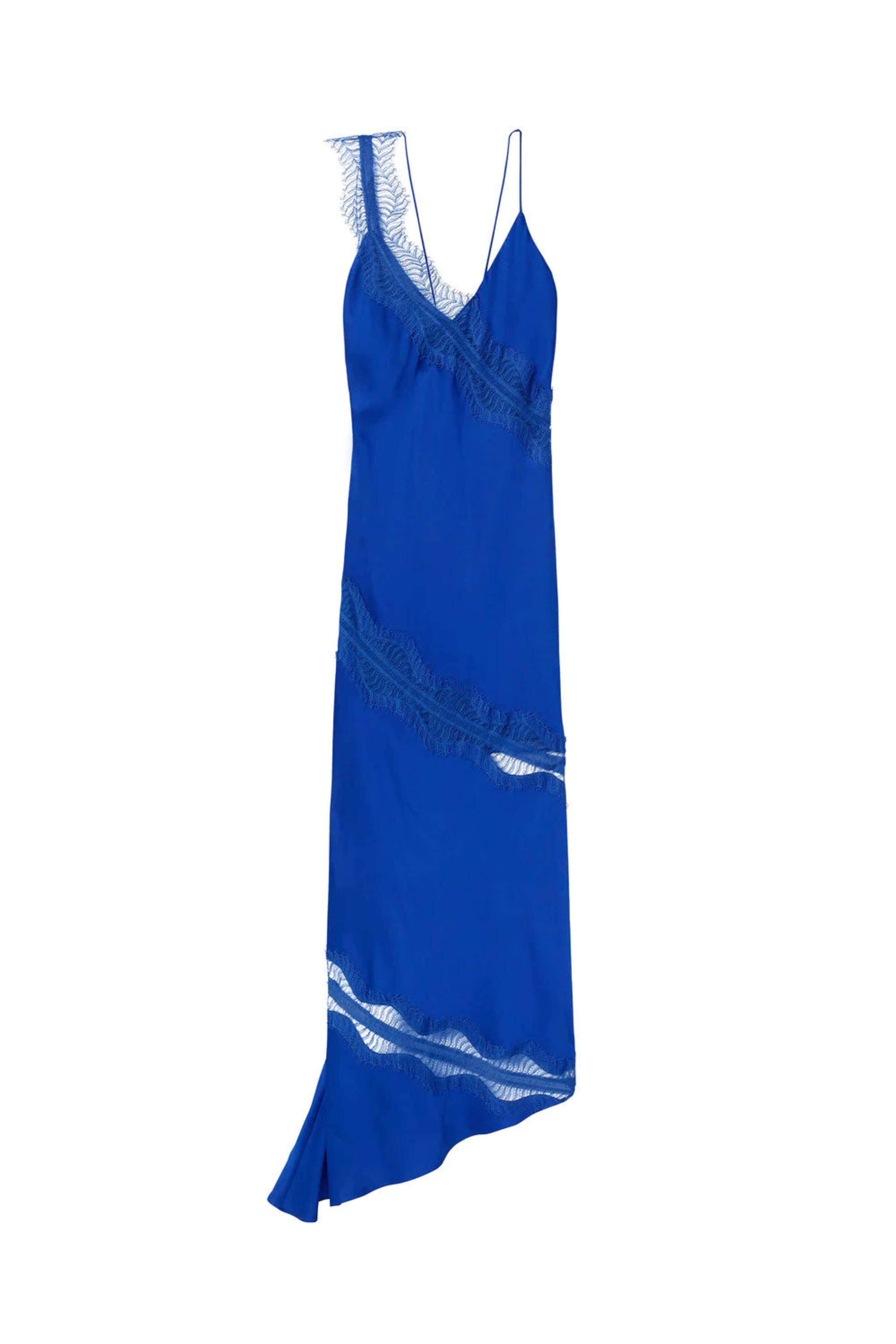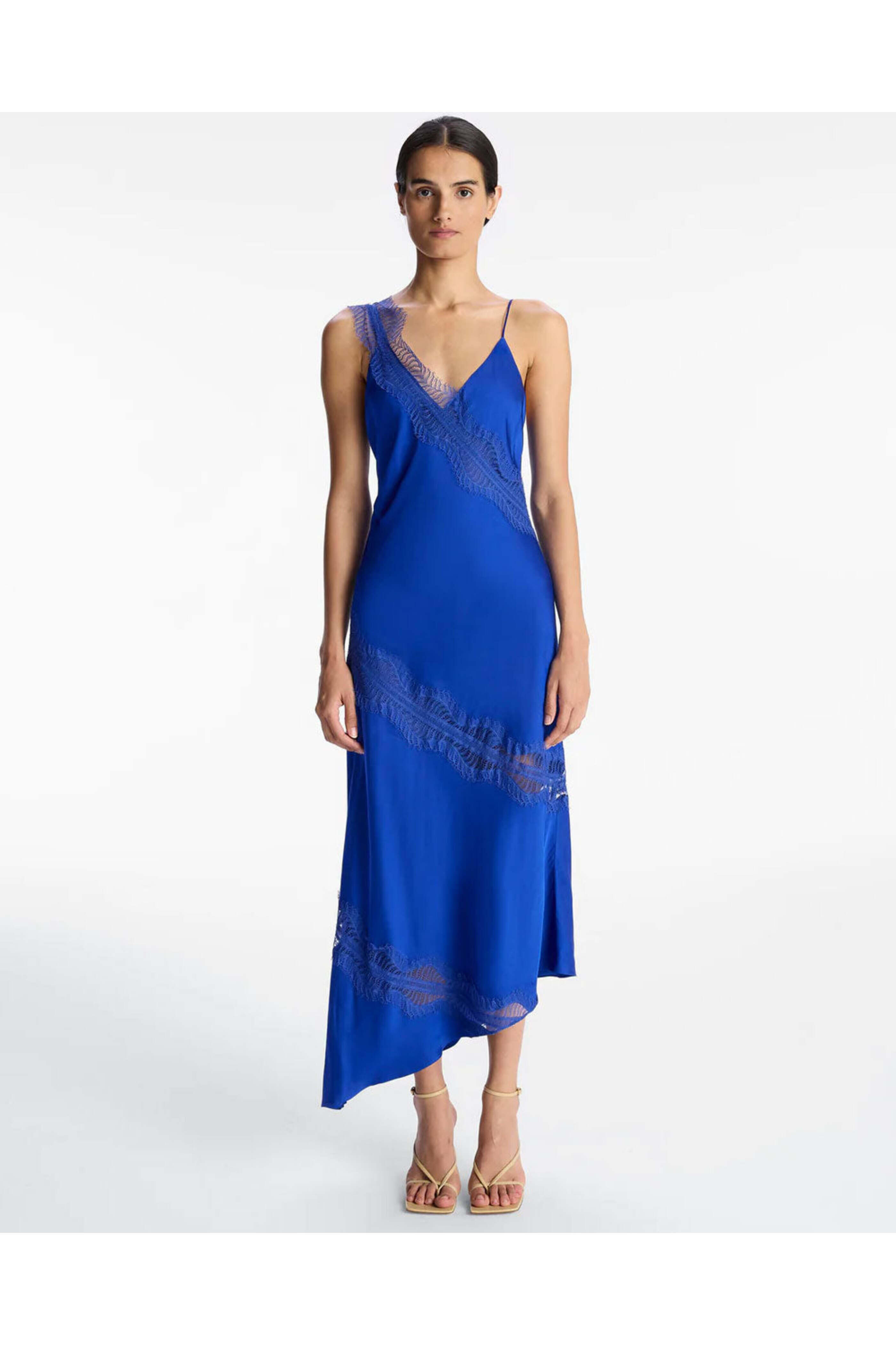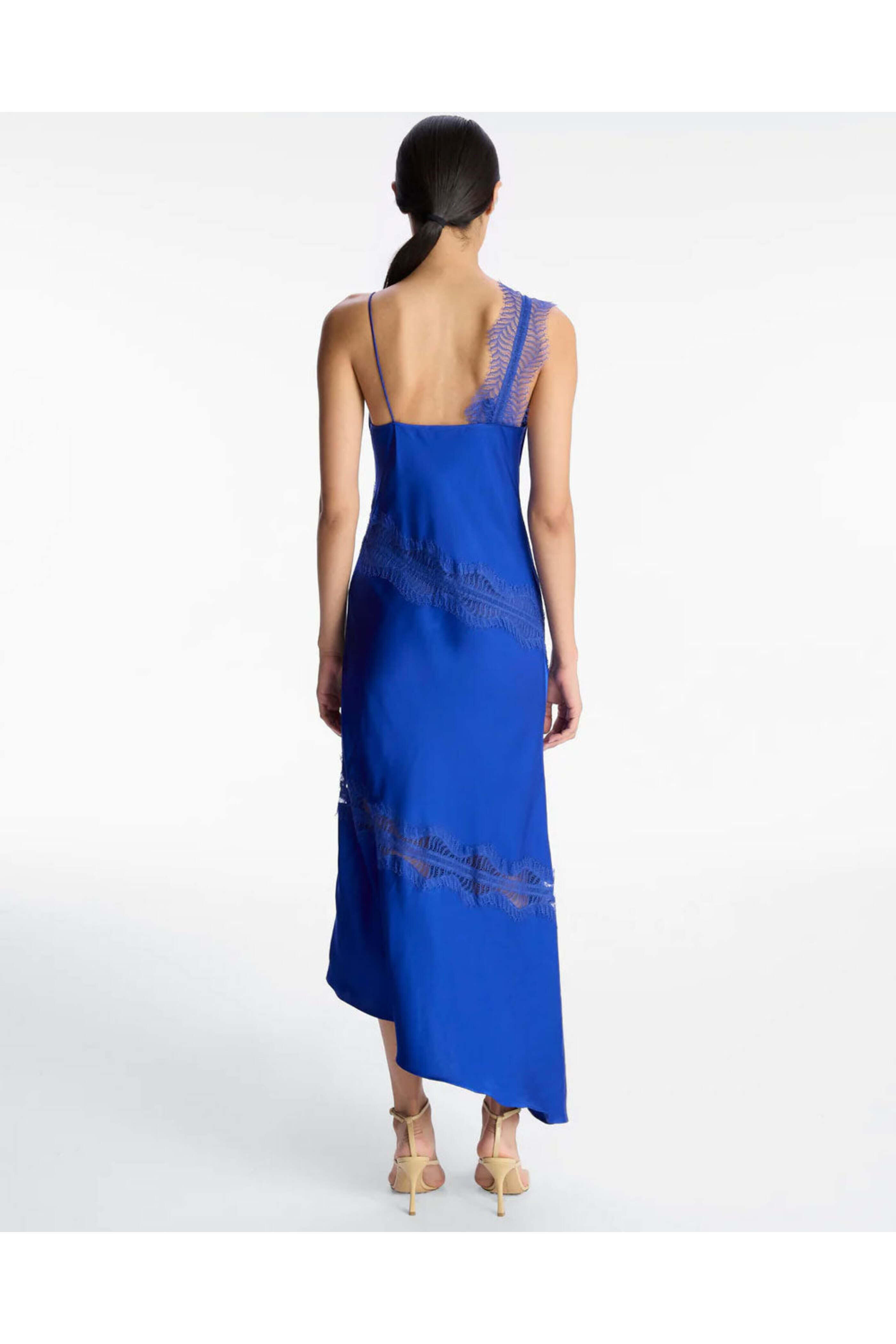A.L.C. Regal Soeil Dress. V-neck. Sleeveless. Asymmetrical eyelash lace-trimmed cutout detail that encircles the body. Slip on. Midi length. Slip silhouette. Relaxed fluid fit. Viscose outer, polyester lining. Imported.
