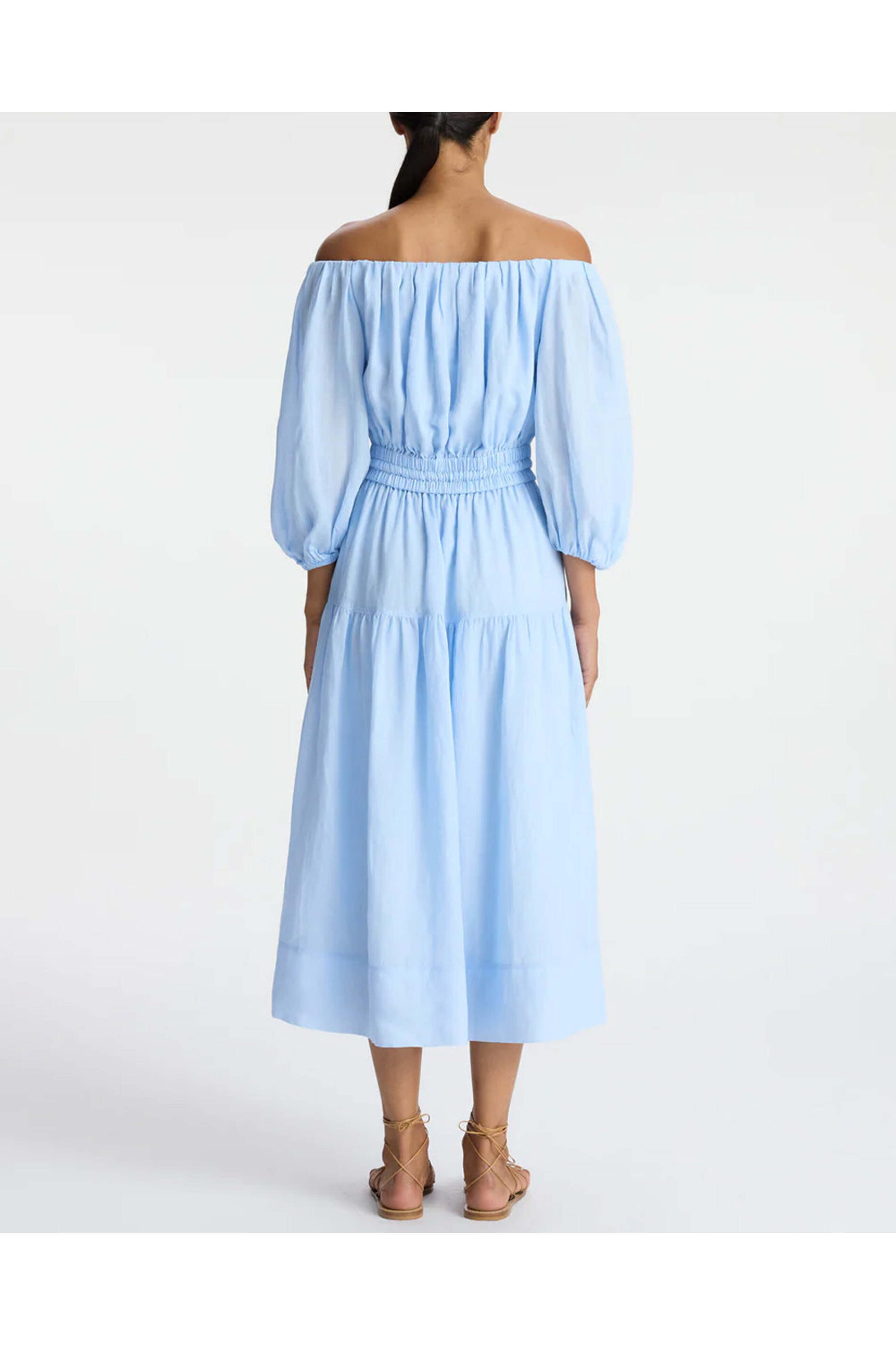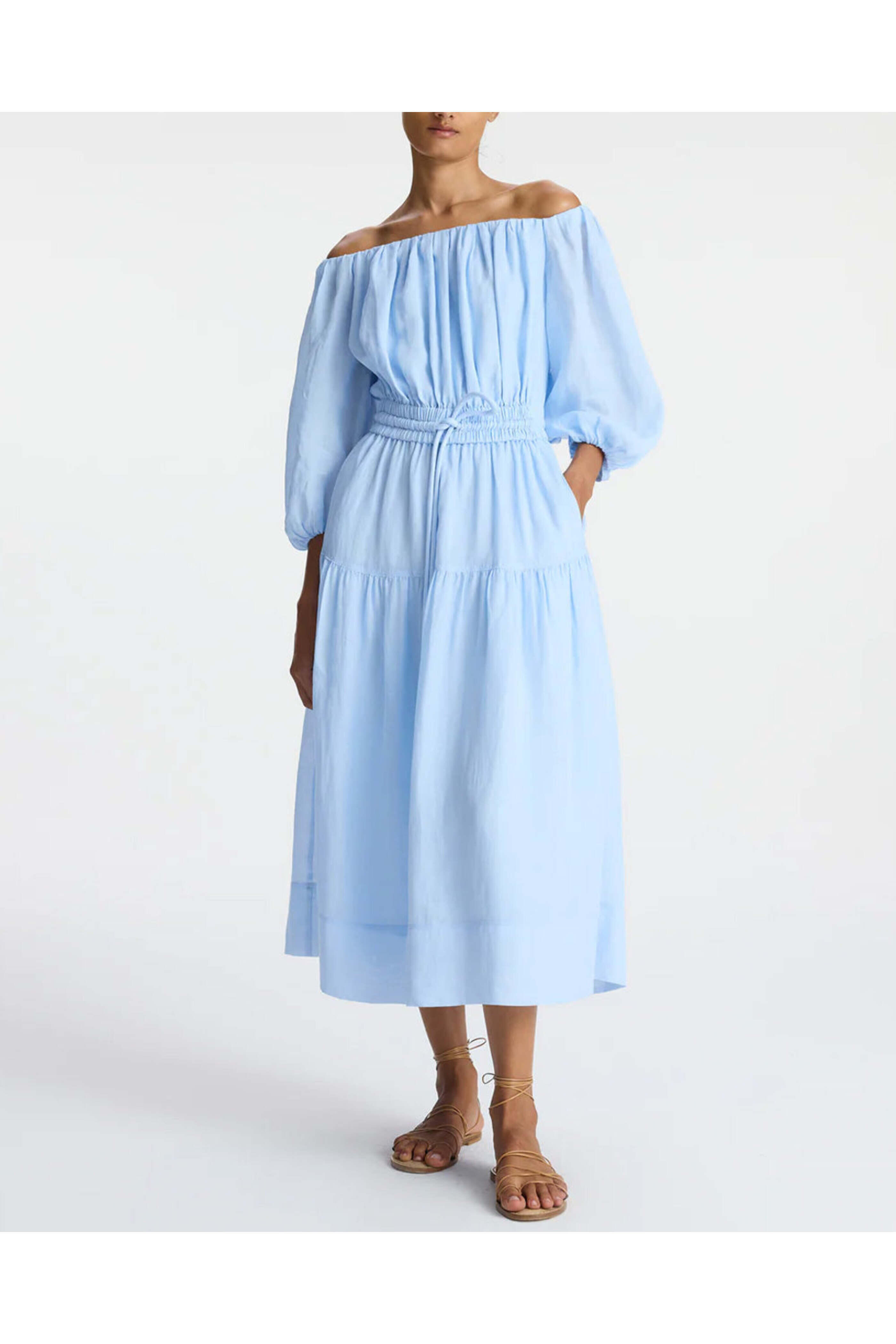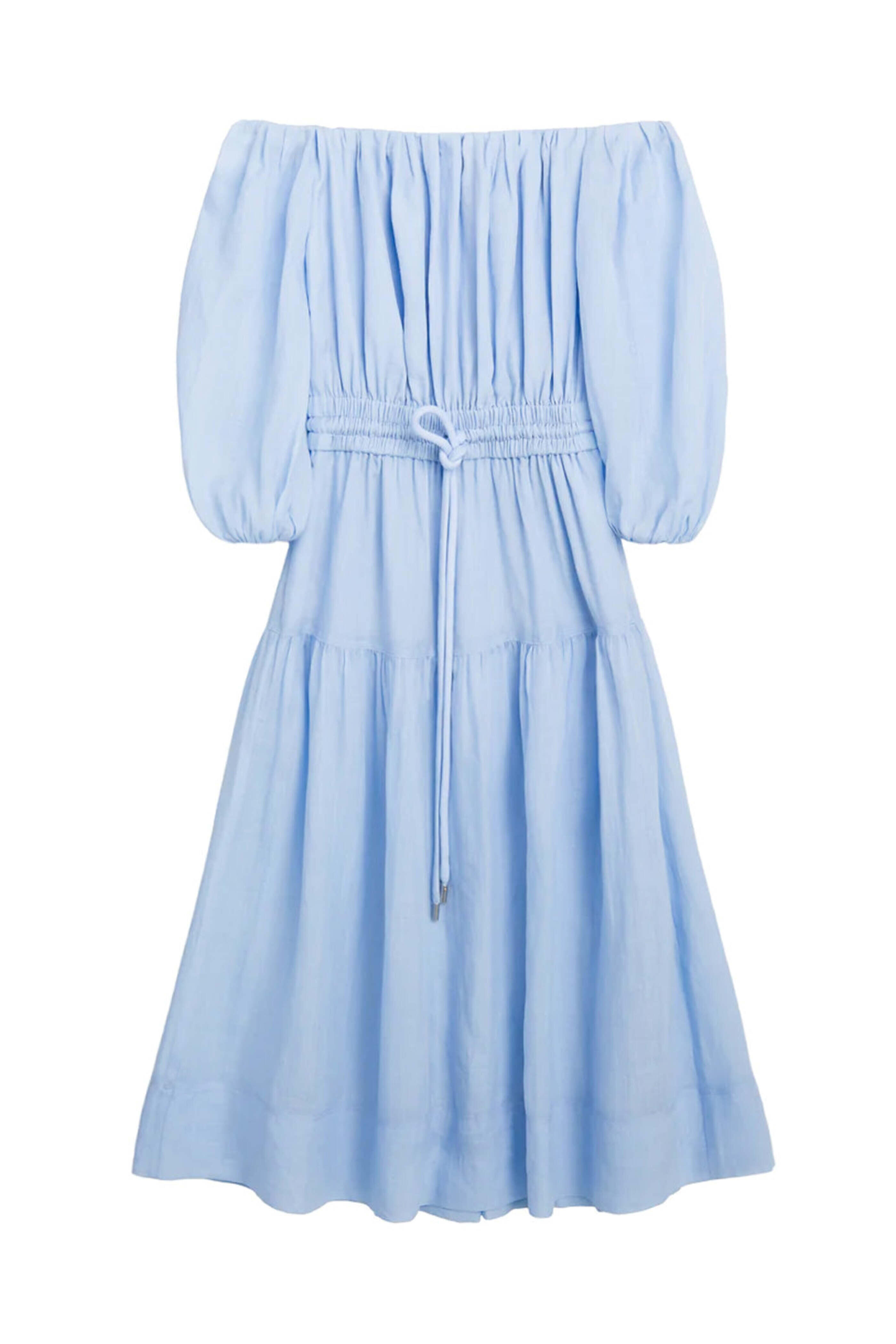 A.L.C. Sky Blue Off The Shoulder Indy Dress. Off the shoulder neckline. ¾ length puff sleeves; elastic cuffs. Elastic drawstring waist. Side slip pockets. Tiered silhouette. Midi length. Lined. 100% ramie outer, 100% cotton lining.