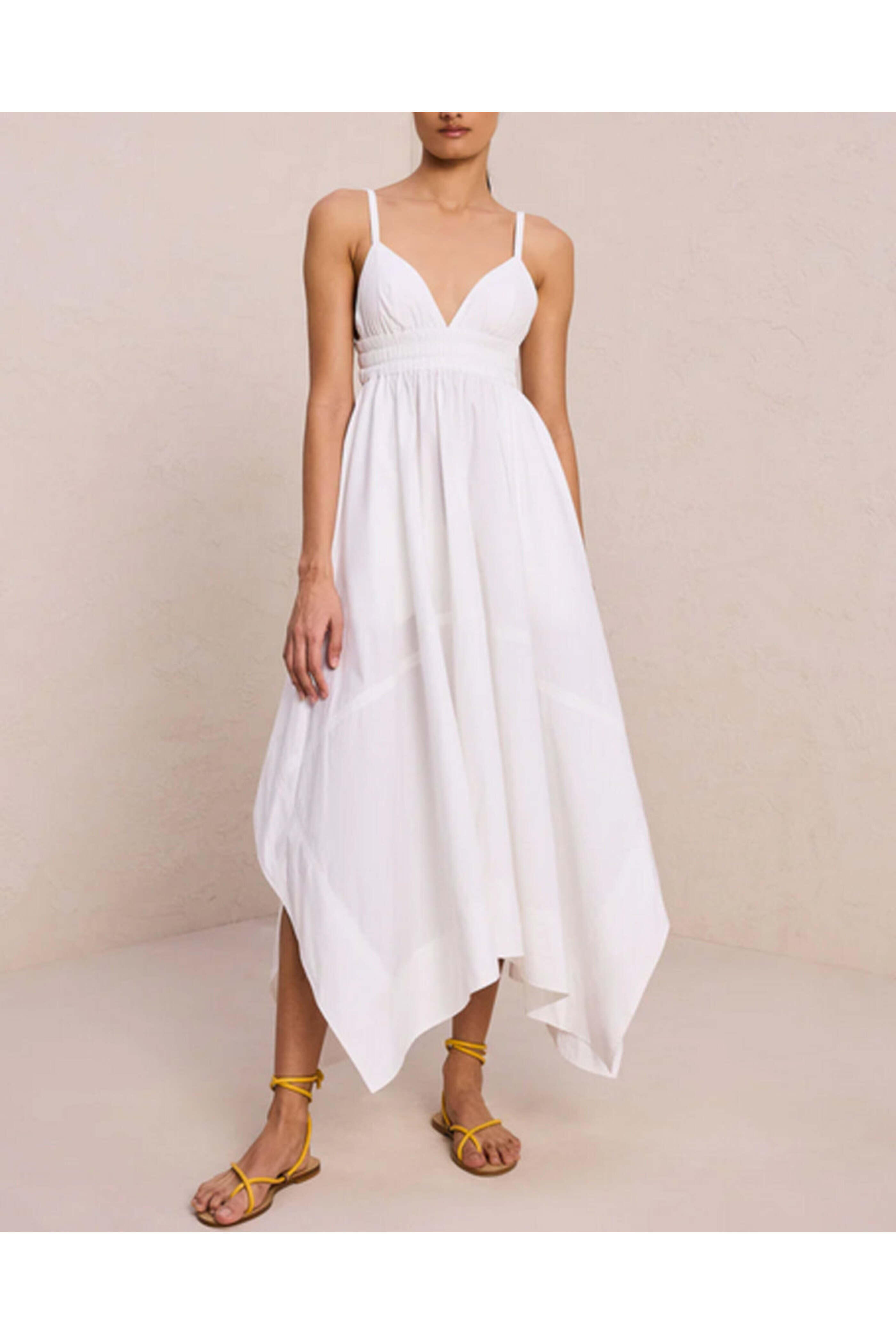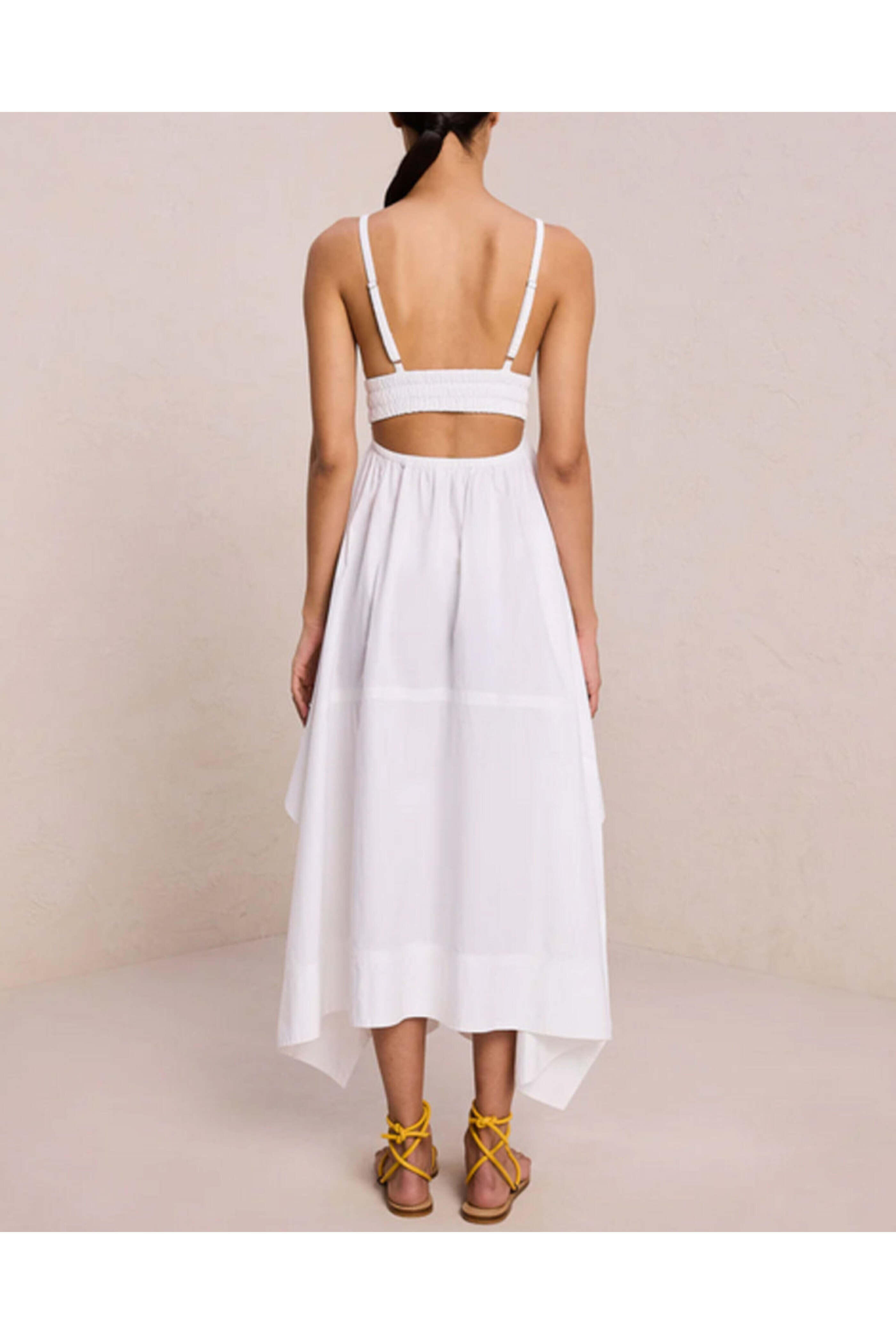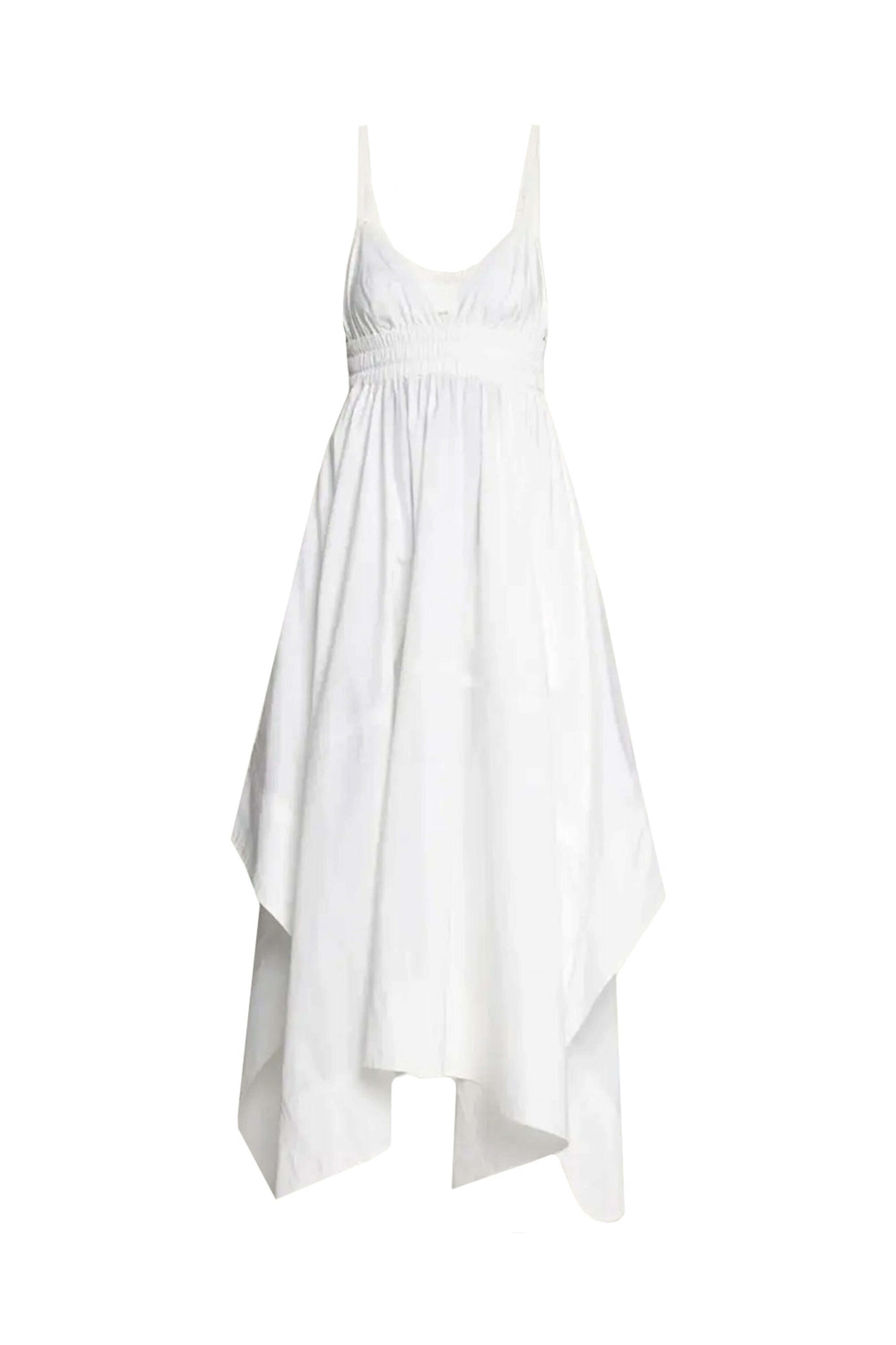 A.L.C. White Rosie Dress. V neck. Square back. Sleeveless. Elastic waist. Low back cutout. Side slip pockets. Handkerchief hem. Midi length. 100% cotton.