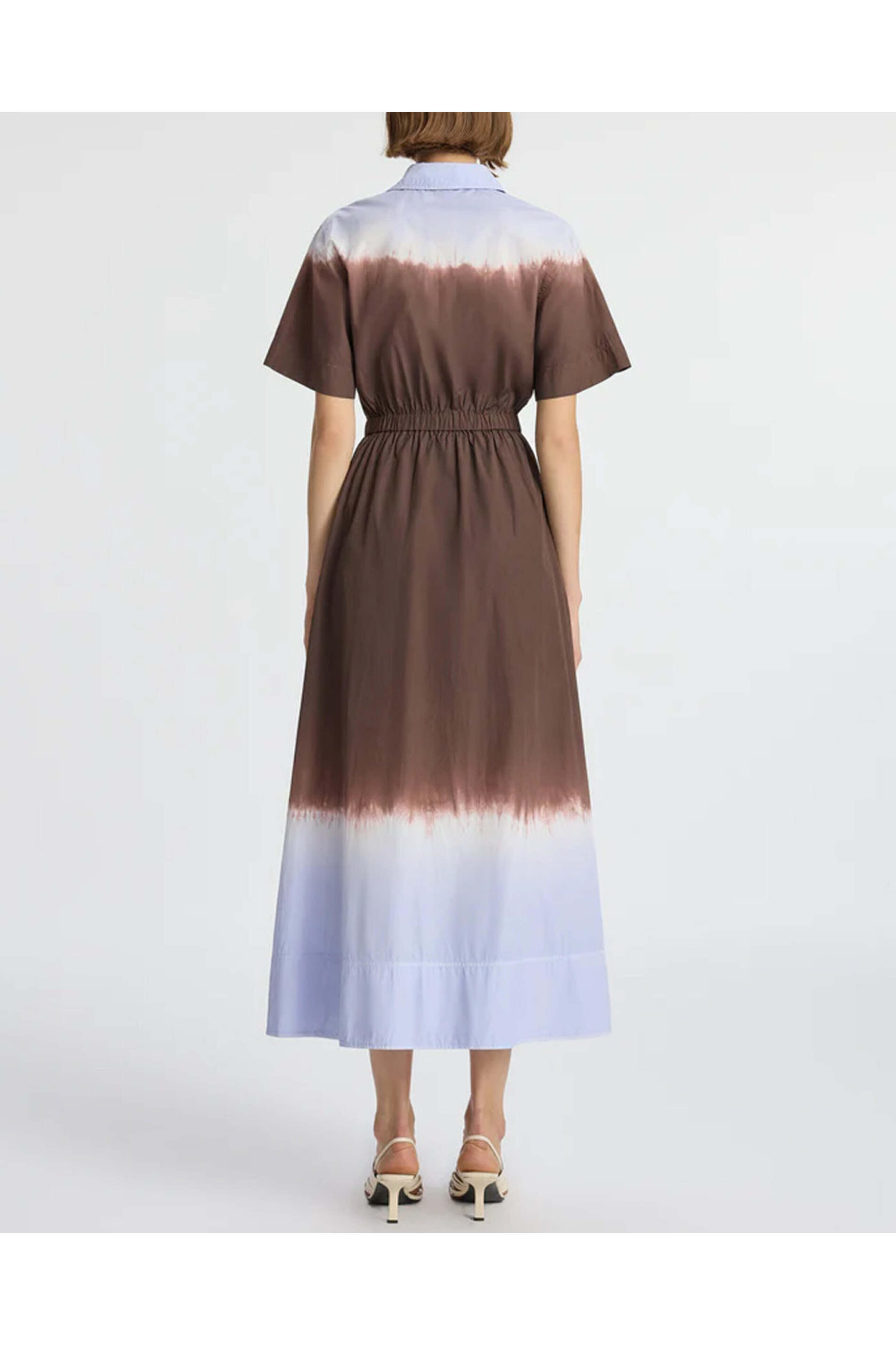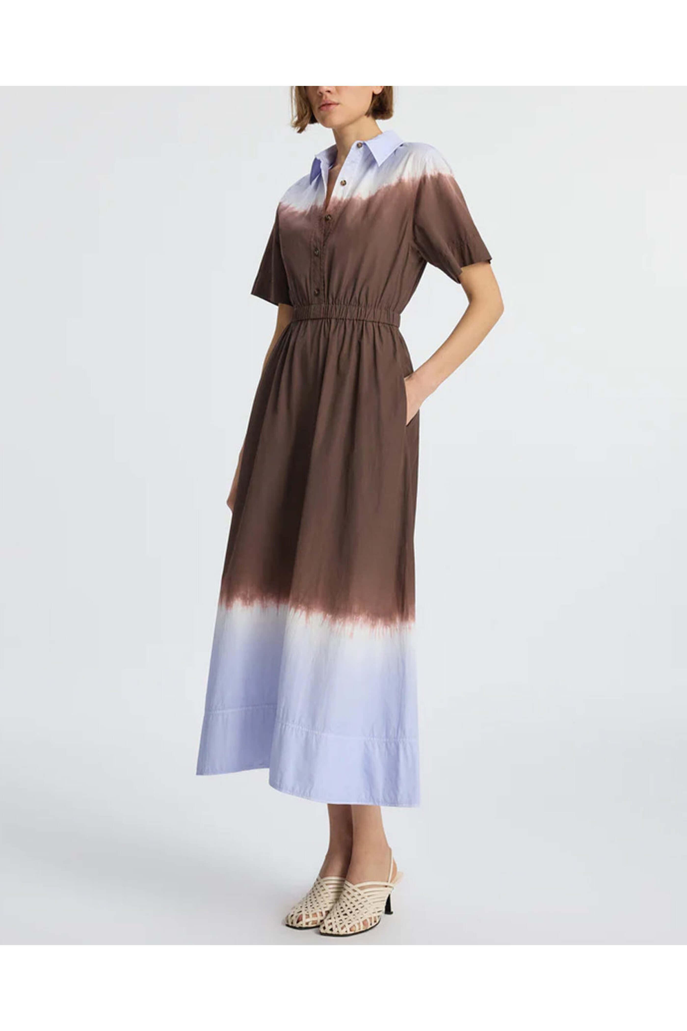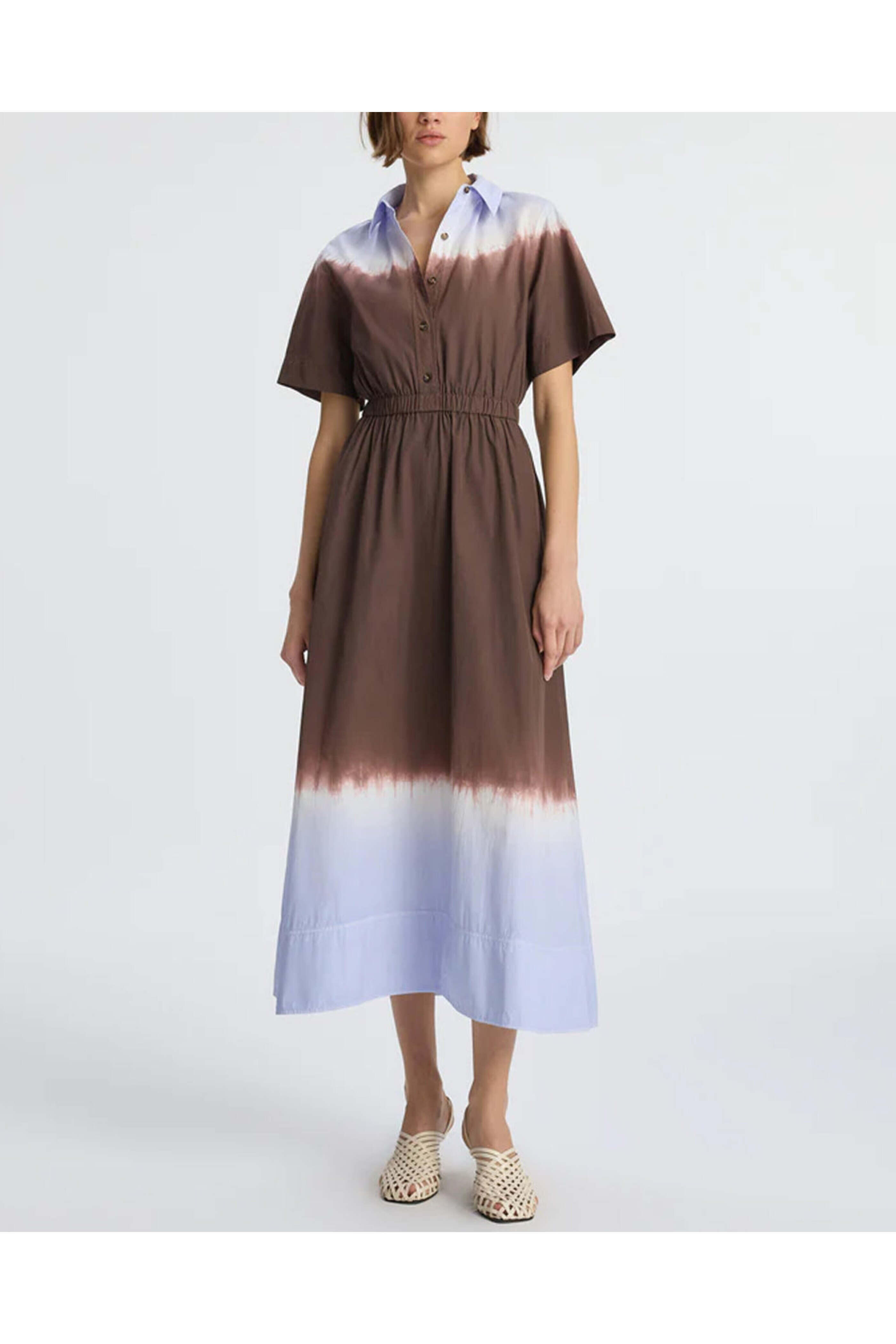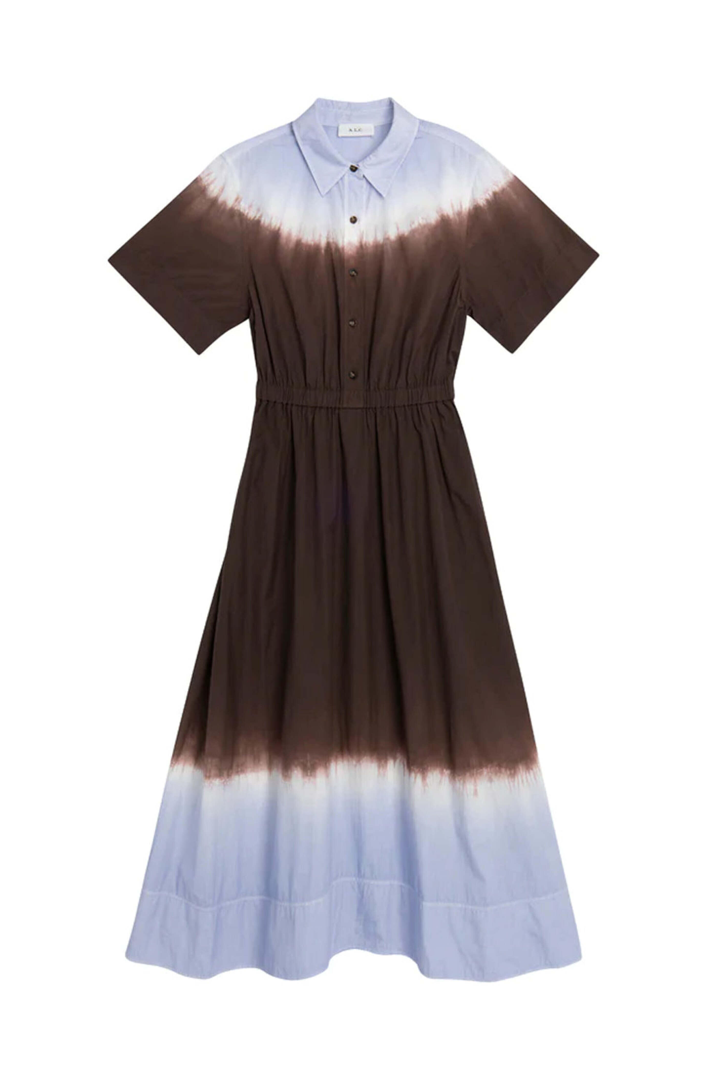 A.L.C. Fudge and Blue Dip Dye Demi Dress. Collar. Short sleeves. Quarter button placket. Elastic waist. Side slip pockets. Aline skirt. Midi length. 100% cotton.