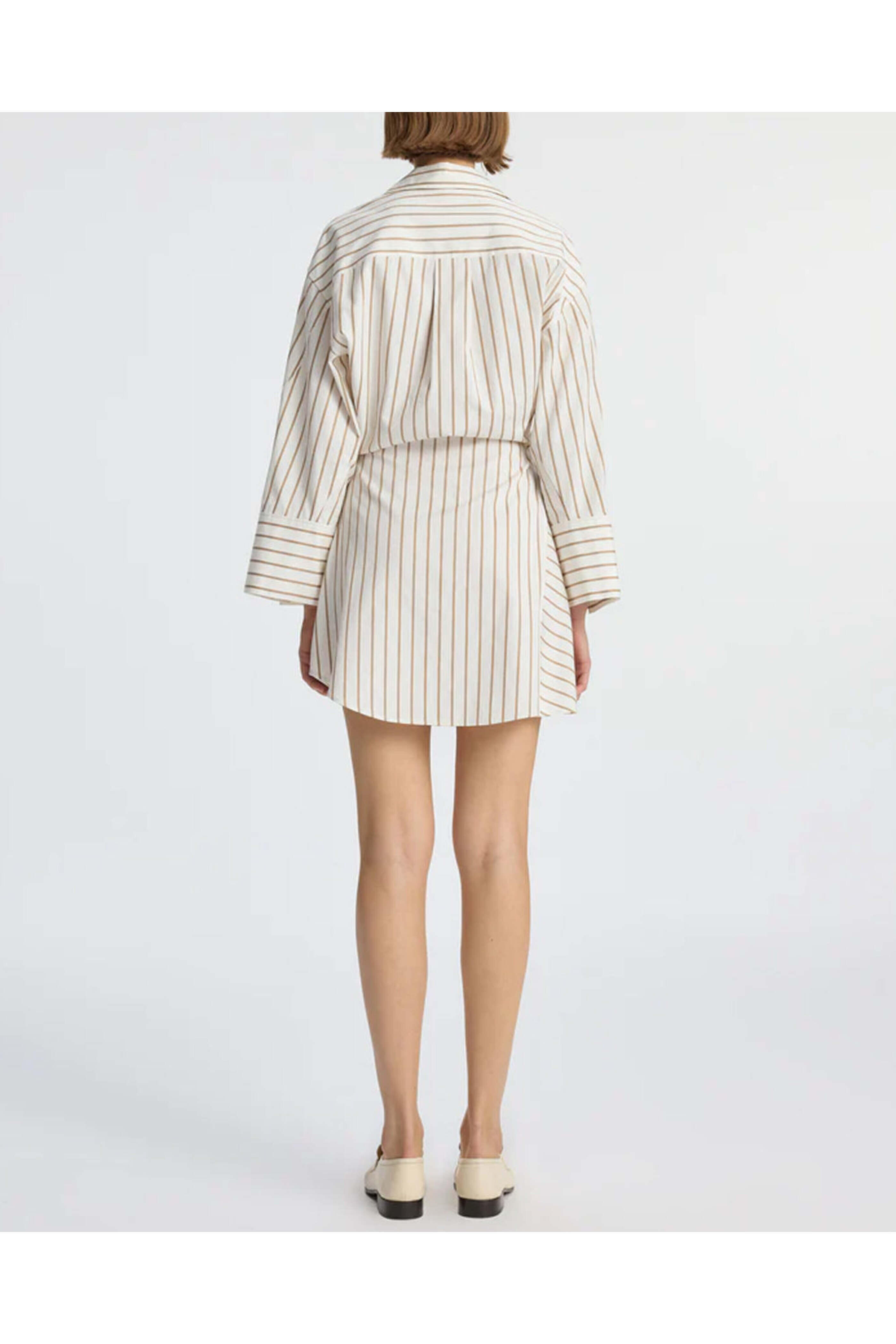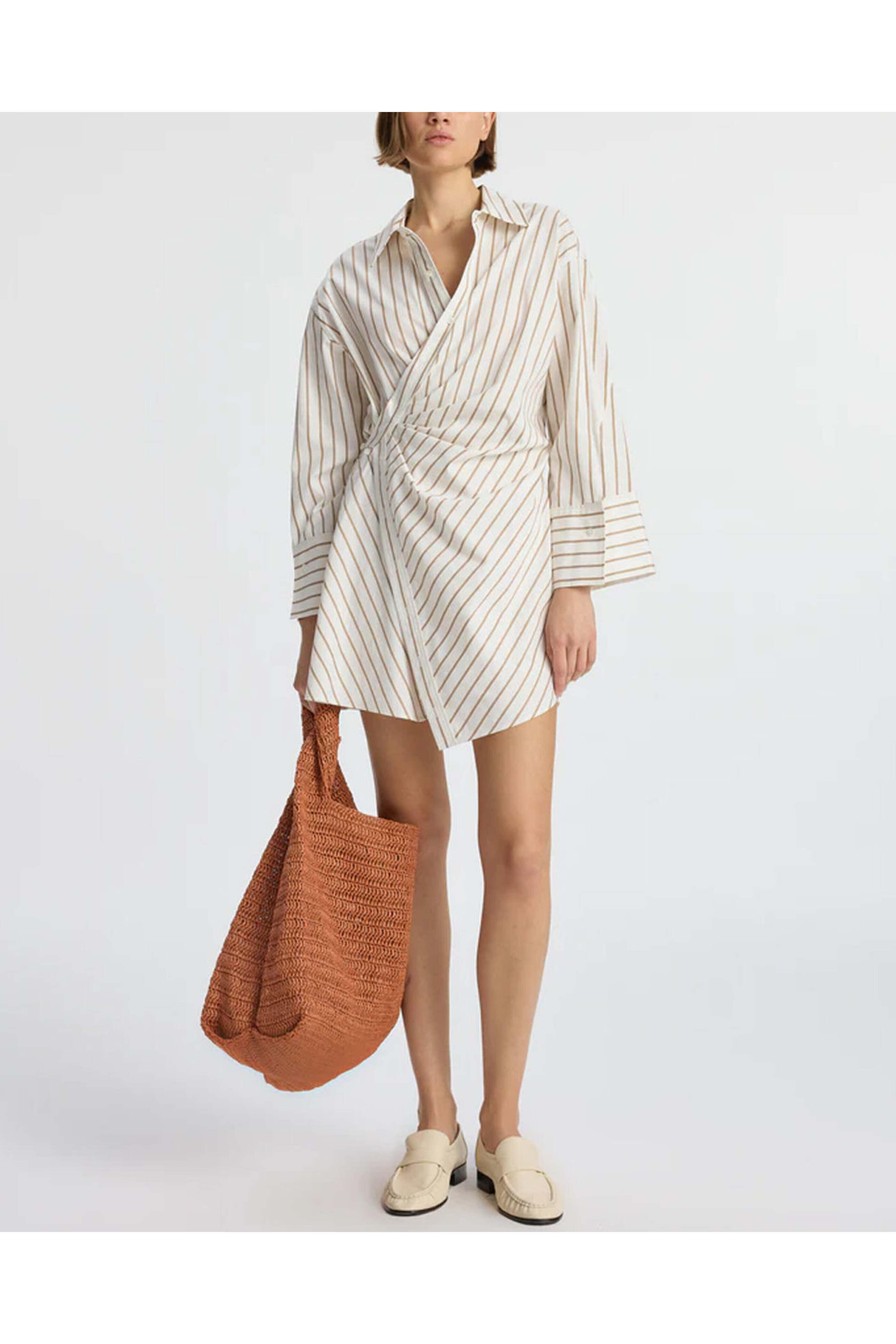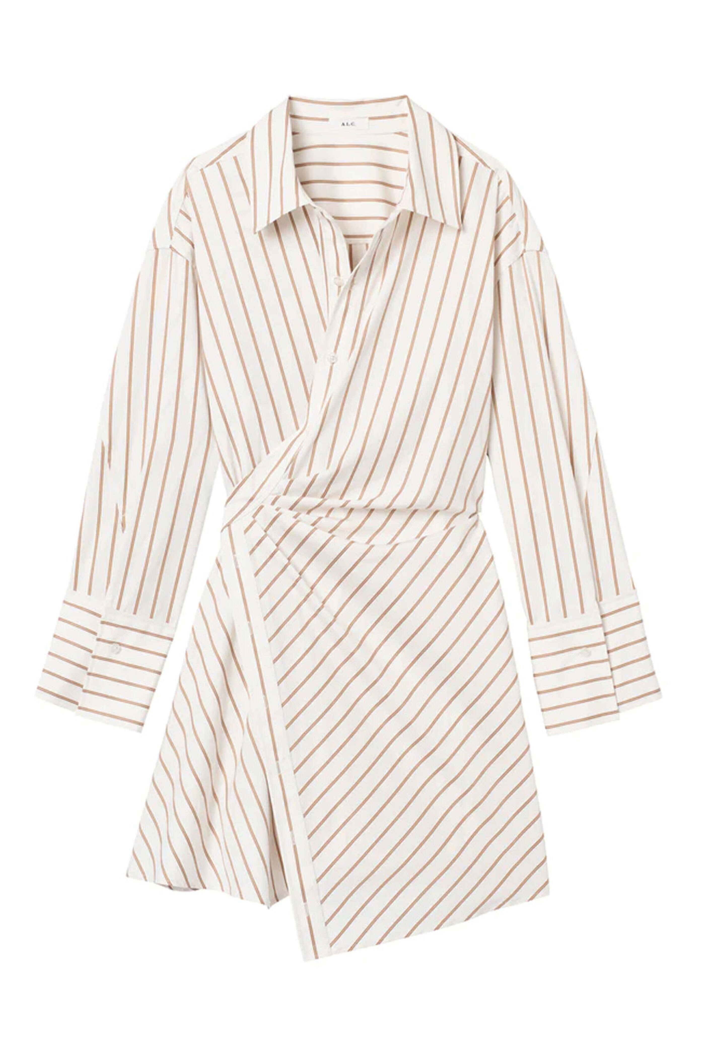 A.L.C. Bone and Lark Stripe Madison II Dress. Collar. Drop shoulders. Long wide sleeves; button cuffs. Asymmetrical button down front closure. Wrap silhouette. Mini length. 100% cotton.