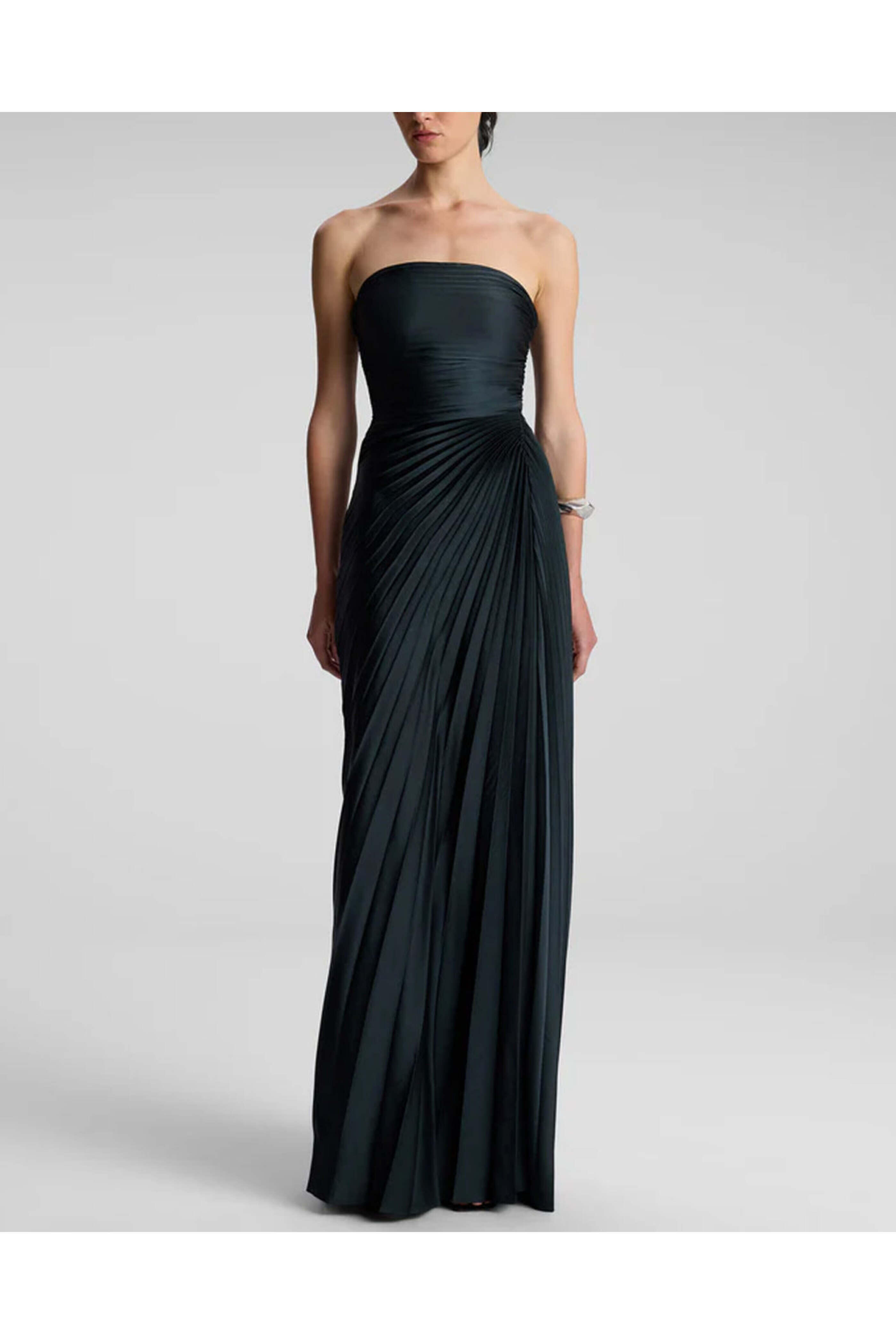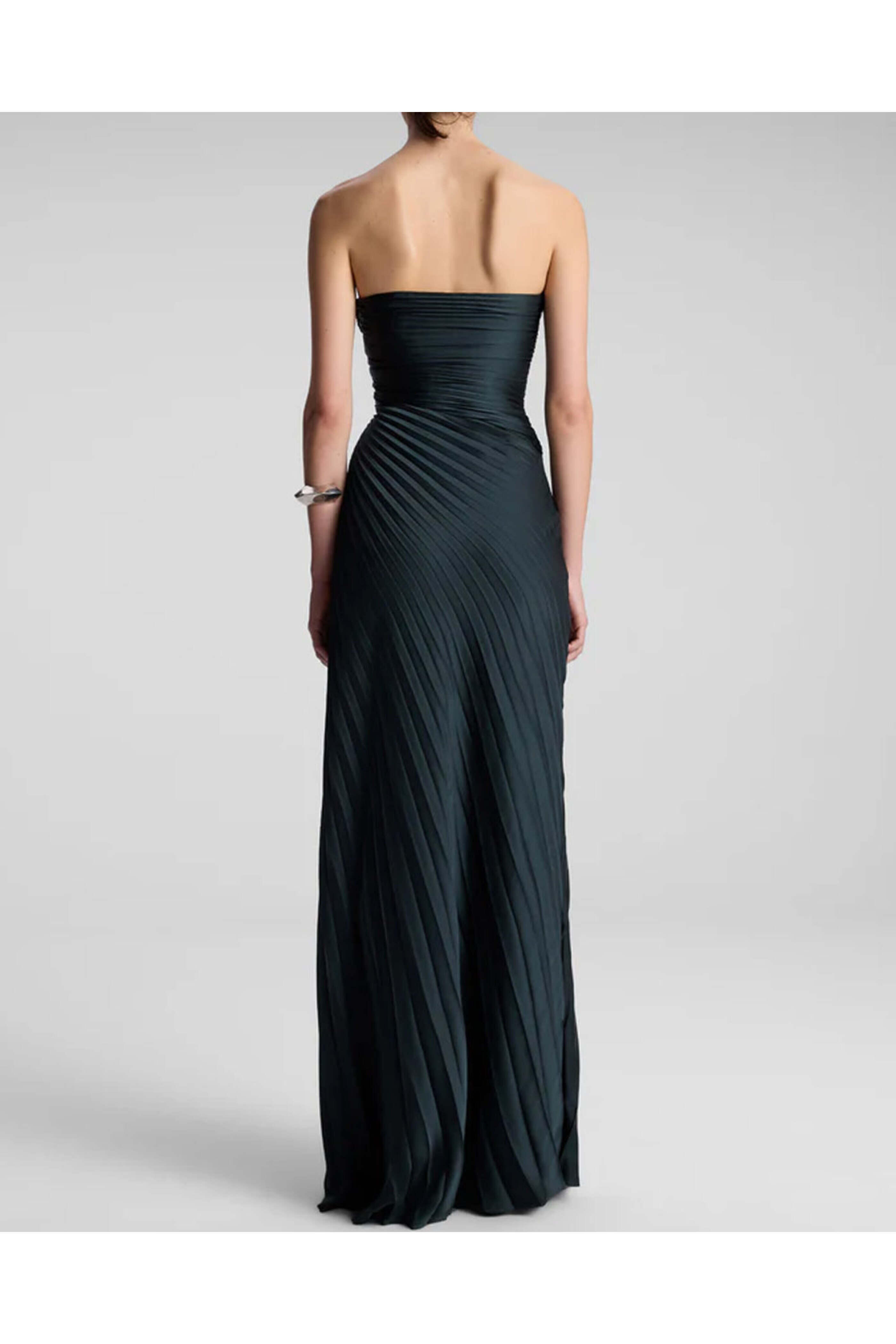 A.L.C. Forest Bianca Pleated Maxi Dress. Strapless. Sleeveless. Concealed zip closure. Slim through bodice. Straight skirt. Pleated throughout. Maxi length. Lined. 100% polyester outer, 87% polyester, 13% elastane lining.