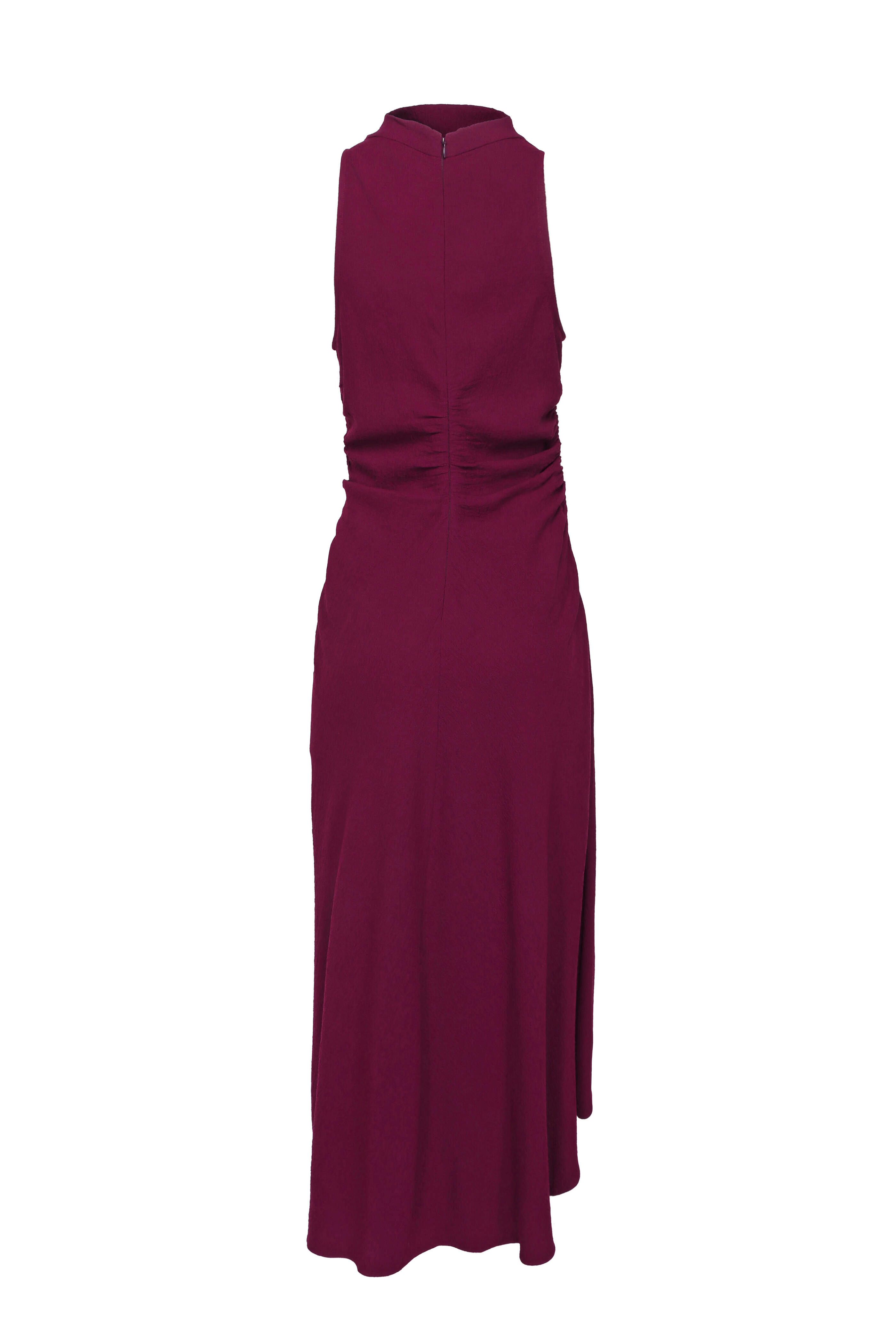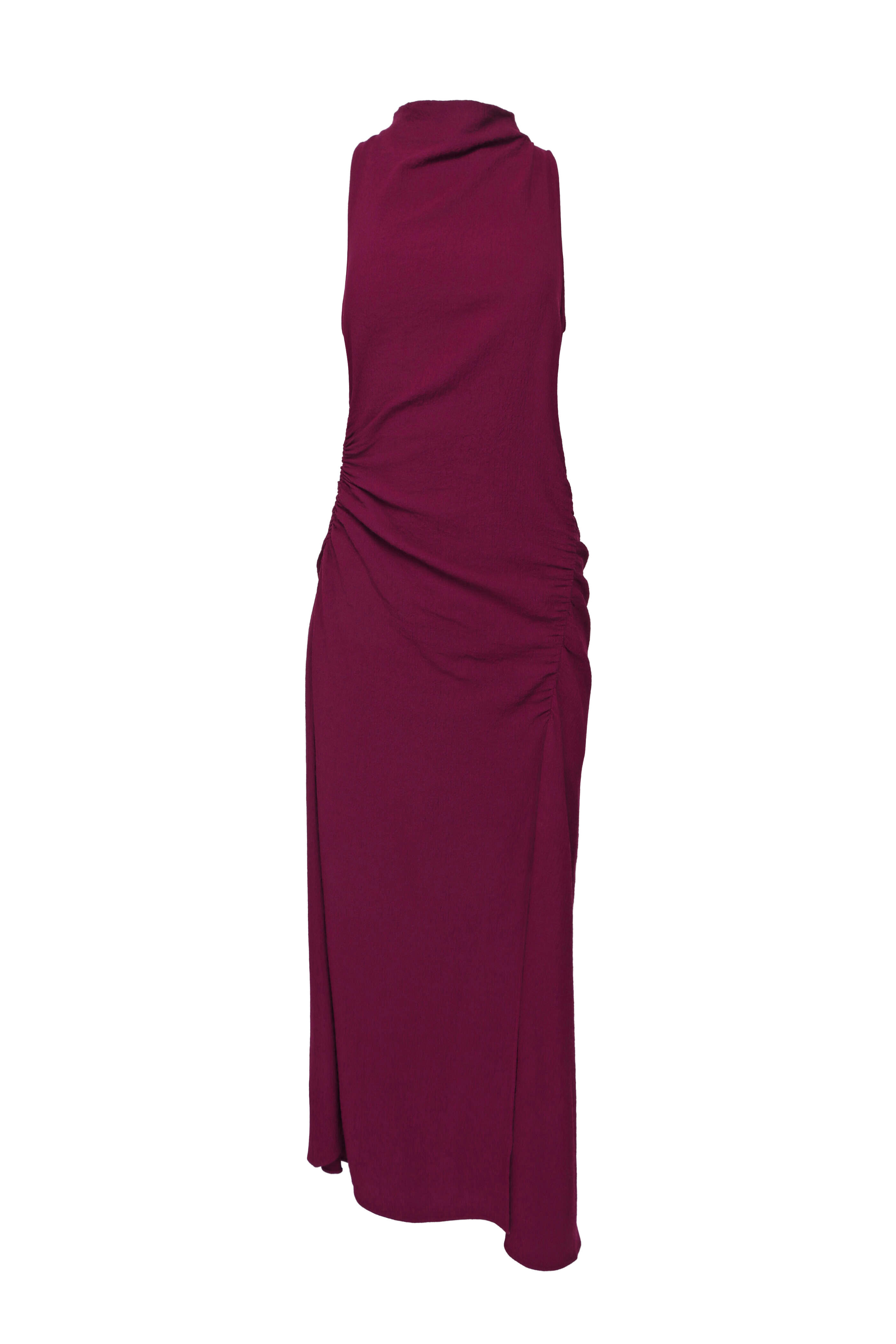 High neck. Sleeveless. Concealed back zip closure. Ruched hip detail. Slim through waist. Aline silhouette. Imported. Bust 32.5” (US 4). Waist 28.5” (US 4). Hip 30.5” (US 4). Length 52.25” (US 4). 84% viscose, 15% virgin wool, 1% elastane. Dry clean.