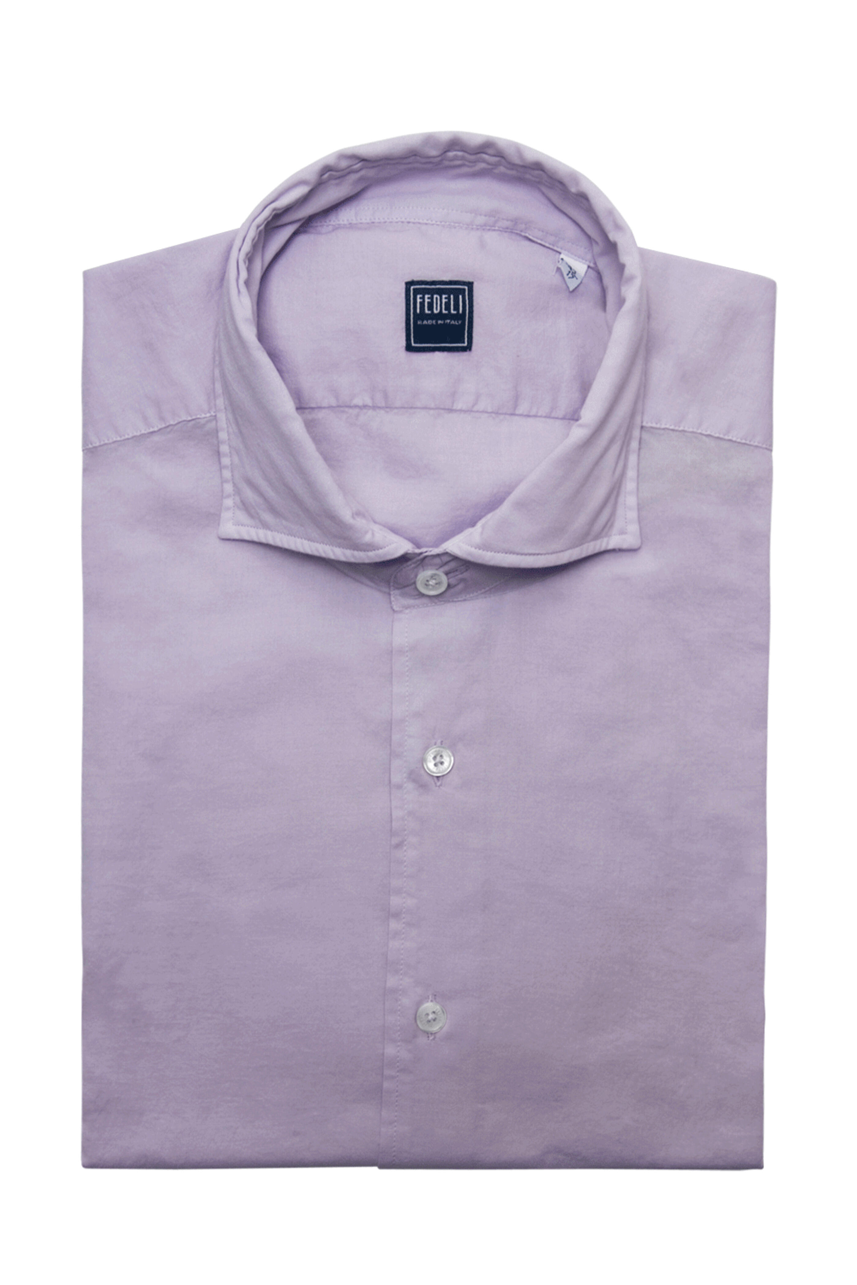 Fedeli Lavender Solid Cotton Sportshirt. Spread collar. Button down front. Long sleeves. Single button mitered cuffs. Tonal stitching. Rounded hem. Lightweight. Made in Italy. 95% cotton 5% elastane.