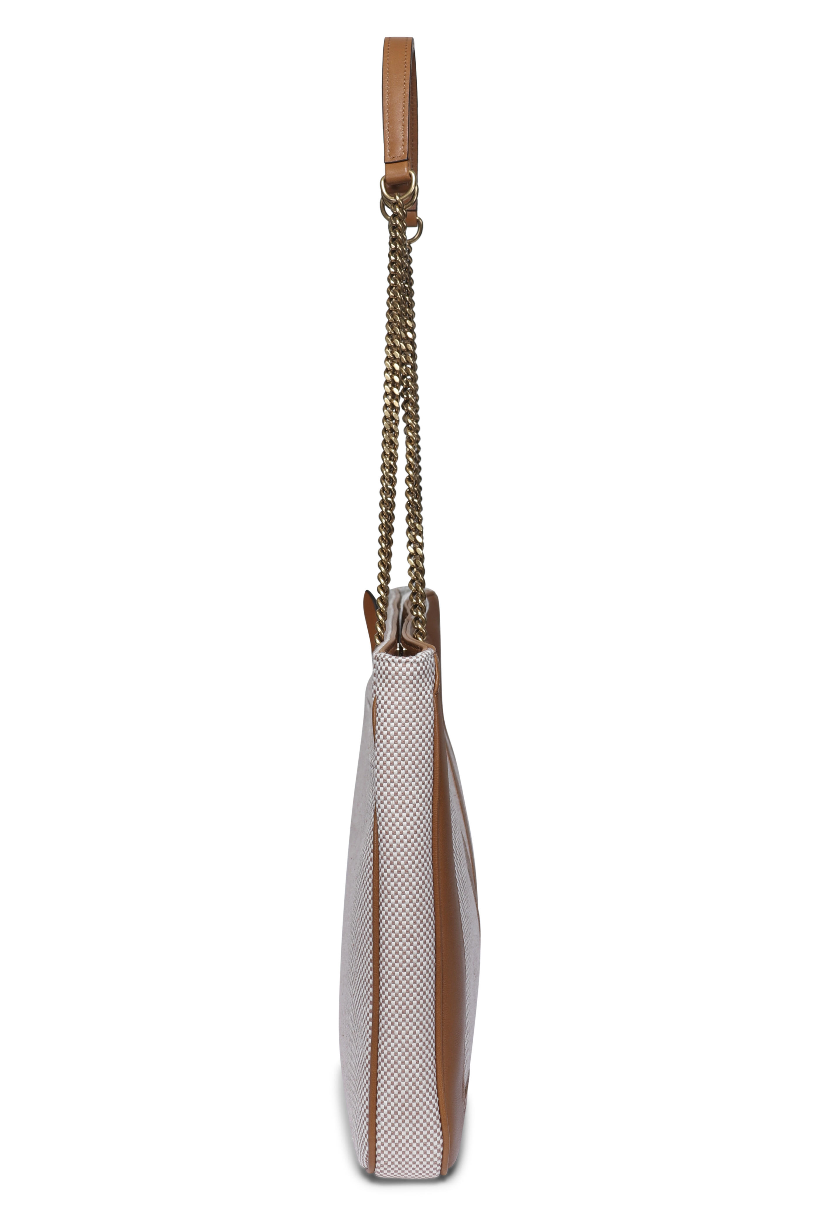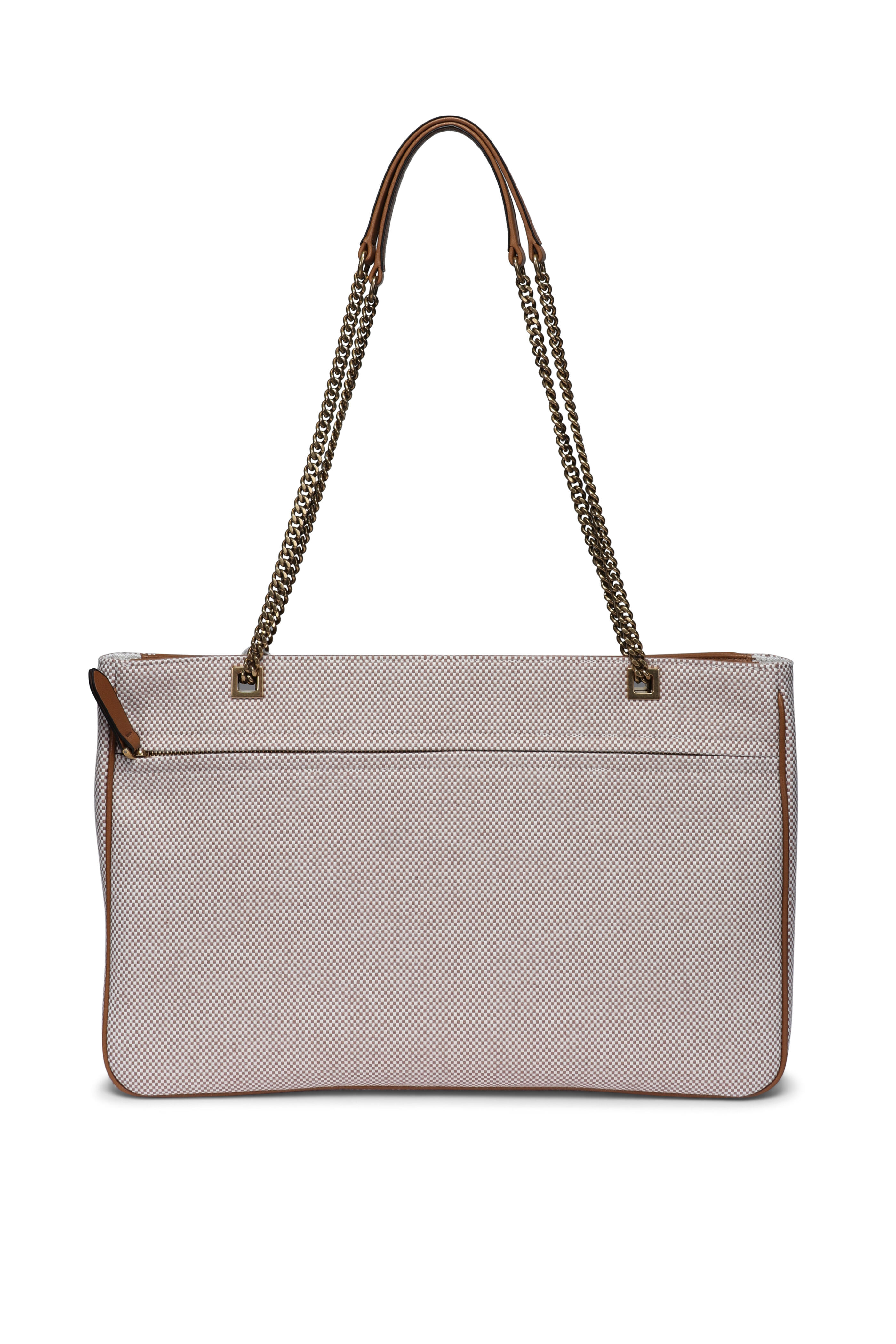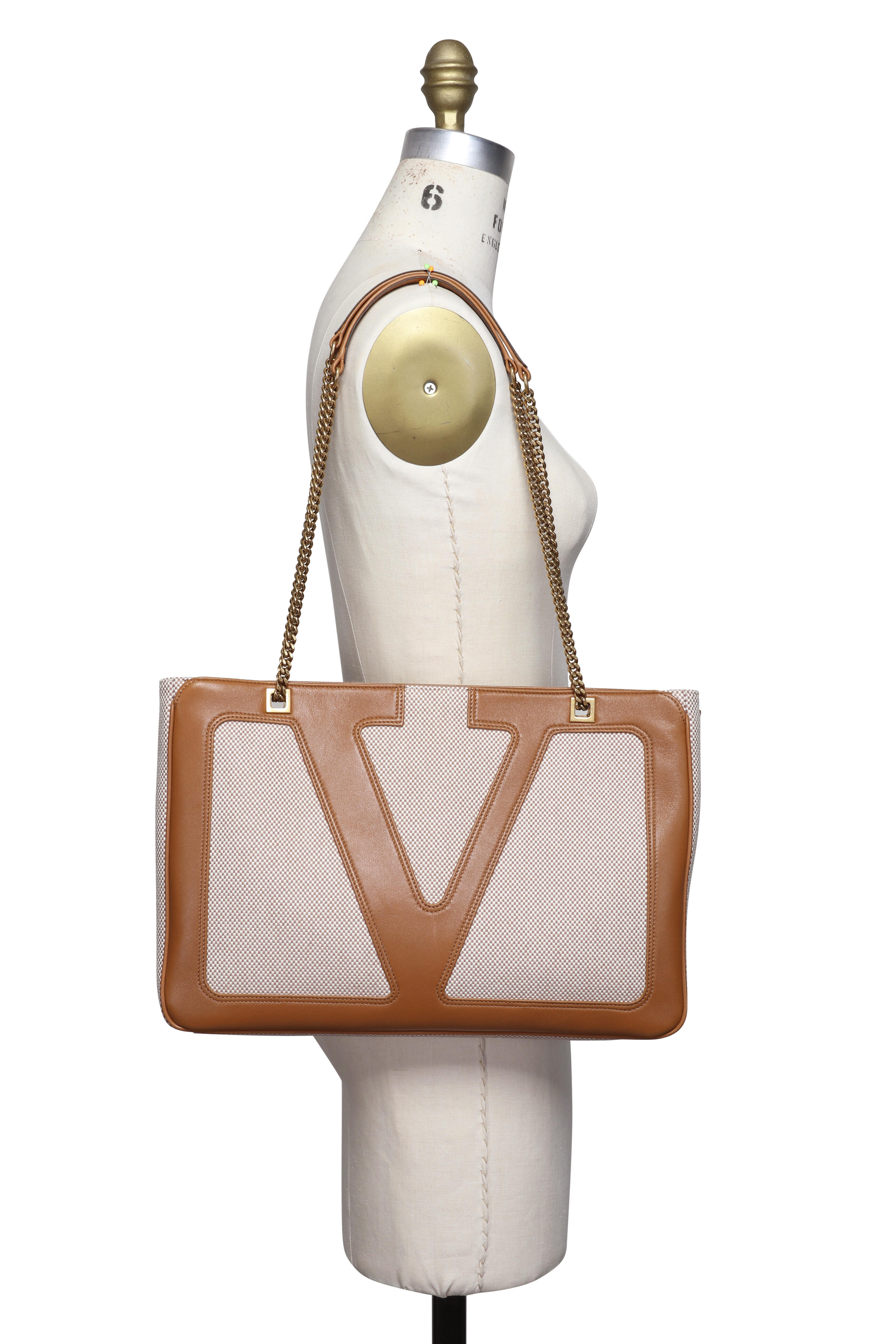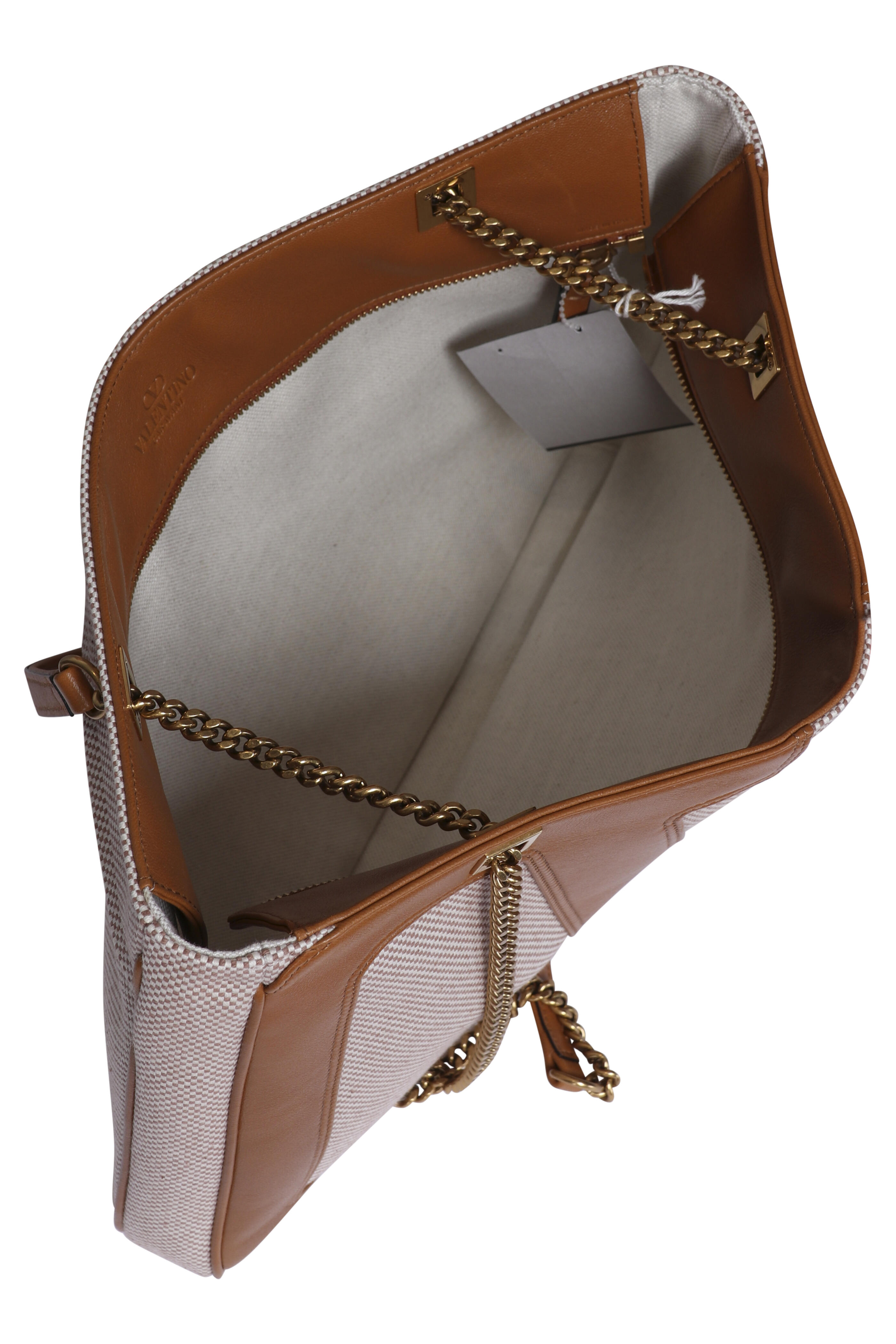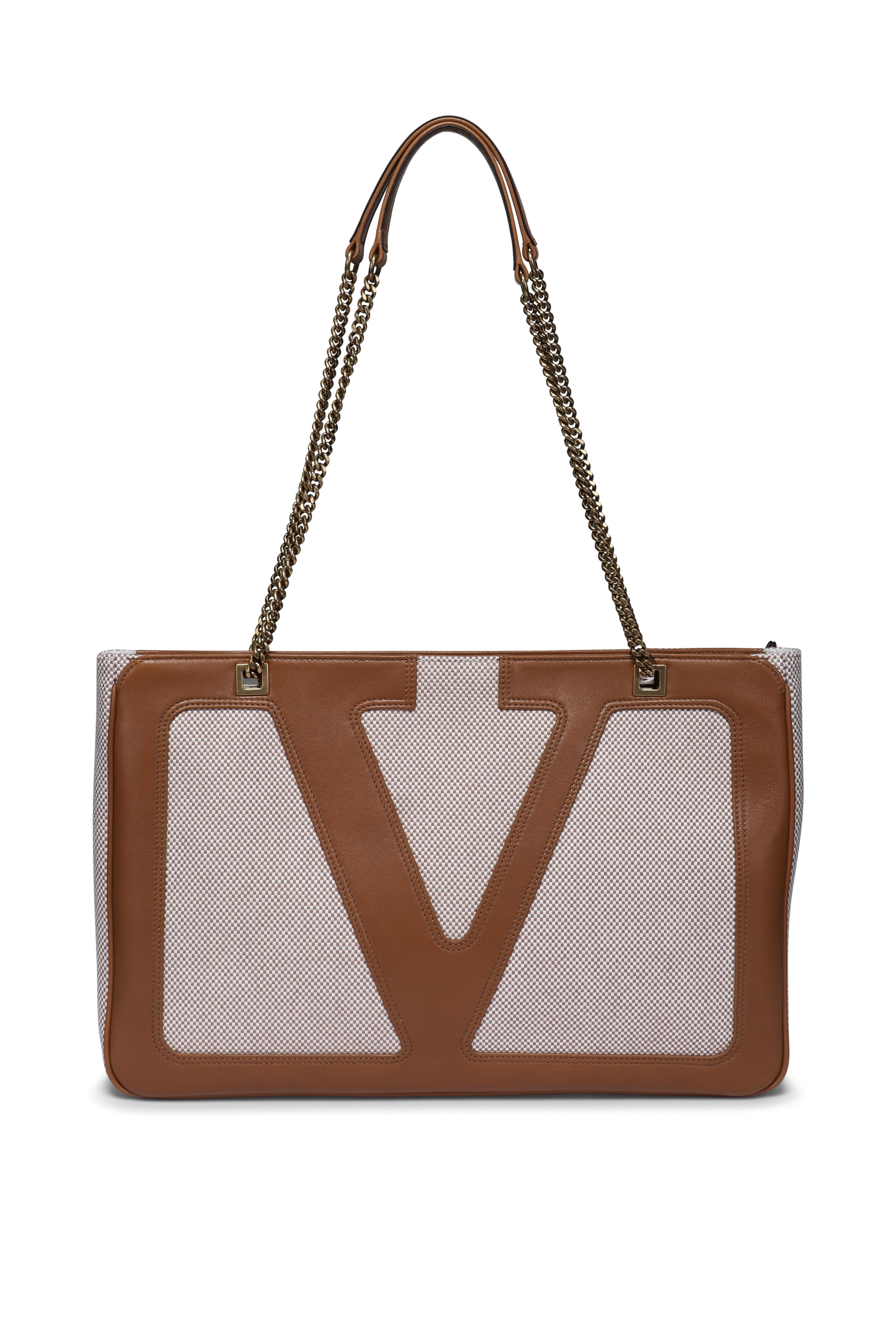 Cotton and leather upper. Cotton lining. Top zip closure. Sliding chain and leather shoulder straps. VLogo signature logo accent. Exterior back zip pocket. Made in Italy. Color: Tobacco. Width: 17.7”. Height: 13.8”. Depth: 1.4”.