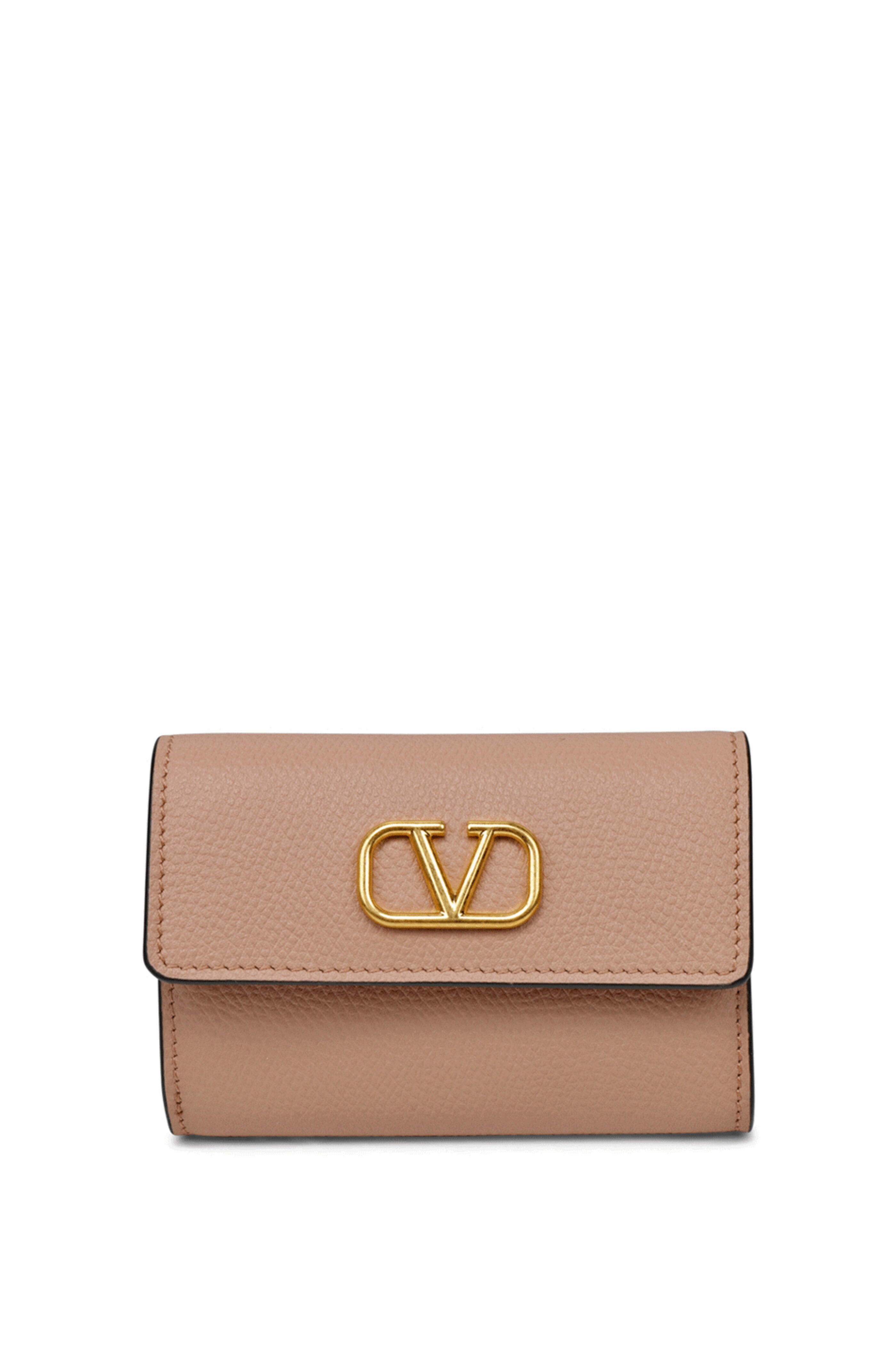 Press stud closure. Antique brass-finish hardware logo. Zip coin pouch. Two card slots. Made in Italy.