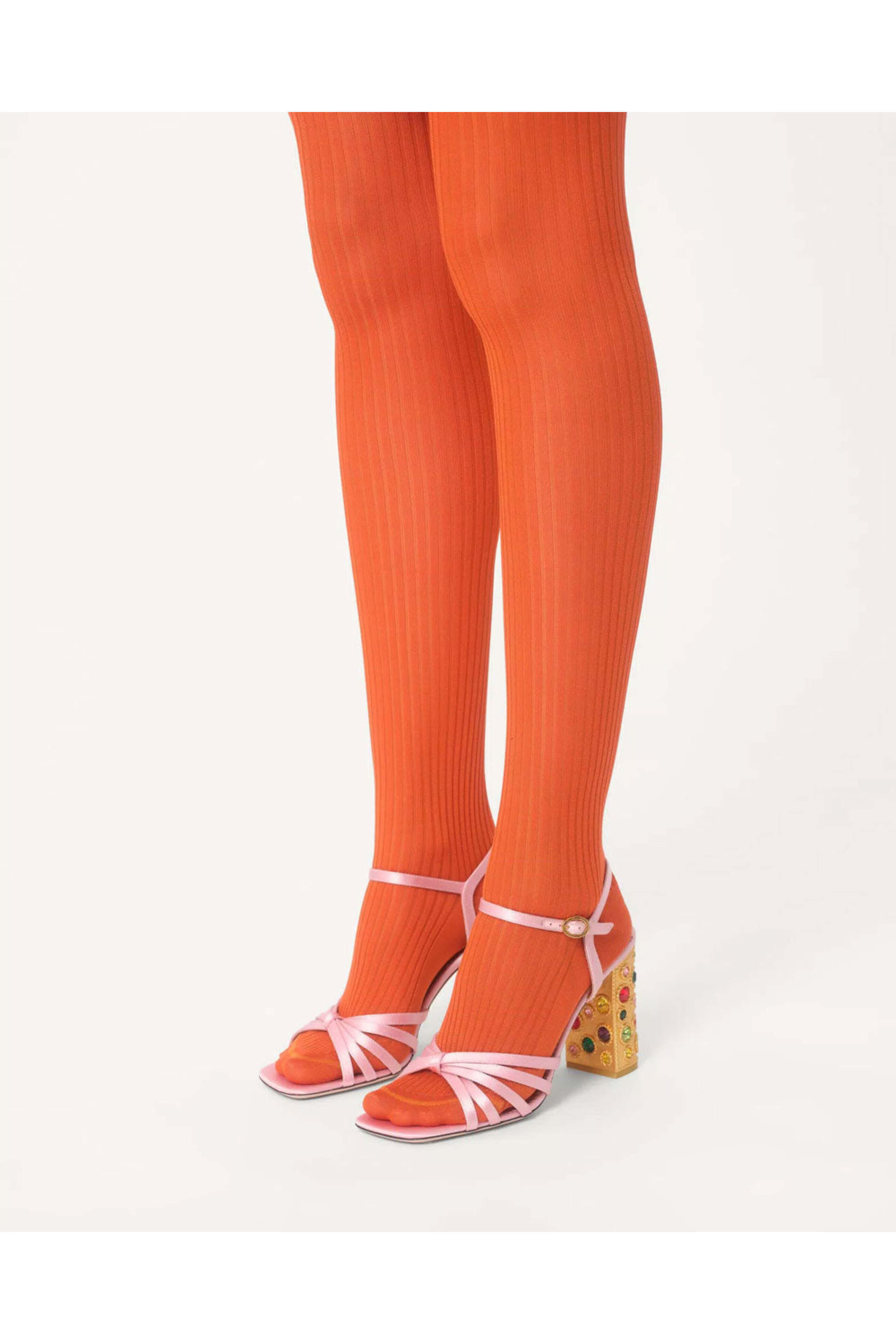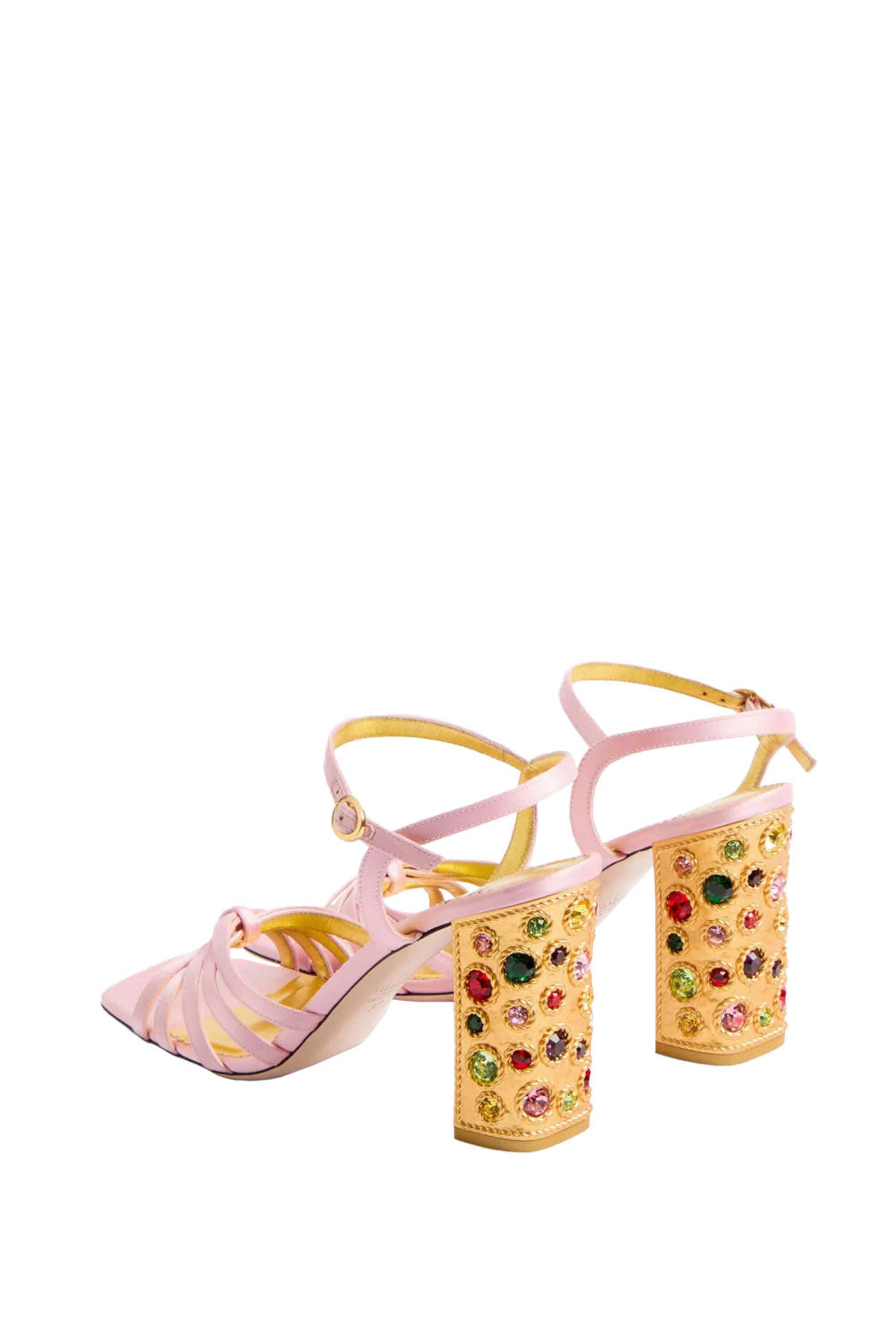 Satin upper. Square open toe. Adjustable ankle strap. Multi-strand knotted toe strap. Multicolored crystal design. Vintage brass-finished block heel. Leather lining and sole. Made in Italy. Heel height: 90mm.