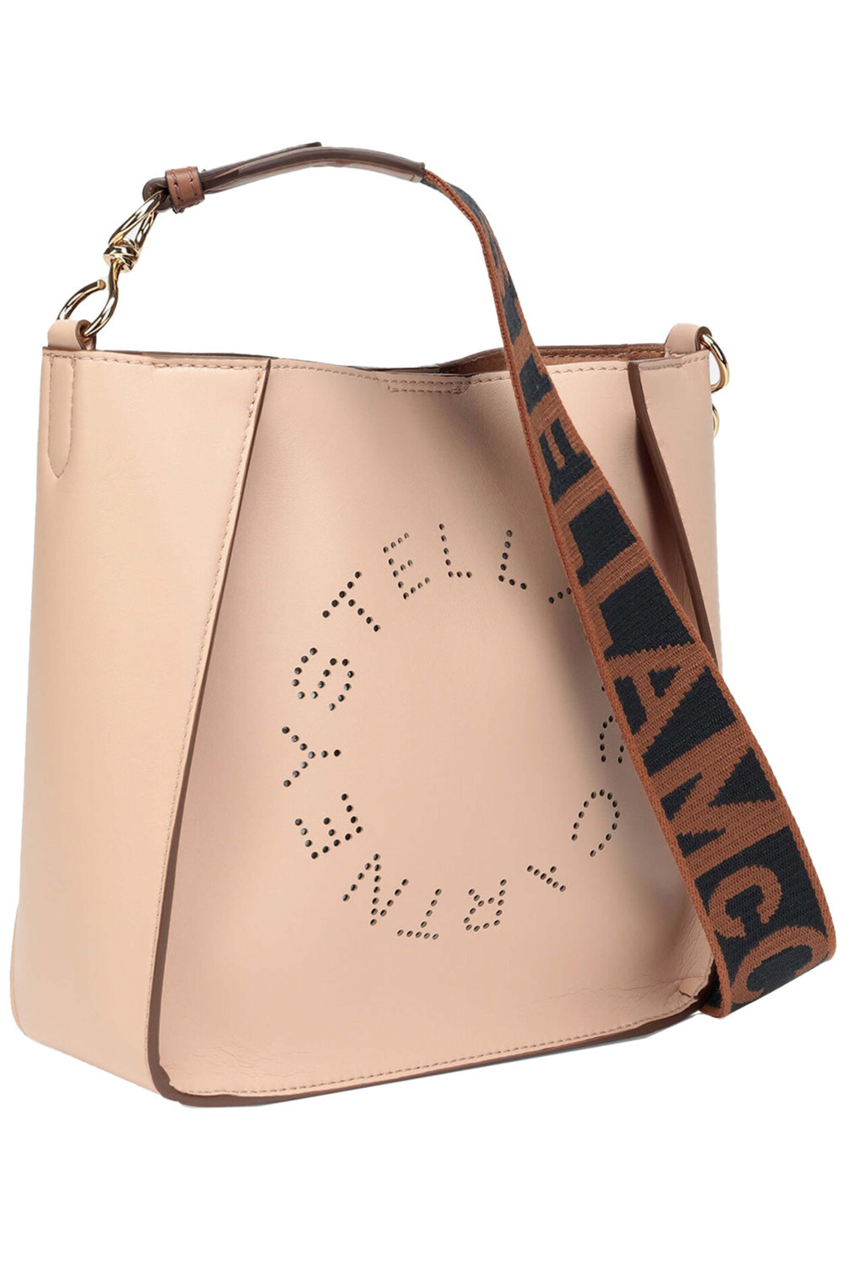 Stella McCartney Mini Logo Crossbody in Blush. Open top with snap button closure. Adjustable removable crossbody strap. Interior slip pocket. Perforated front logo detail. Gold tone hardware. 9 W X 9 H X 3.1 D. 25.5 strap. Made in Italy. 56% polyurethane and 44% polyester outer. 60% polyamide and 40% polyurethane lining.