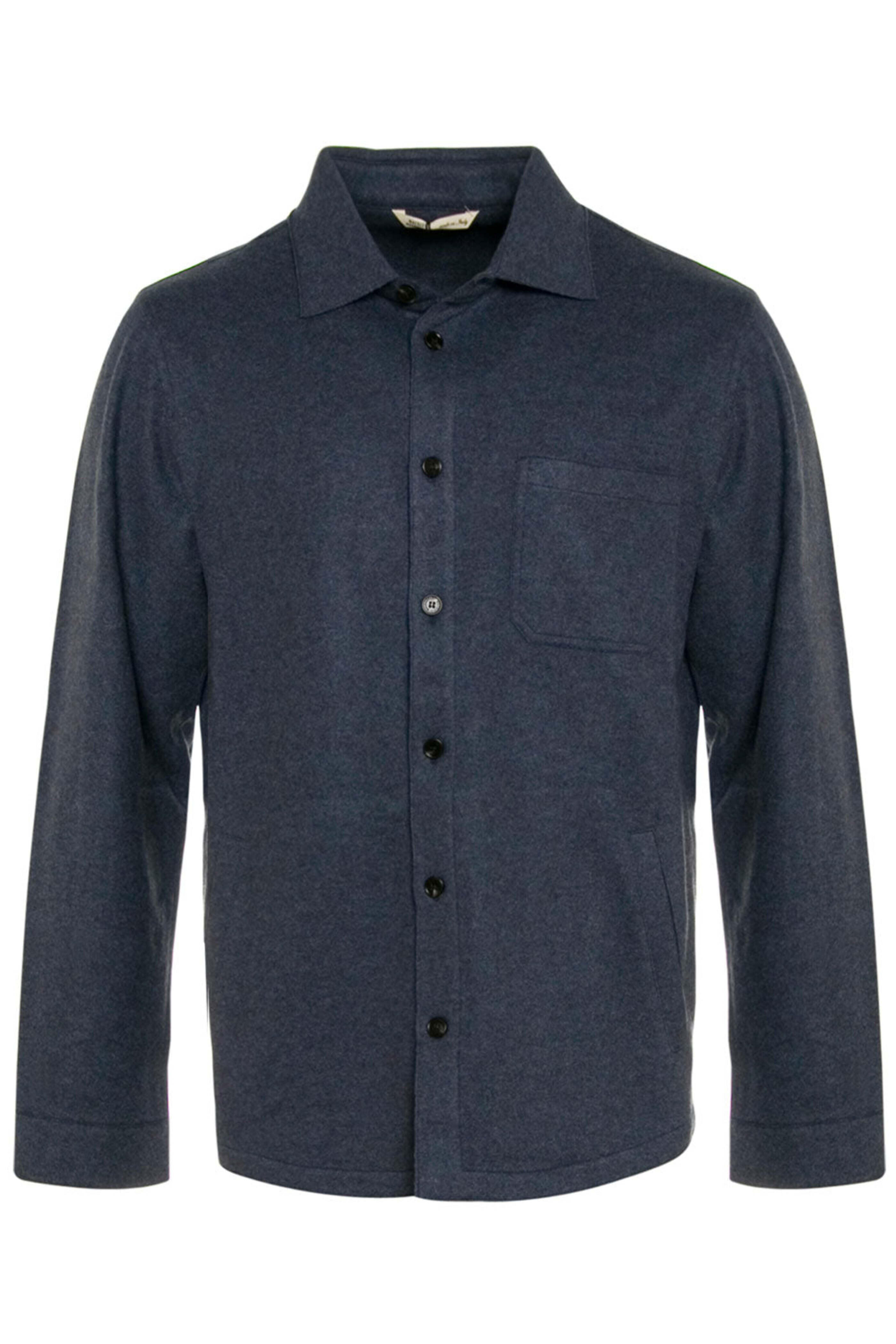 Maurizio Baldassari Blue Melange Cashmere Felt Overshirt. Spread collar. Button down front. Front left chest patch pocket. Long sleeves. Single button straight cuff. Made in Italy. 100% cashmere.