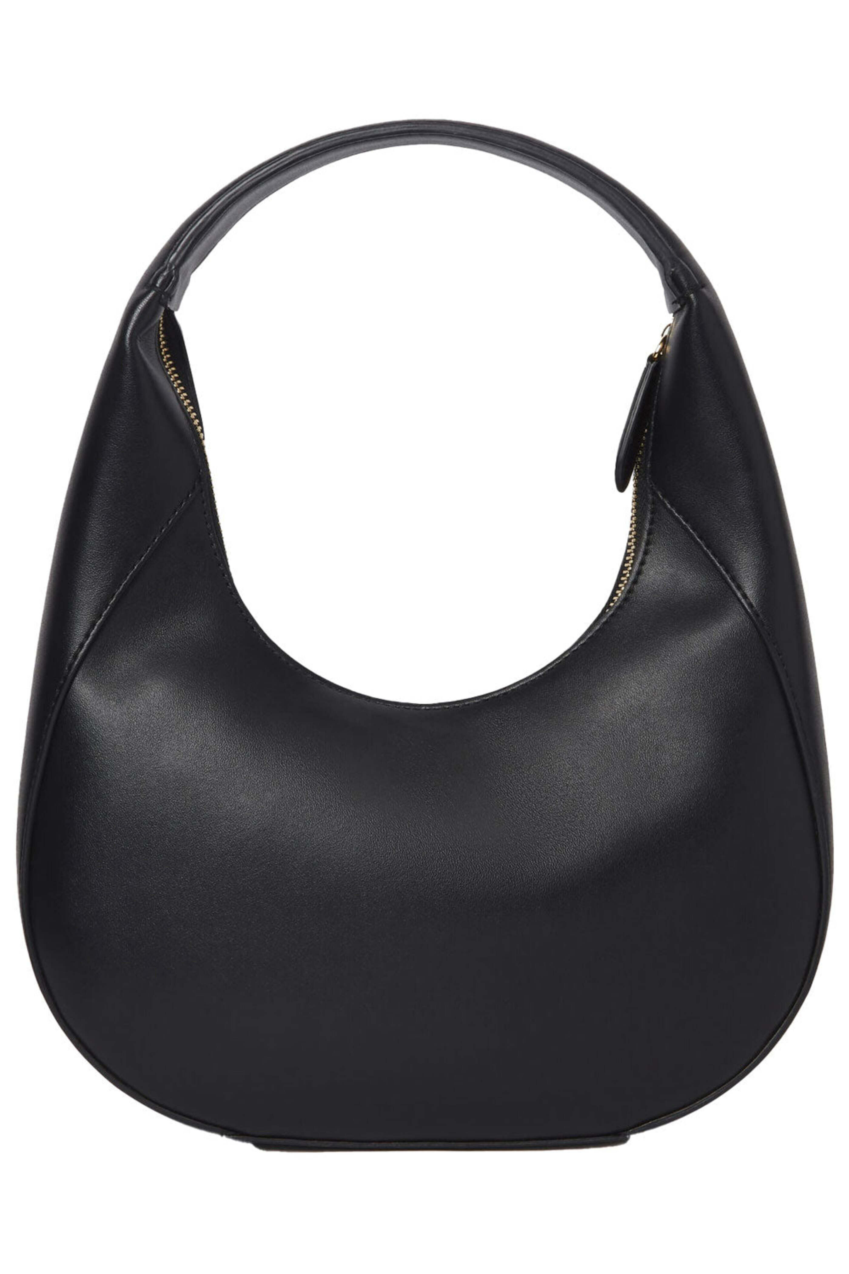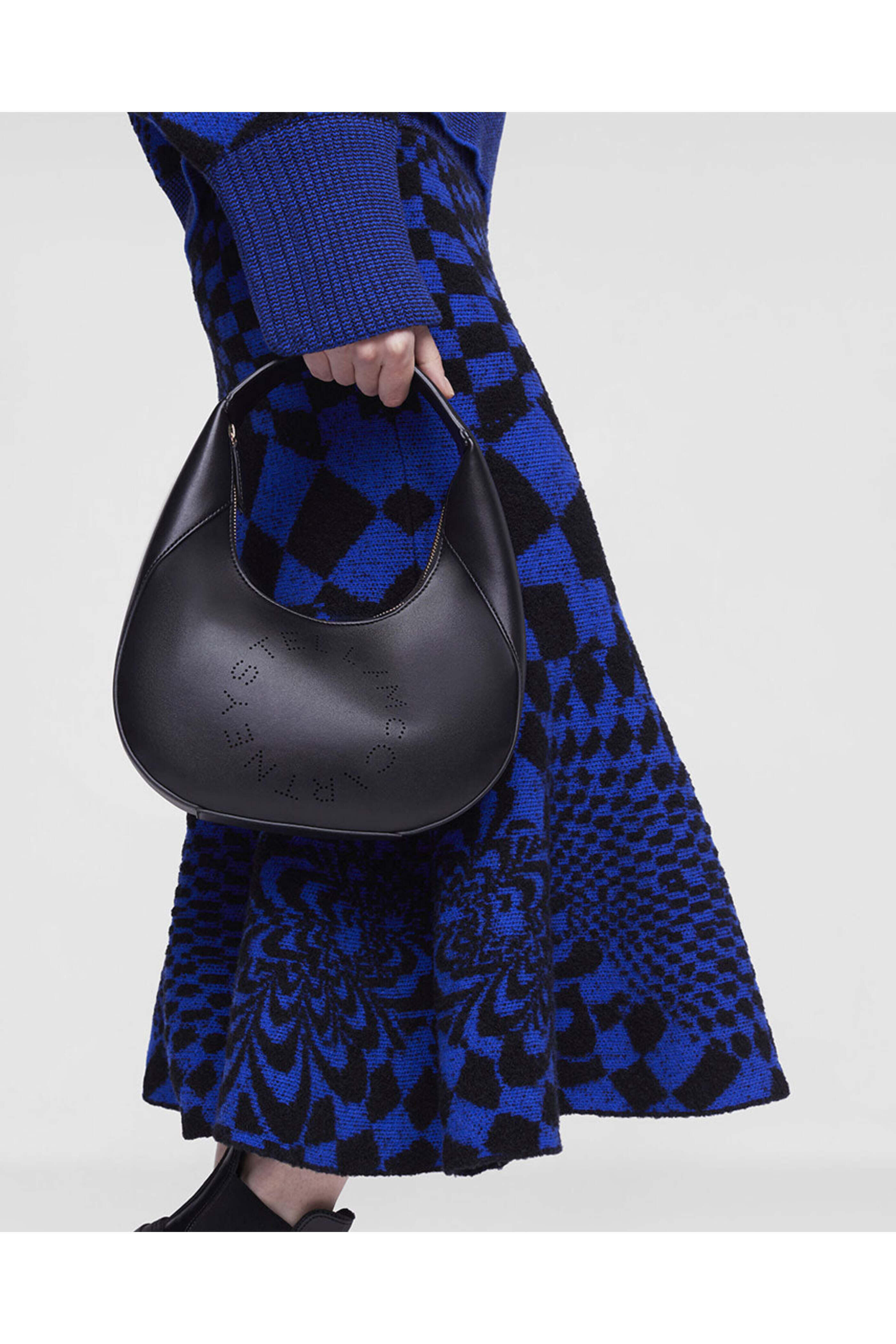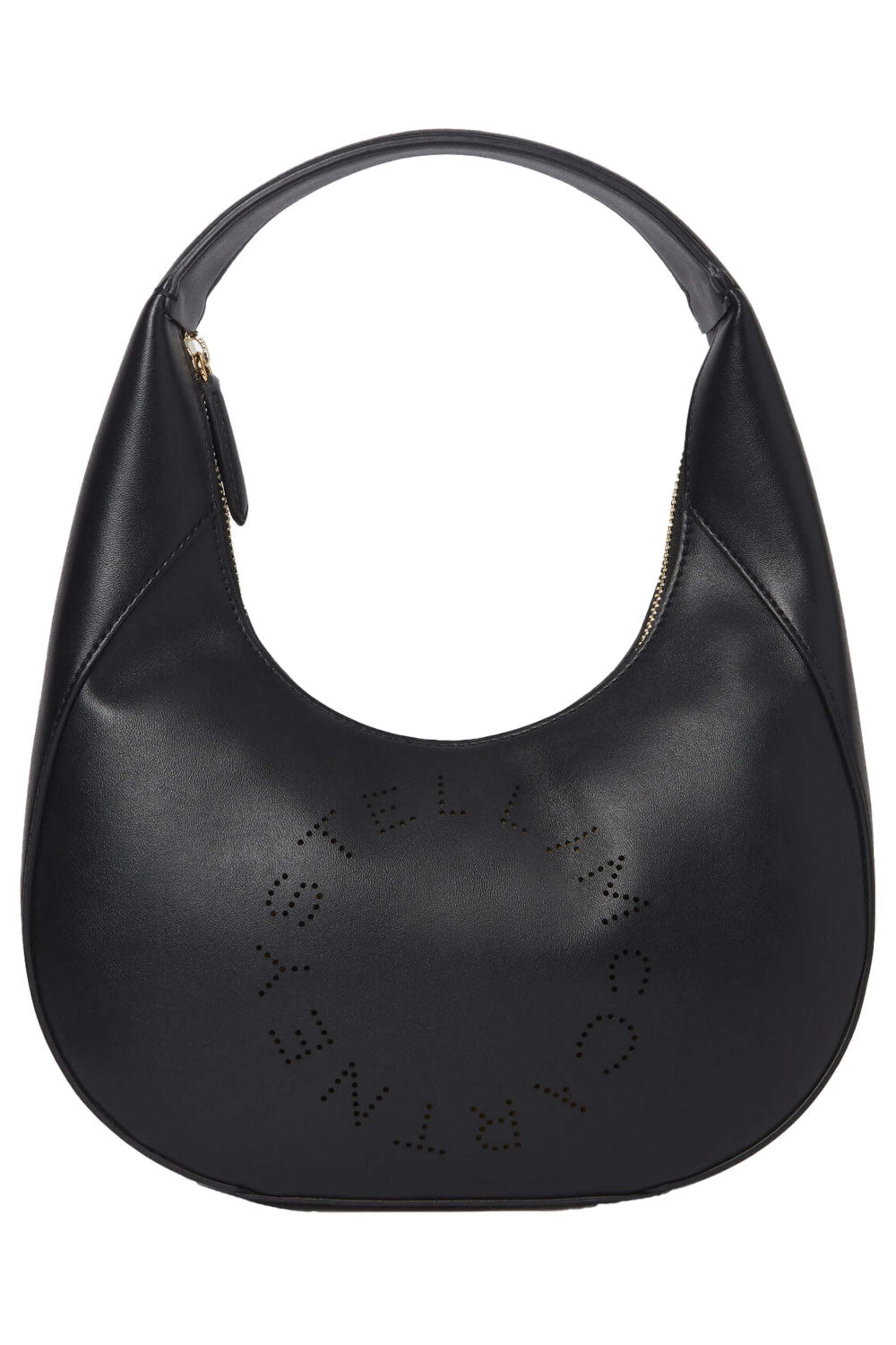 Stella McCartney Small Stella Logo Shoulder Bag in Black. Hobo style shoulder bag. Top zip closure. Interior slip pocket. Perforated logo detail. 10.2 W X 5.9 H X 2.6 D. 19 strap drop. Made in Italy. 56% polyurethane and 44% polyester faux leather outer. 50% polyurethane and 50% polyester faux suede lining.