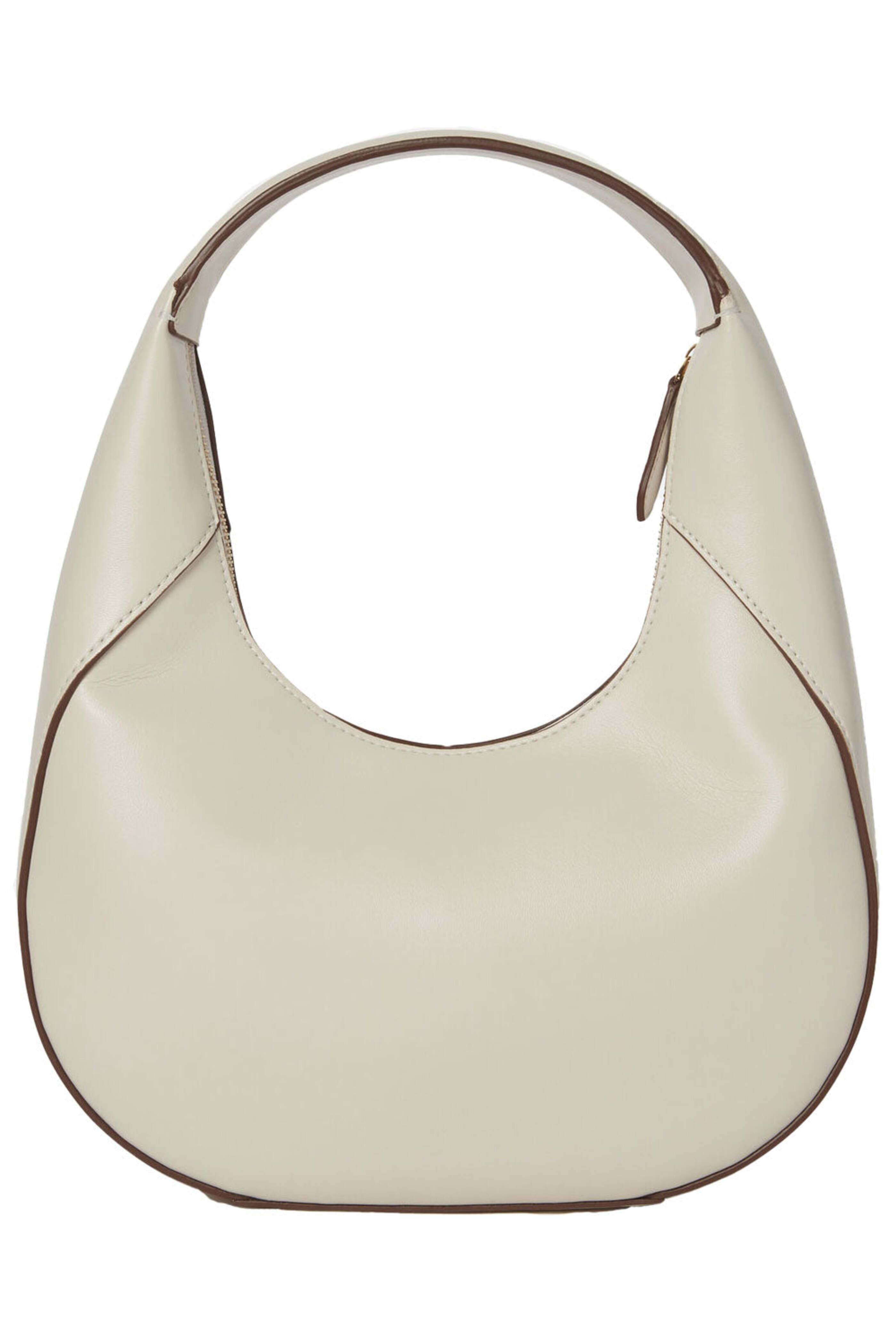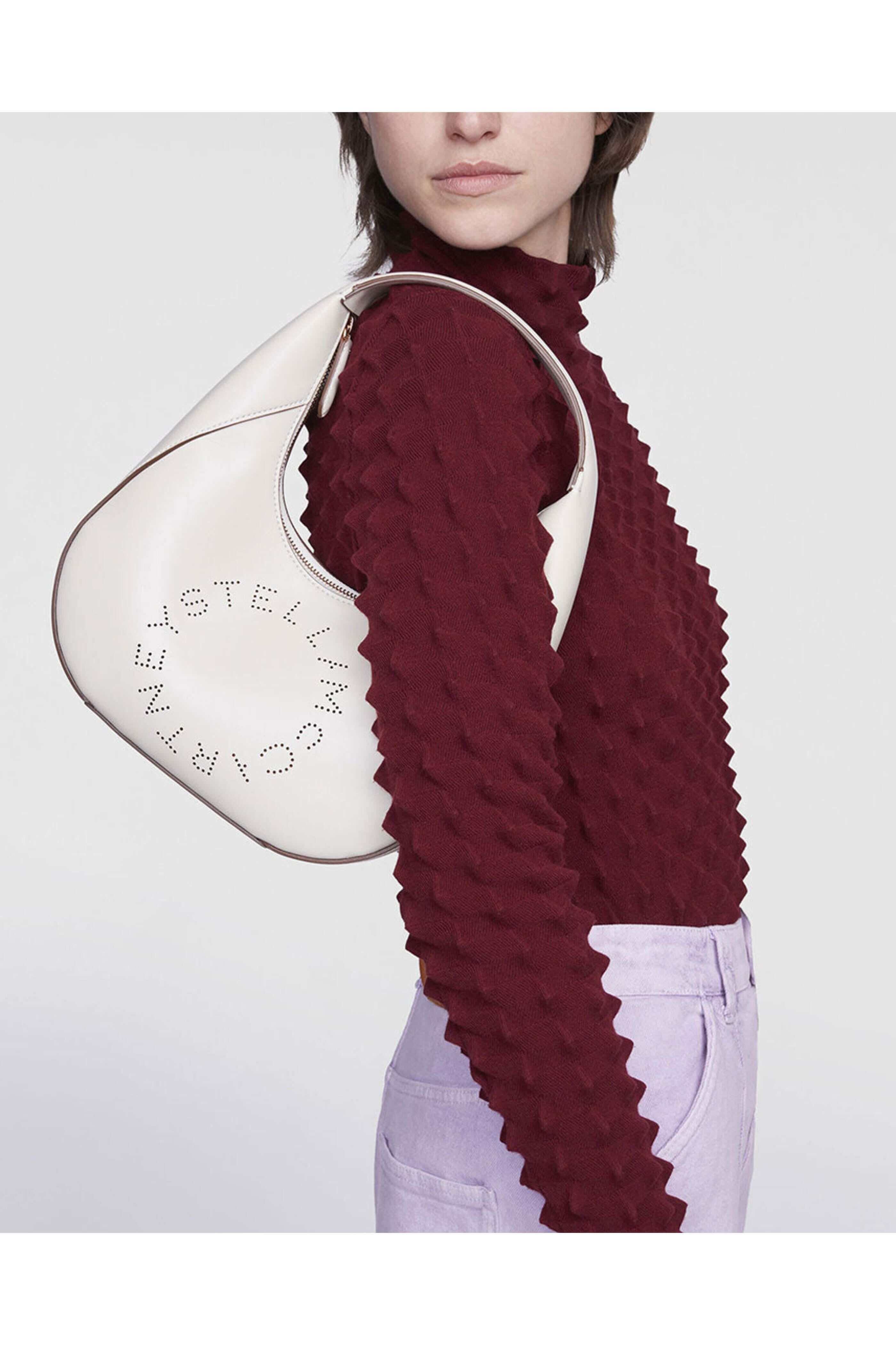 Stella McCartney Small Stella Logo Shoulder Bag in Pure White. Hobo style shoulder bag. Top zip closure. Interior slip pocket. Perforated logo detail. 10.2 W X 5.9 H X 2.6 D. 19 strap drop. Made in Italy. 56% polyurethane and 44% polyester faux leather outer. 50% polyurethane and 50% polyester faux suede lining.