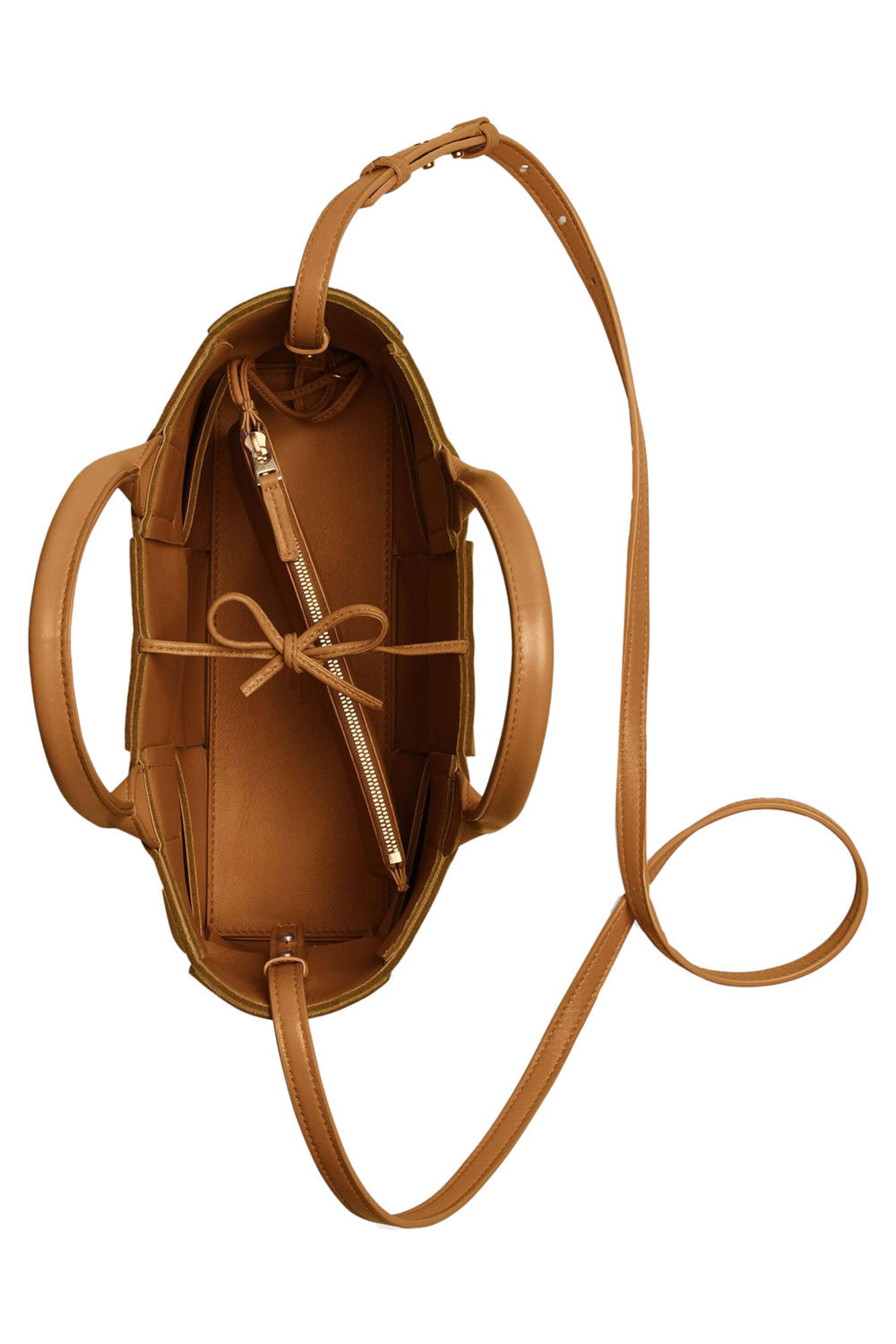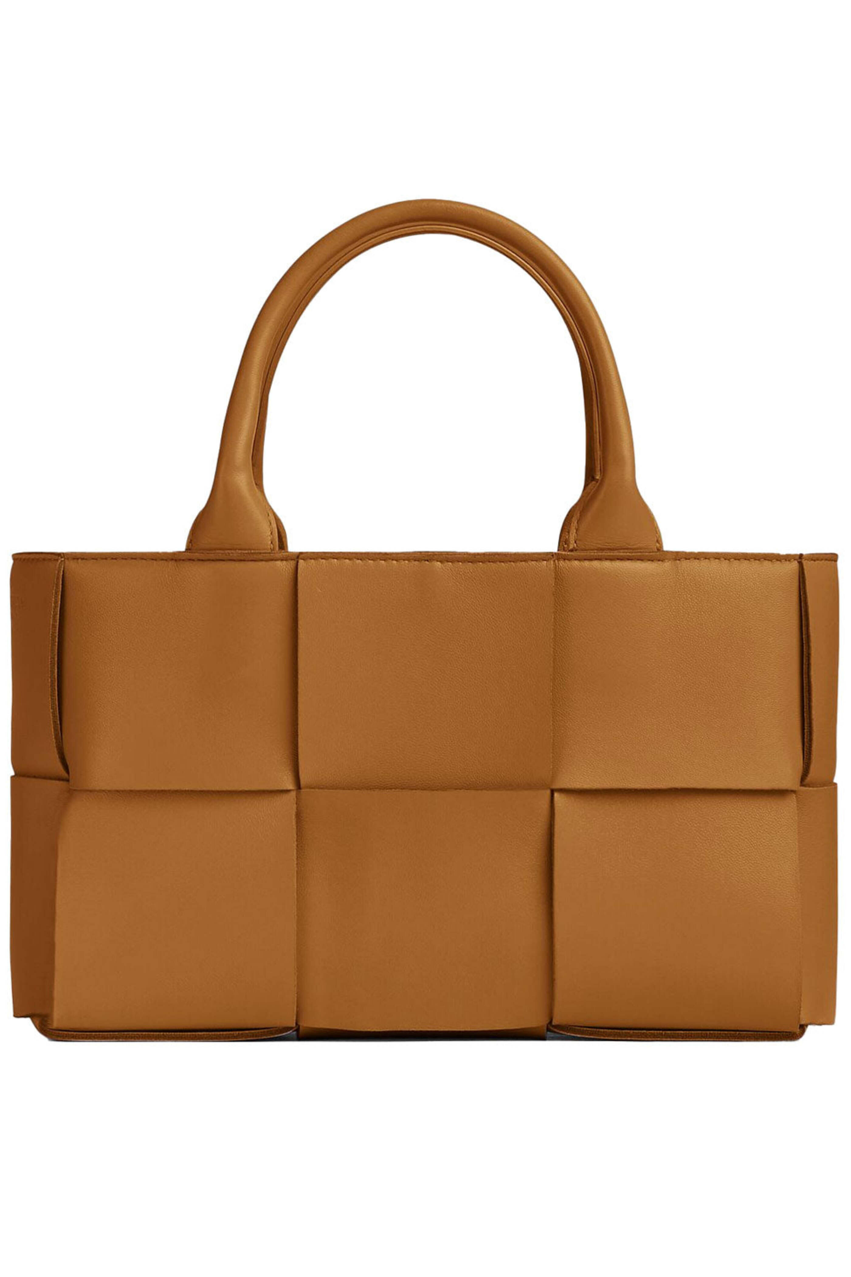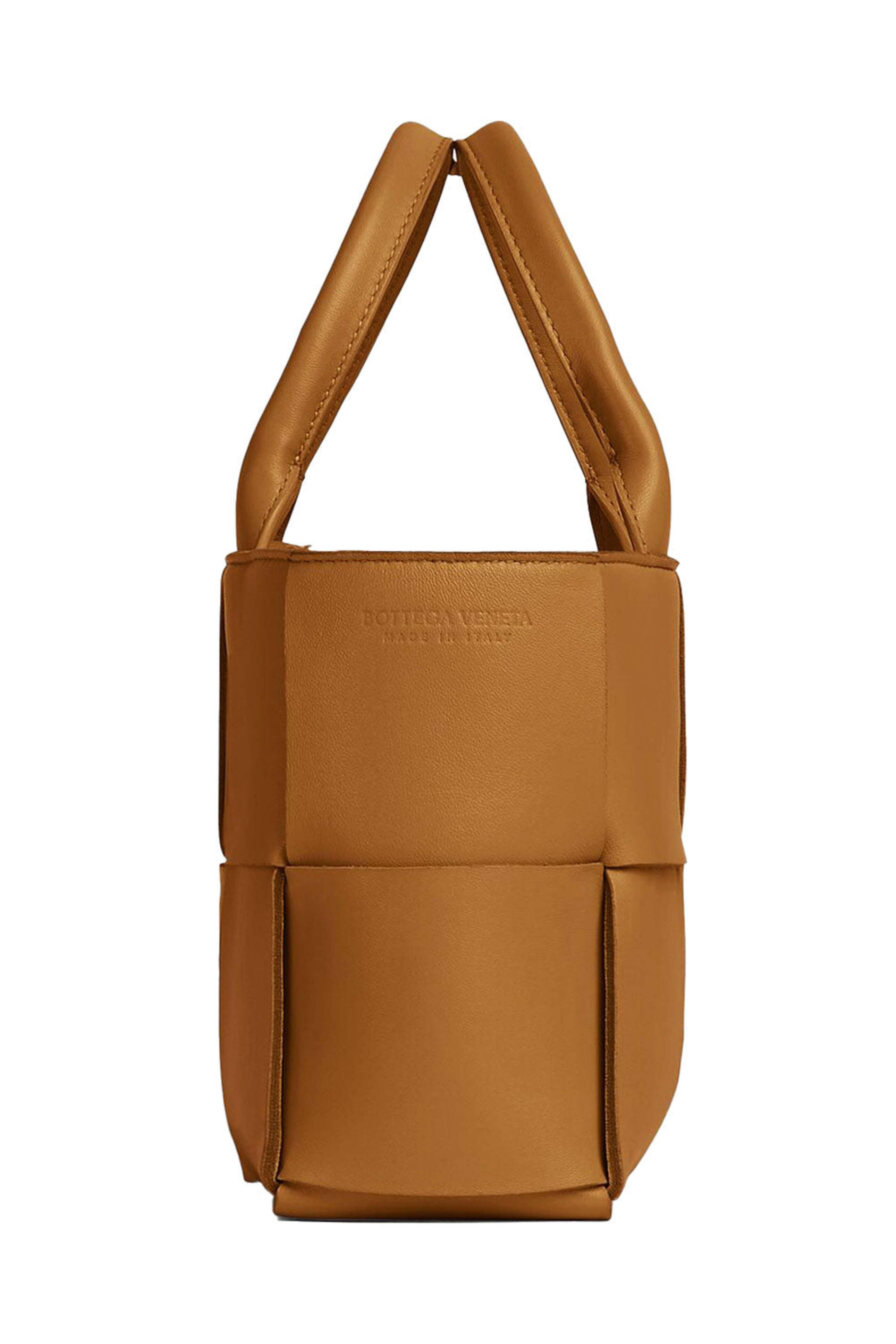 Bottega Veneta Mini Arco Tote in Camel. Open top with drawstring closure. Two top handles. Detachable adjustable strap. Detachable interior zip pocket. Gold tone hardware. 9.8 W X 6.3 H X 3.1 D. 4.3 handle drop. 19.7 strap drop. Made in Italy. 100% lambskin.
