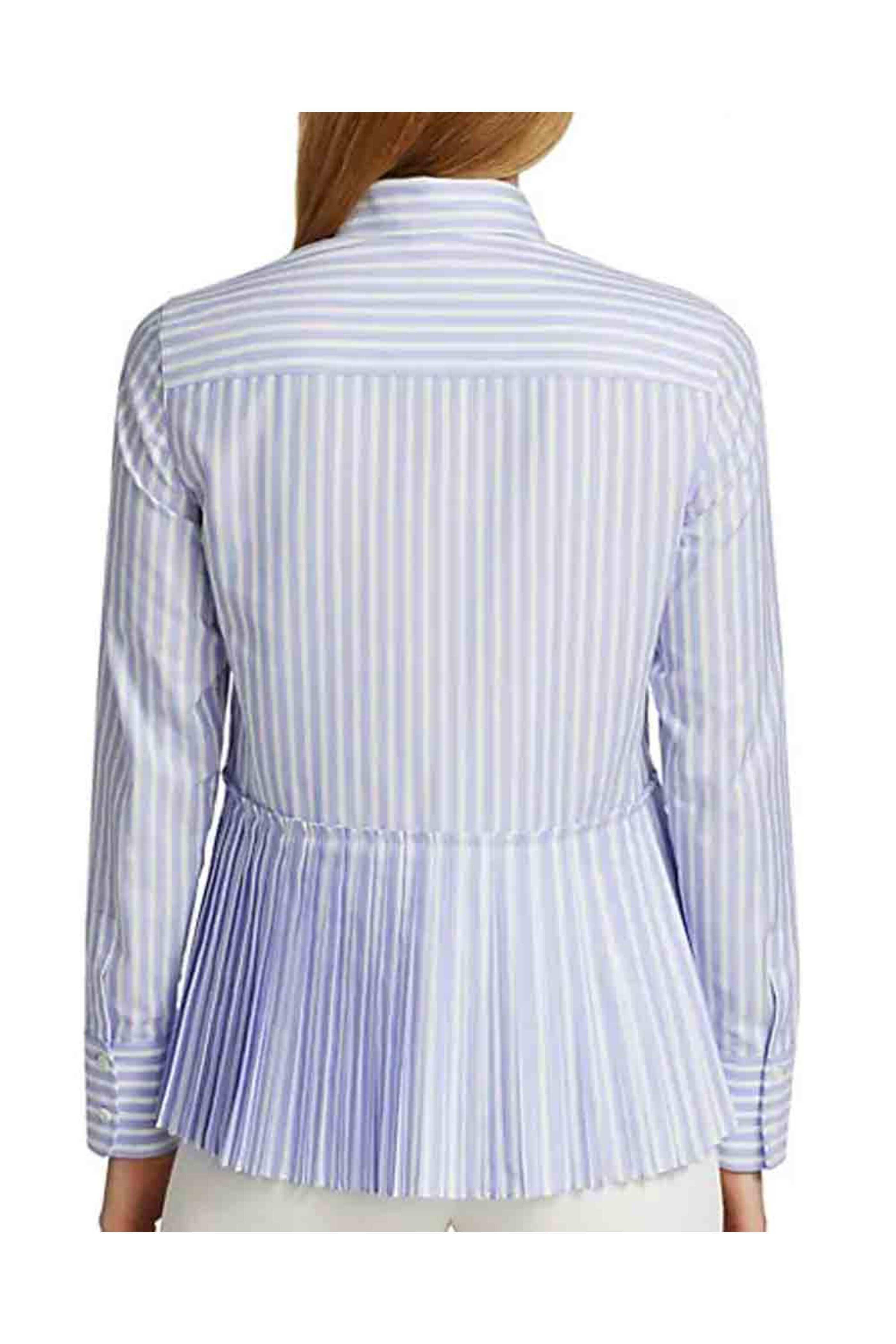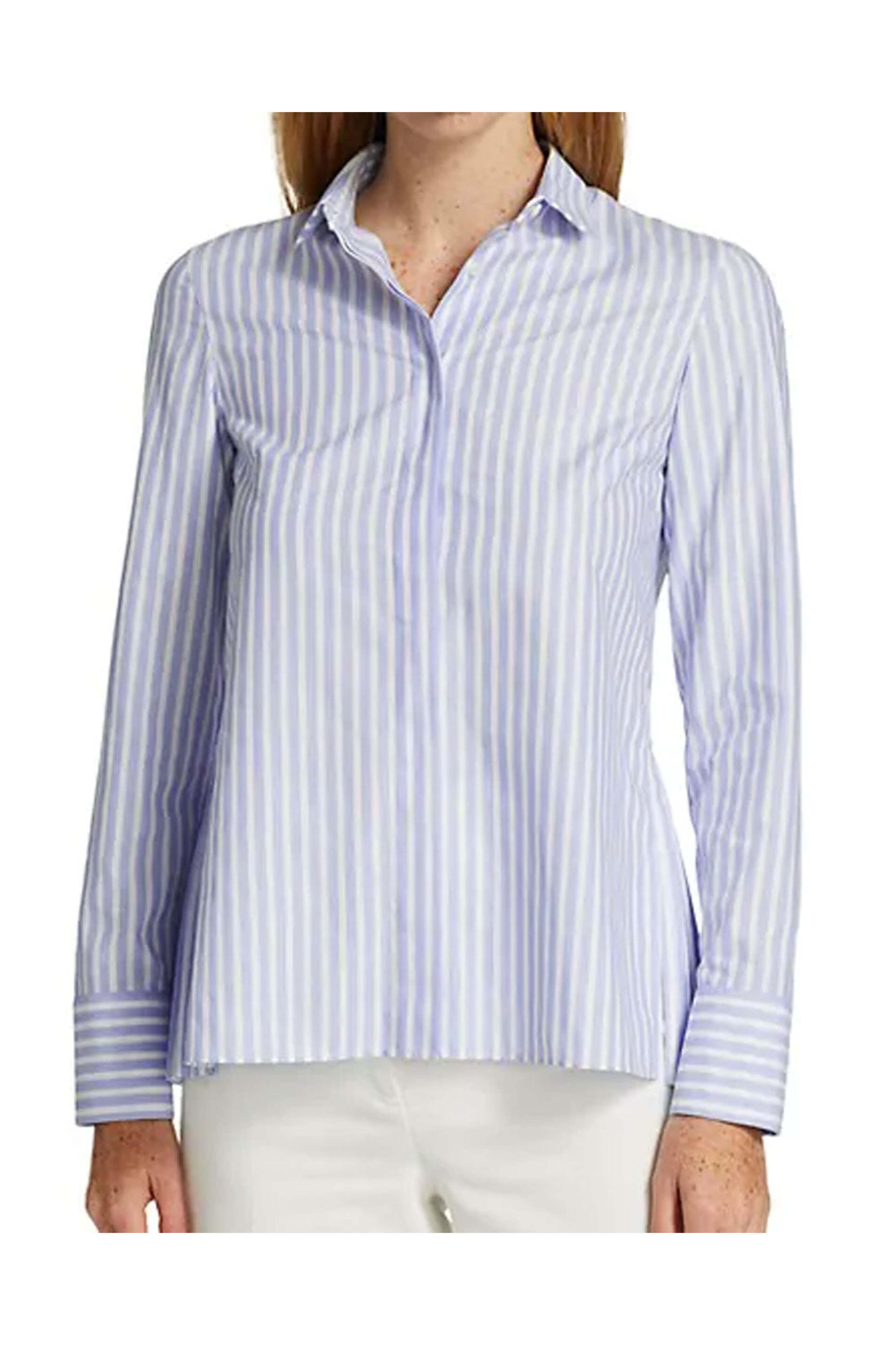 Akris Punto Sky and White Striped Cotton Techno Poplin Shirt. Spread collar. Concealed front button closure. Long sleeves; double button cuffs. Straight hem, peplum pleated hem at back. Split side seam detail. 65% polyester, 35% cotton.