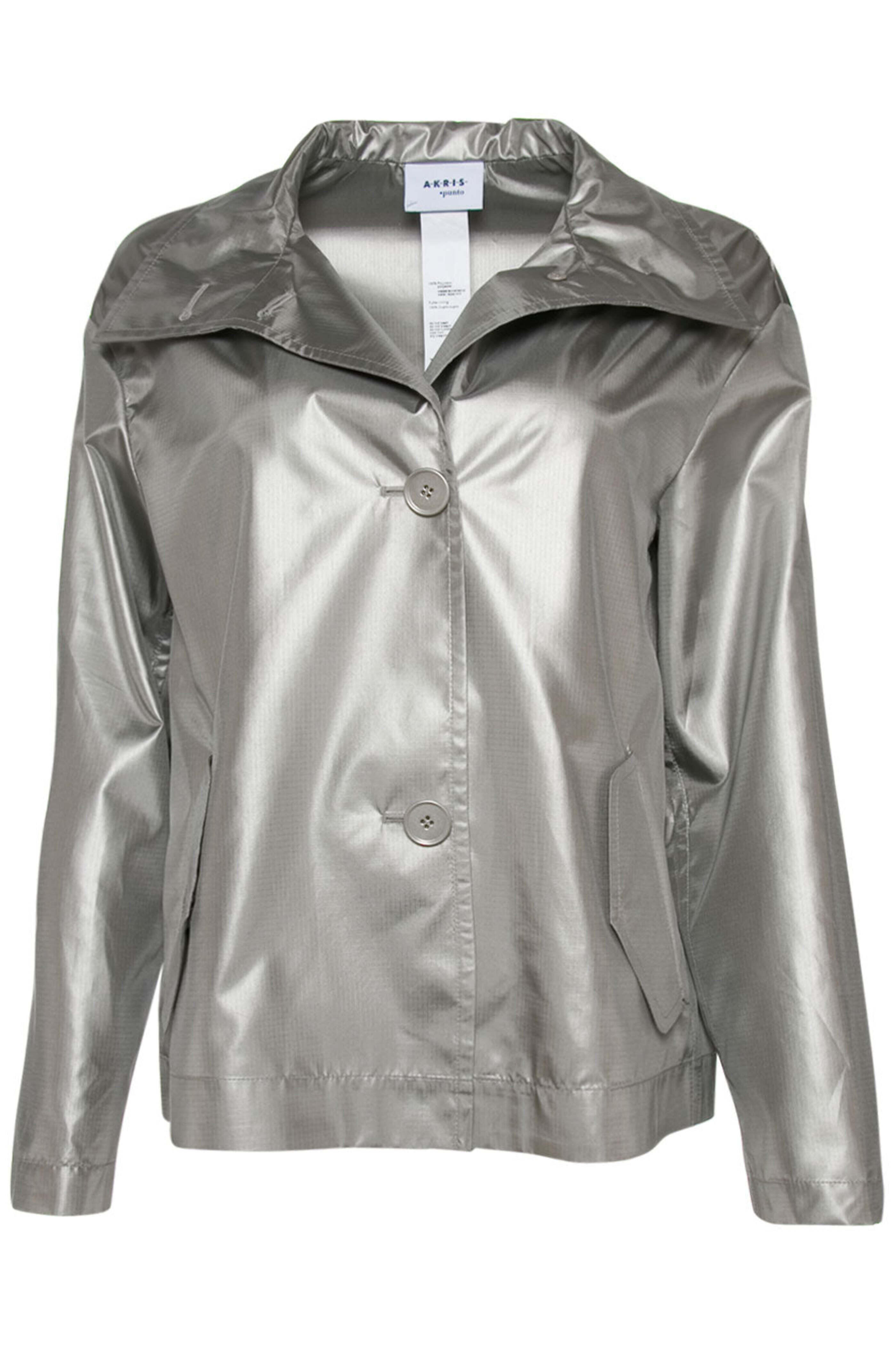 - Akris Punto Metallic Silver Rain Jacket Stand collar Front button closure Long sleeve Flap pockets with snap buttons Inverted pleat at back Boxy fit Straight hem 100% polyester