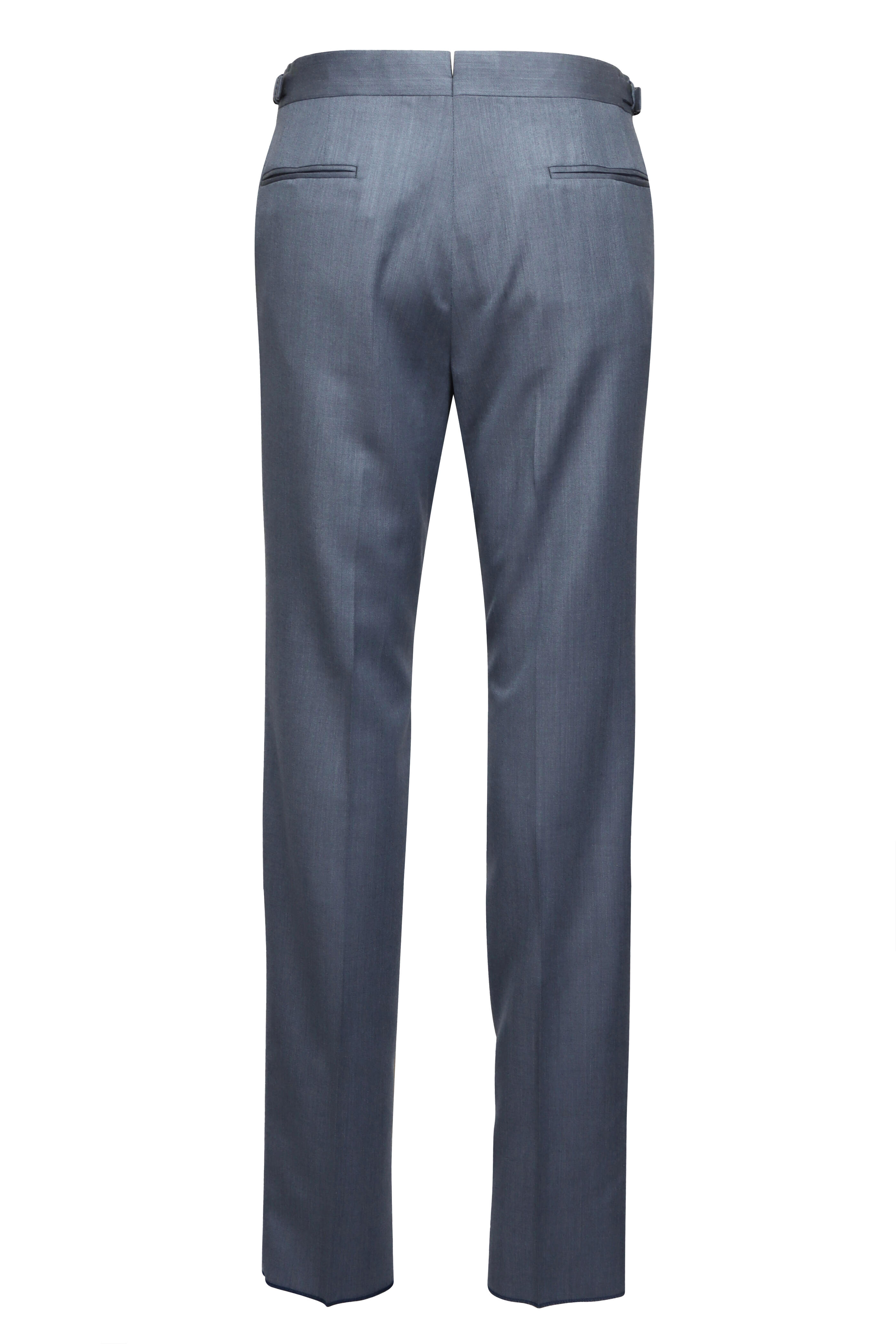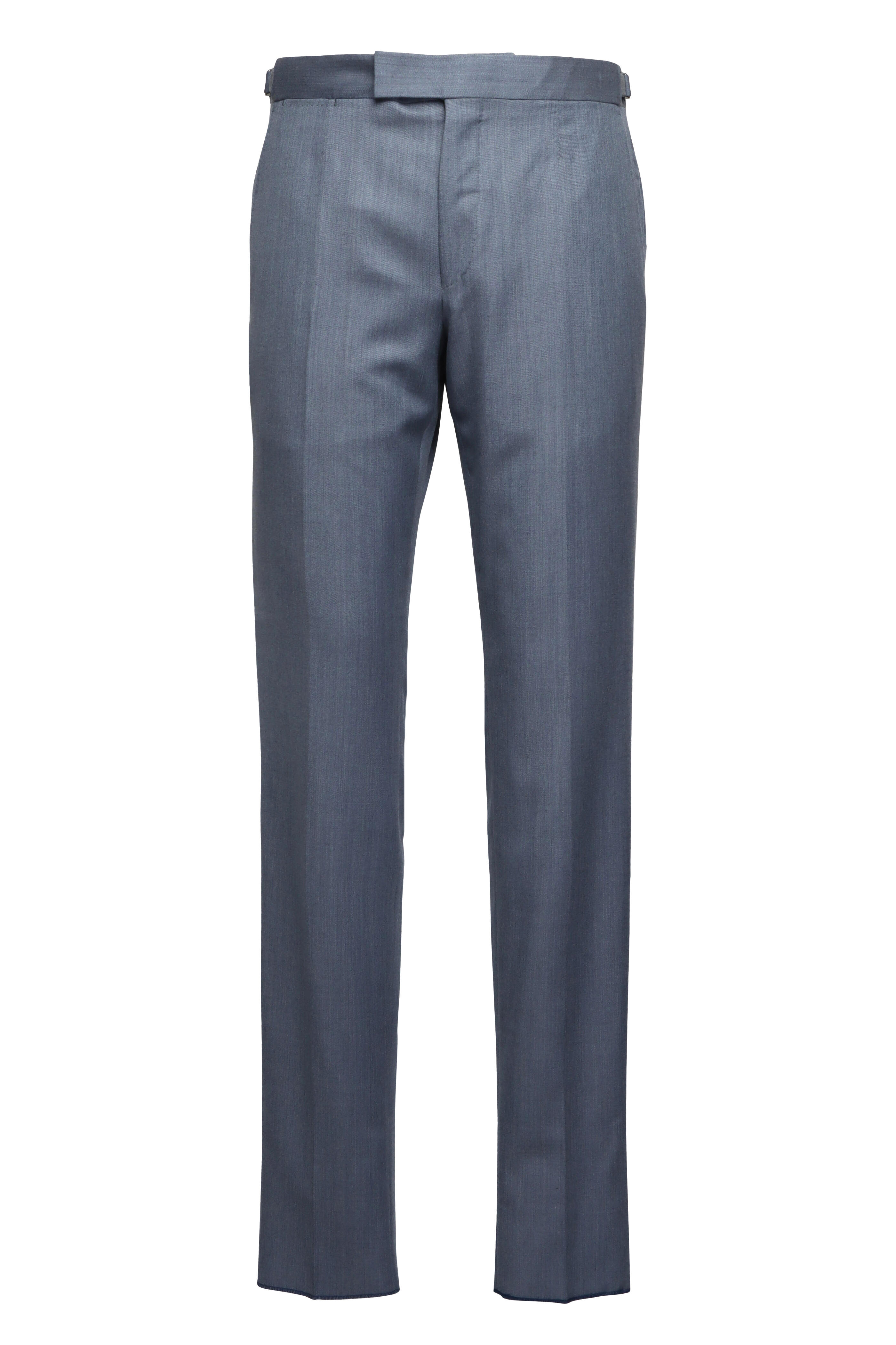 Zip fly with button tab closure. Banded waistband; side adjusters. Side slash pockets; back welt button pockets. Imported. 100% wool. Dry clean.