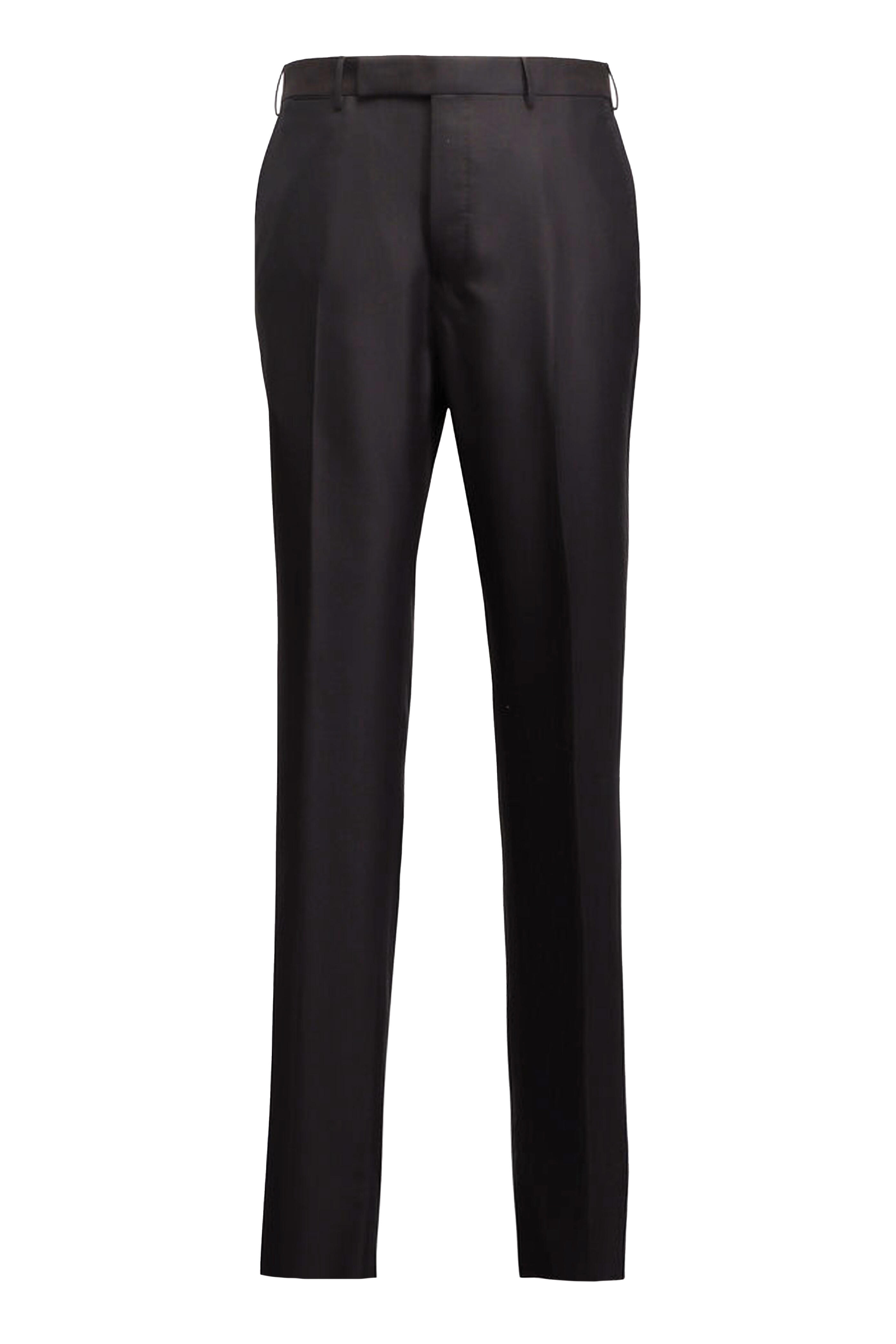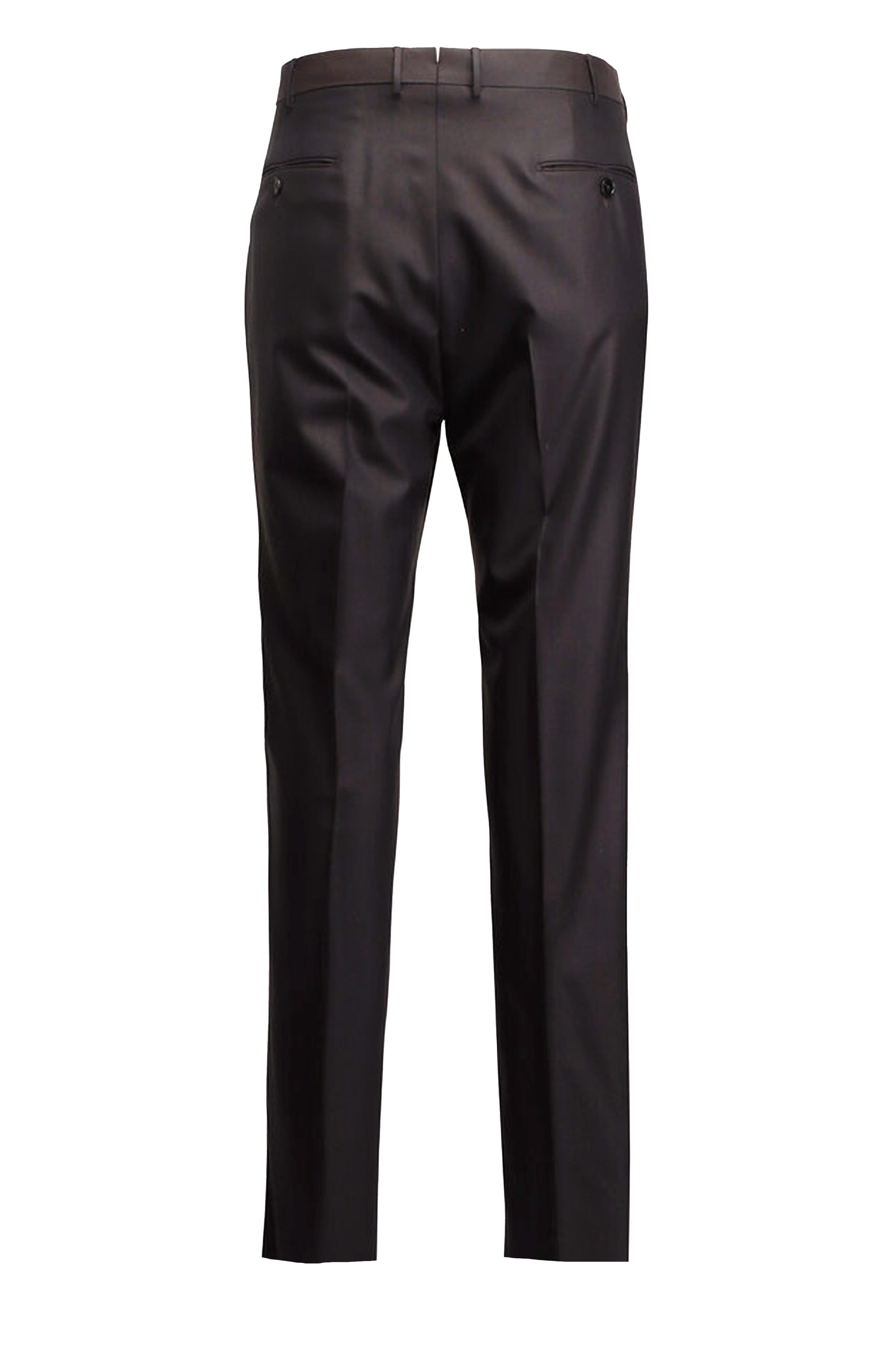 Zip fly; Three button closure. Front slip pockets; back besom pockets. Unfinished hem. Made in Italy. 100% wool. Dry clean.