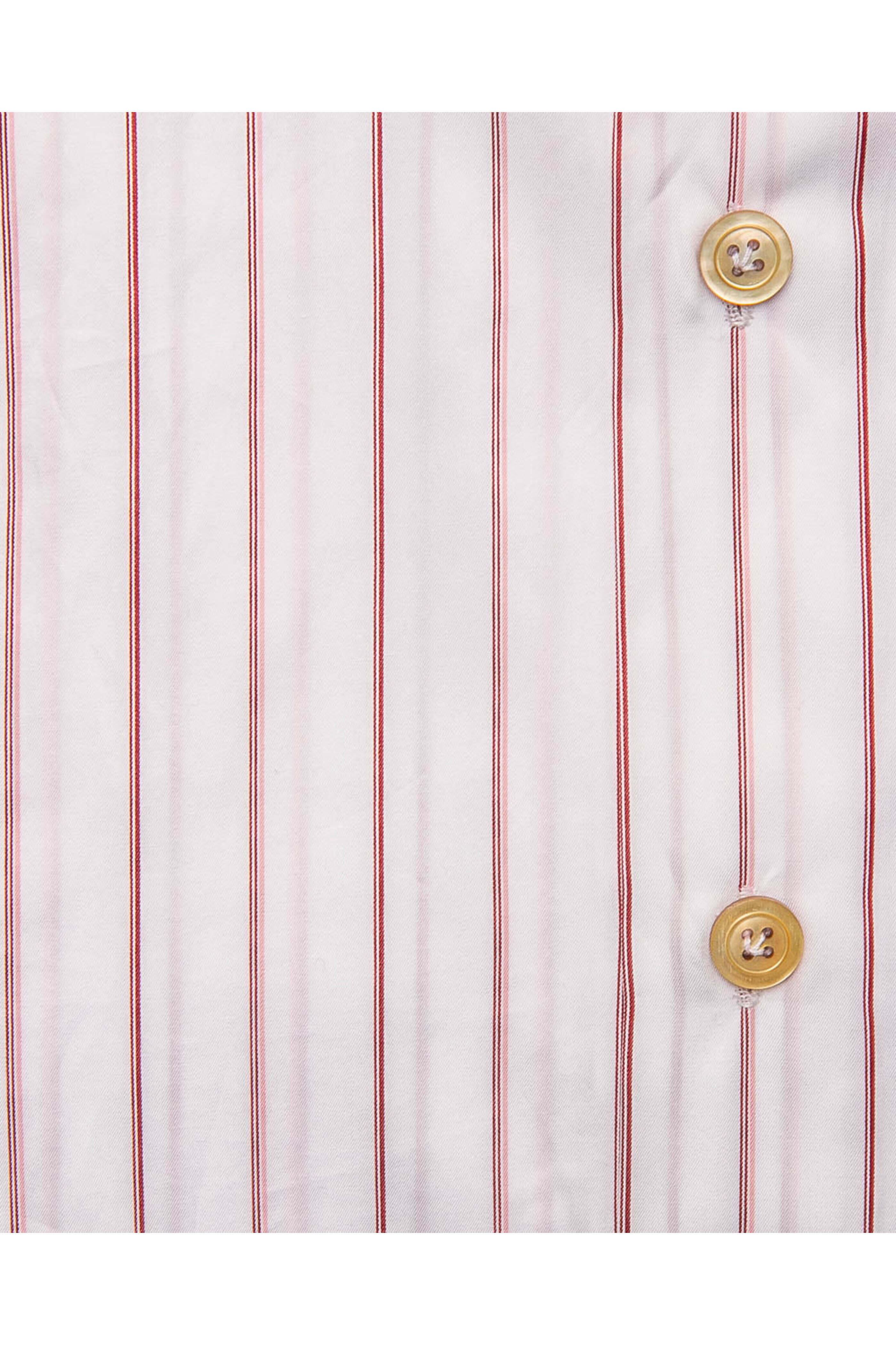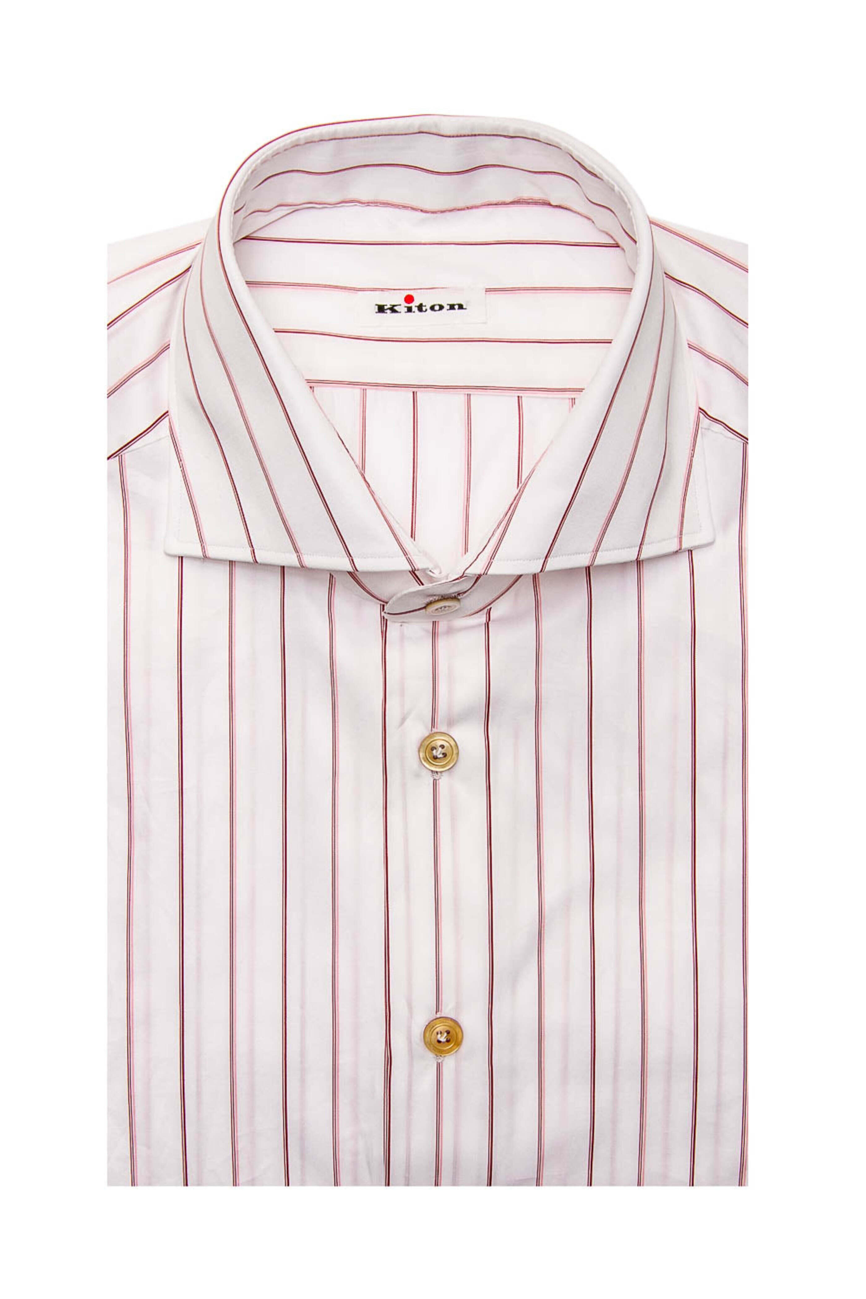 Kiton Burgundy and Pink Striped Shirt. Spread collar. Rounded barrel cuff. Single button cuff. Pinctada Maxima mother-of-pearl buttons. Handmade in Italy. 100% cotton.