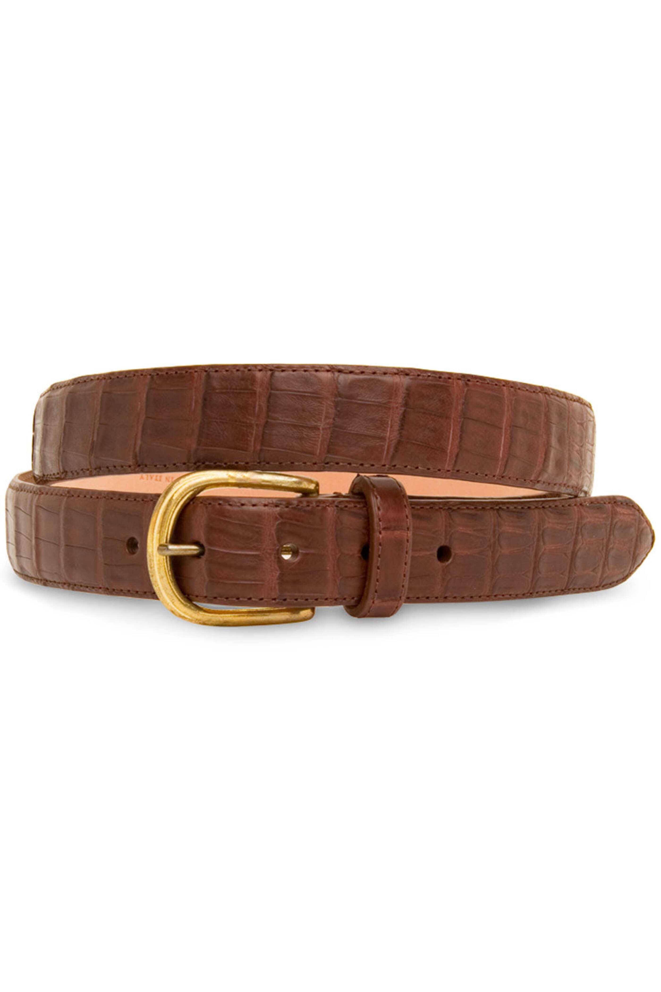 Simonnot Godard Brown Crocodile Leather Belt. Chrome buckle fastening. Single loop keeper. Tapered tip. Handmade in Italy. Simonnot Godard belts are cut to fit. You may have your belt sized by the cobbler of your choice, or if you are local, we are happy to assist you in store.. You may also have your belt cut to size before it is shipped. Please note, once a belt is cut to size it is final sale and cannot be returned.. We recommend belt sizing to be 2 larger than your pant size. Please list your belt size in the order comments when placing your order. Please contact us for any questions about sizing.. 100% genuine crocodile.