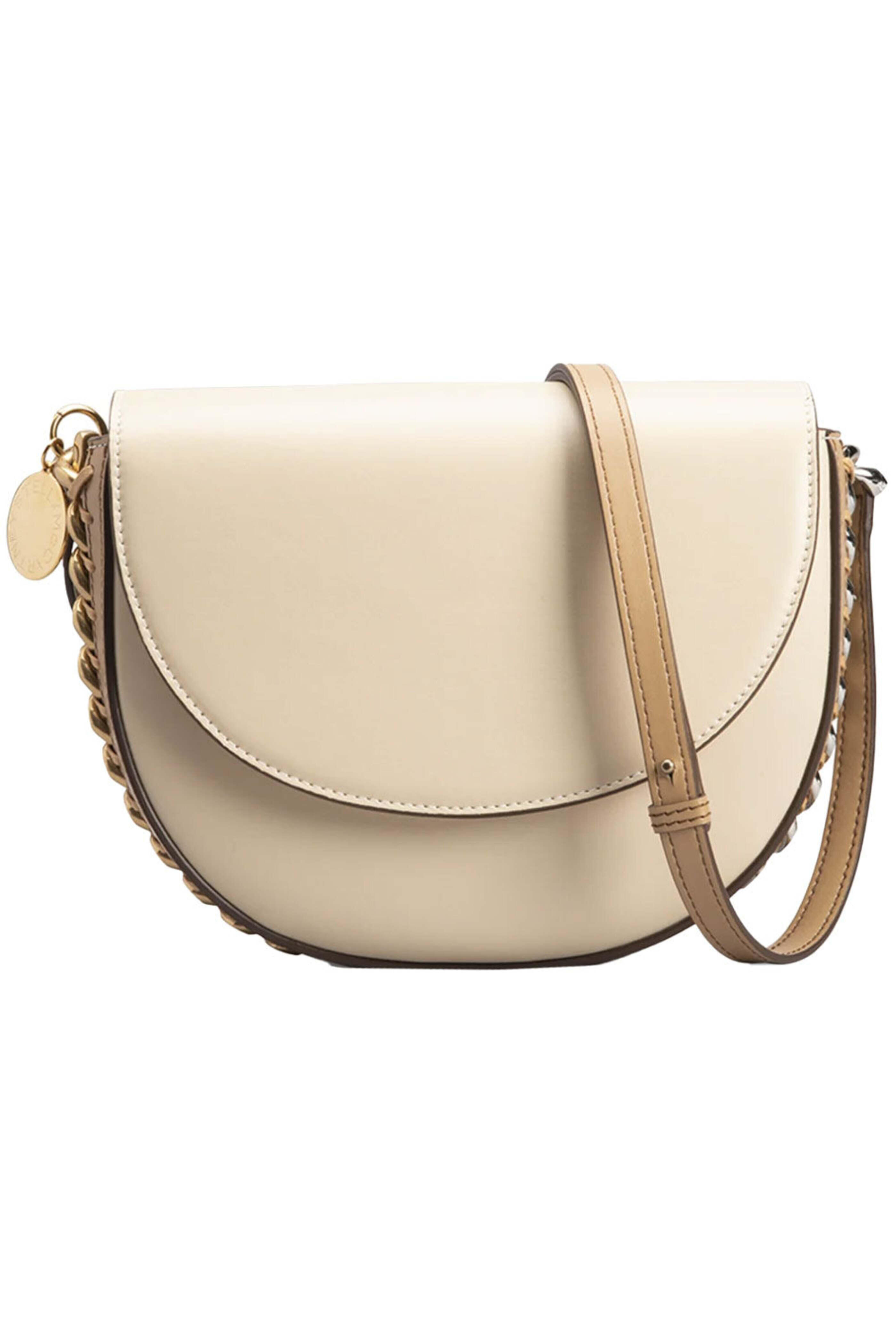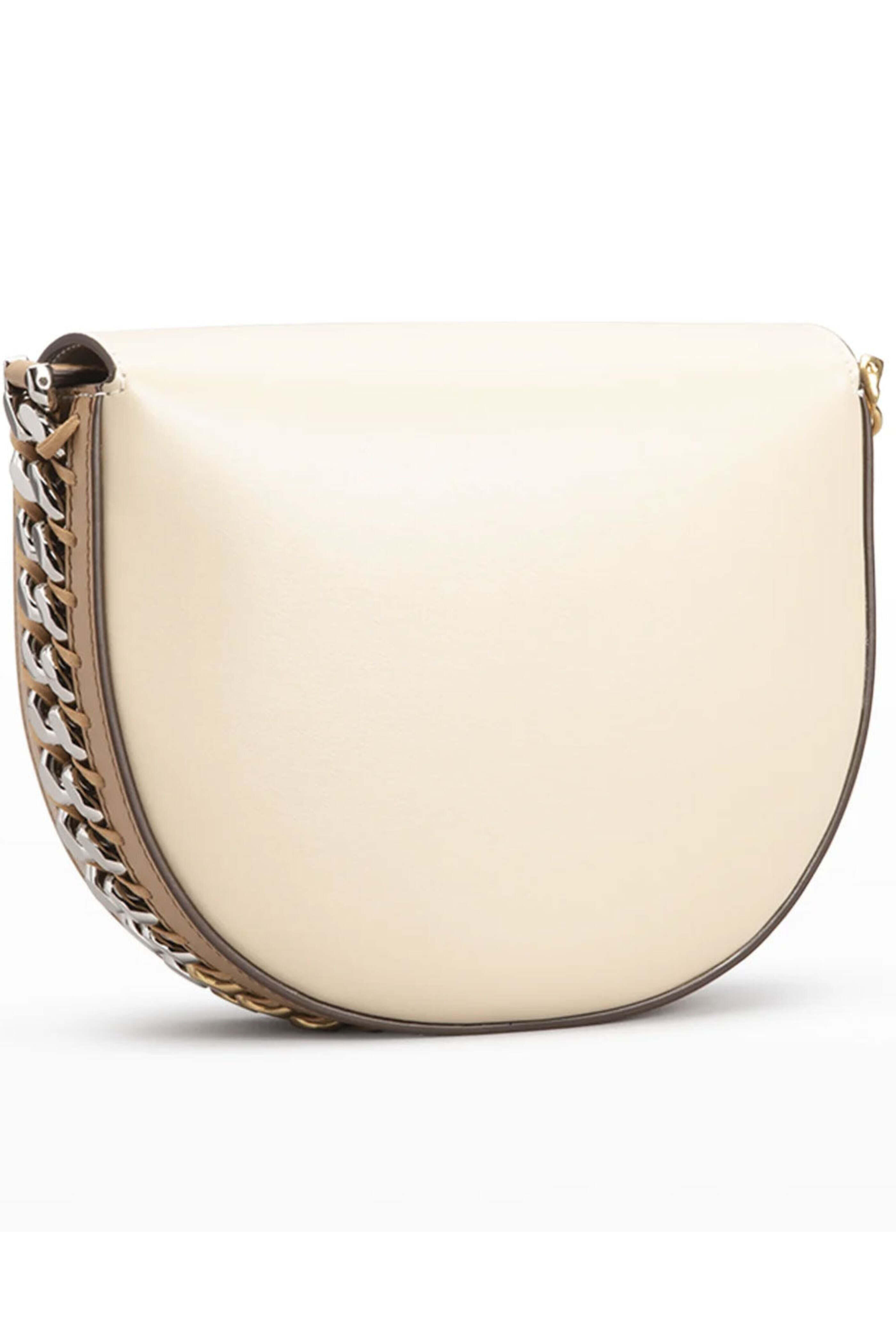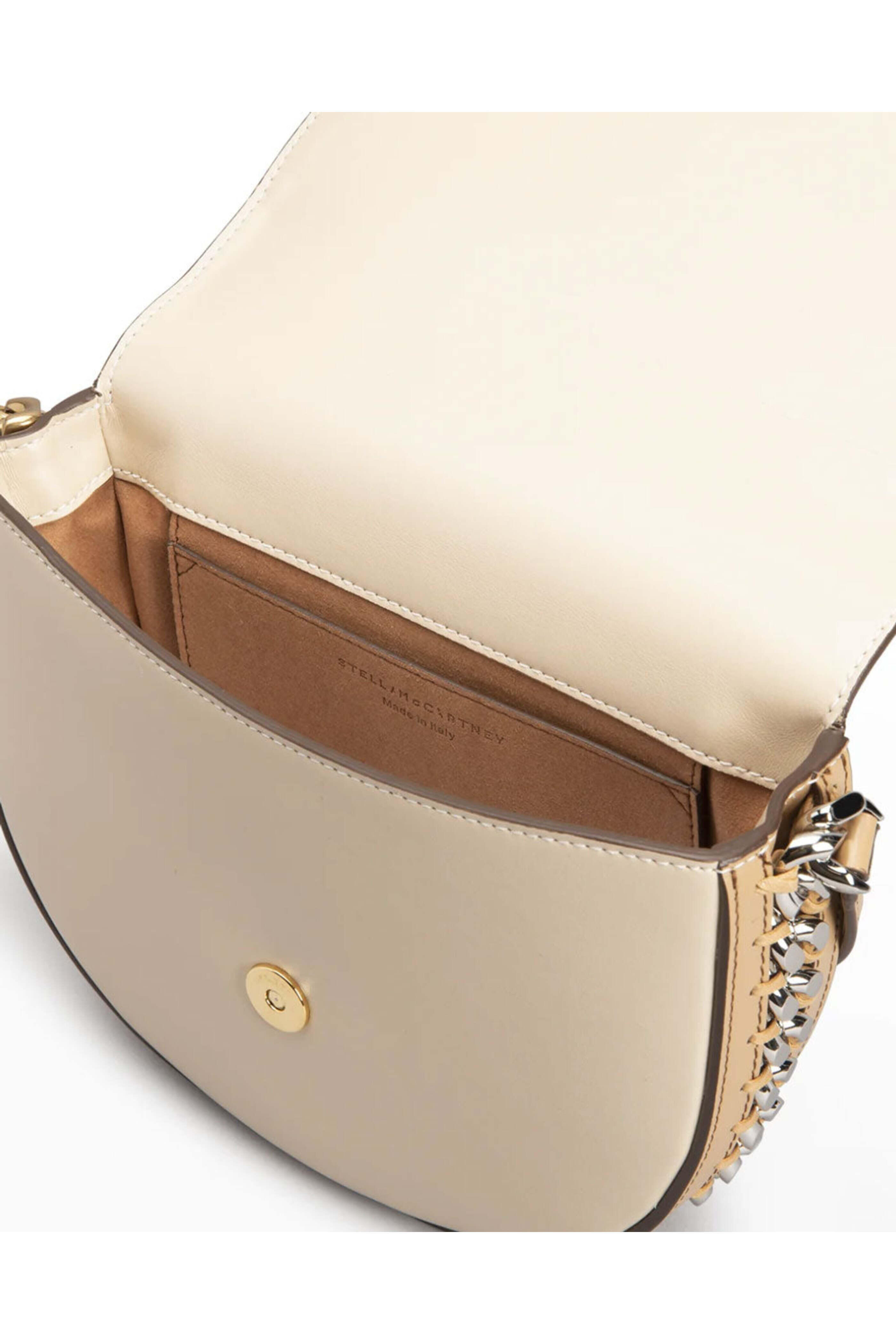 Stella McCartney Medium Frayme Flap Shoulder Bag in White and Sand. Flap top with magnetic closure. Adjustable strap. Interior slip pocket. Signature diamond cut chain link trim. Whipstitch detailing. Logo charm. Two tone hardware. 87 W X 7 H X 2.4 D. 9-13.8 strap drop. Made in Italy. 51% polyester and 49% polyurethane outer. 50% polyamide and 50% polyurethane lining.