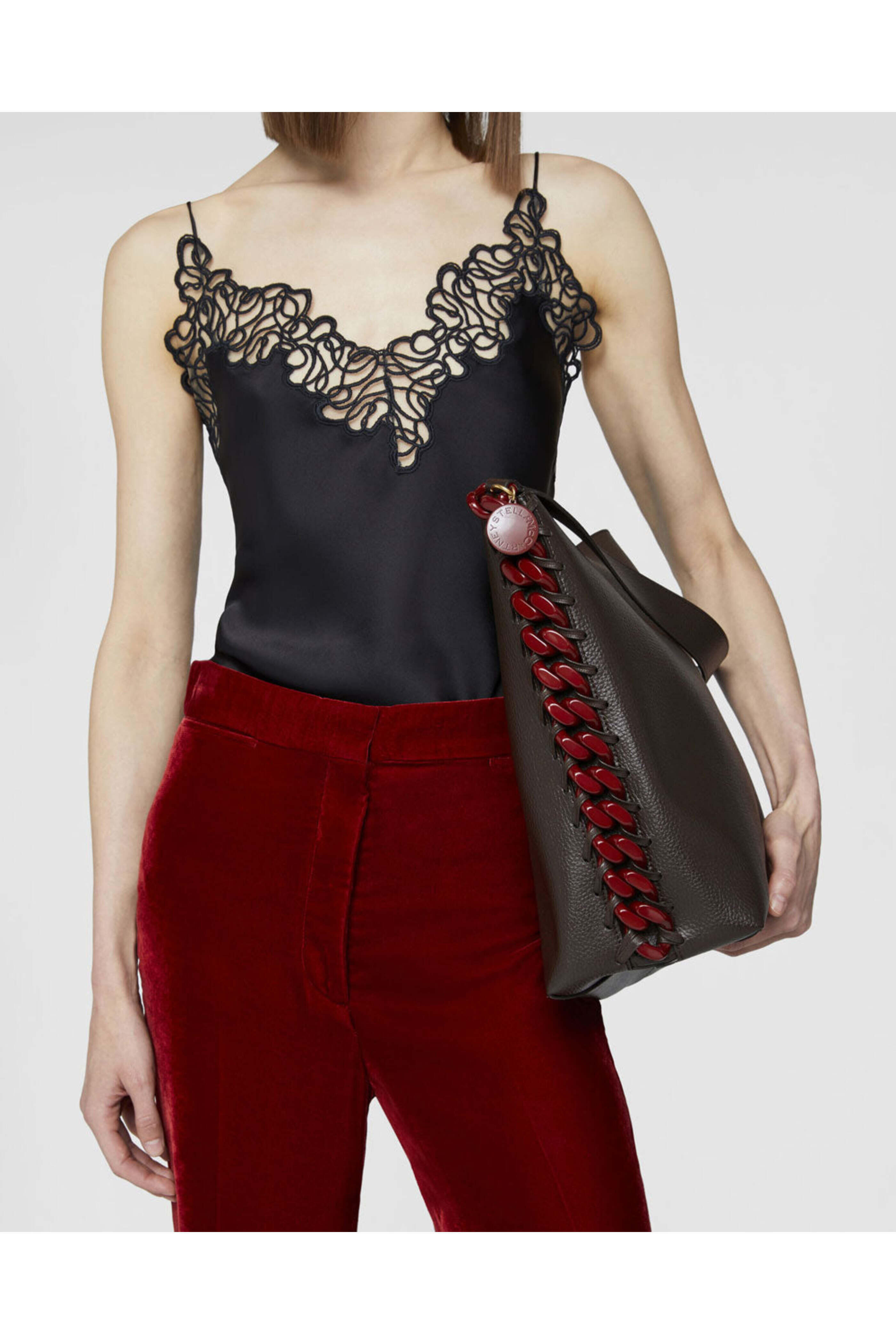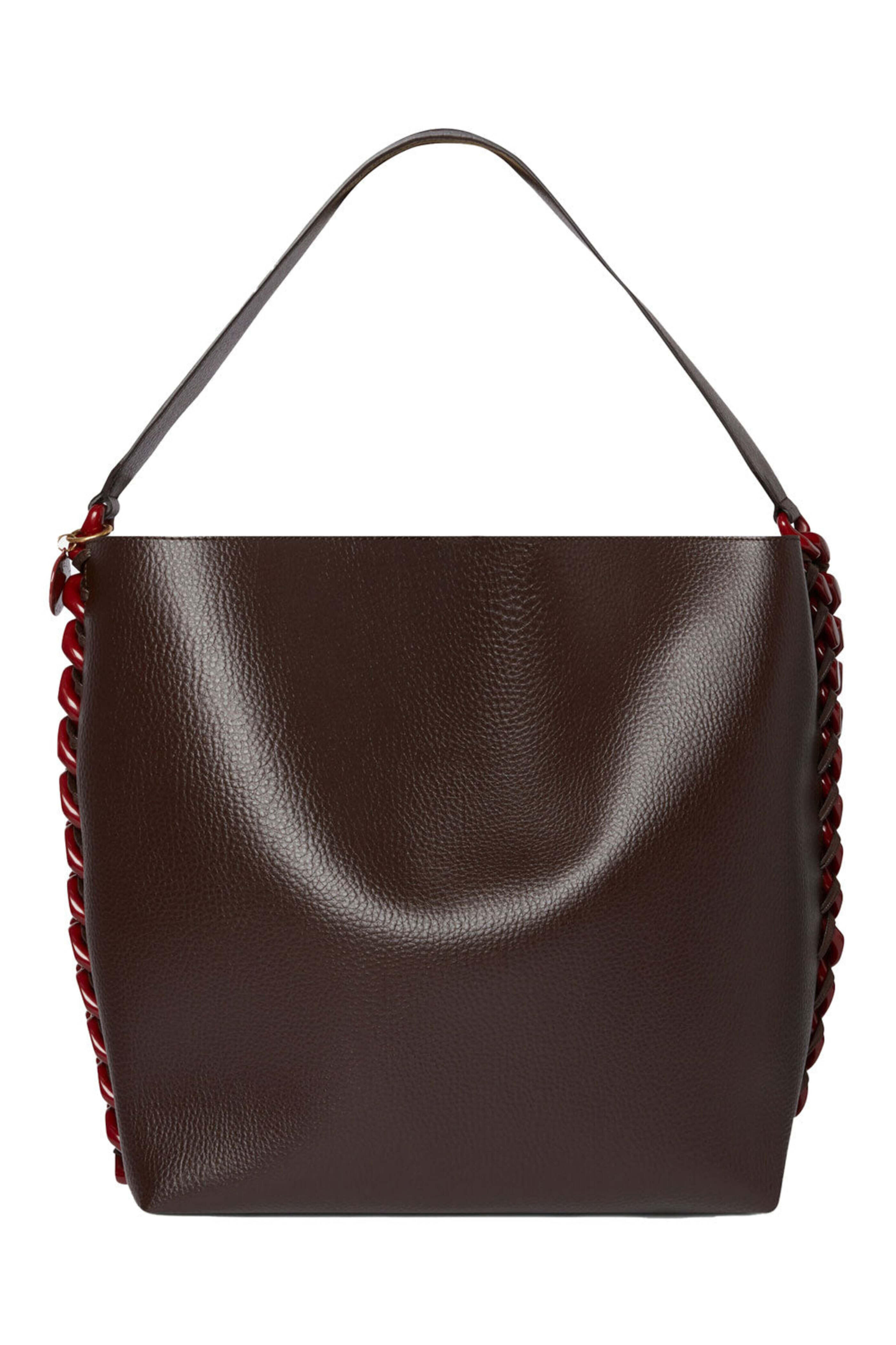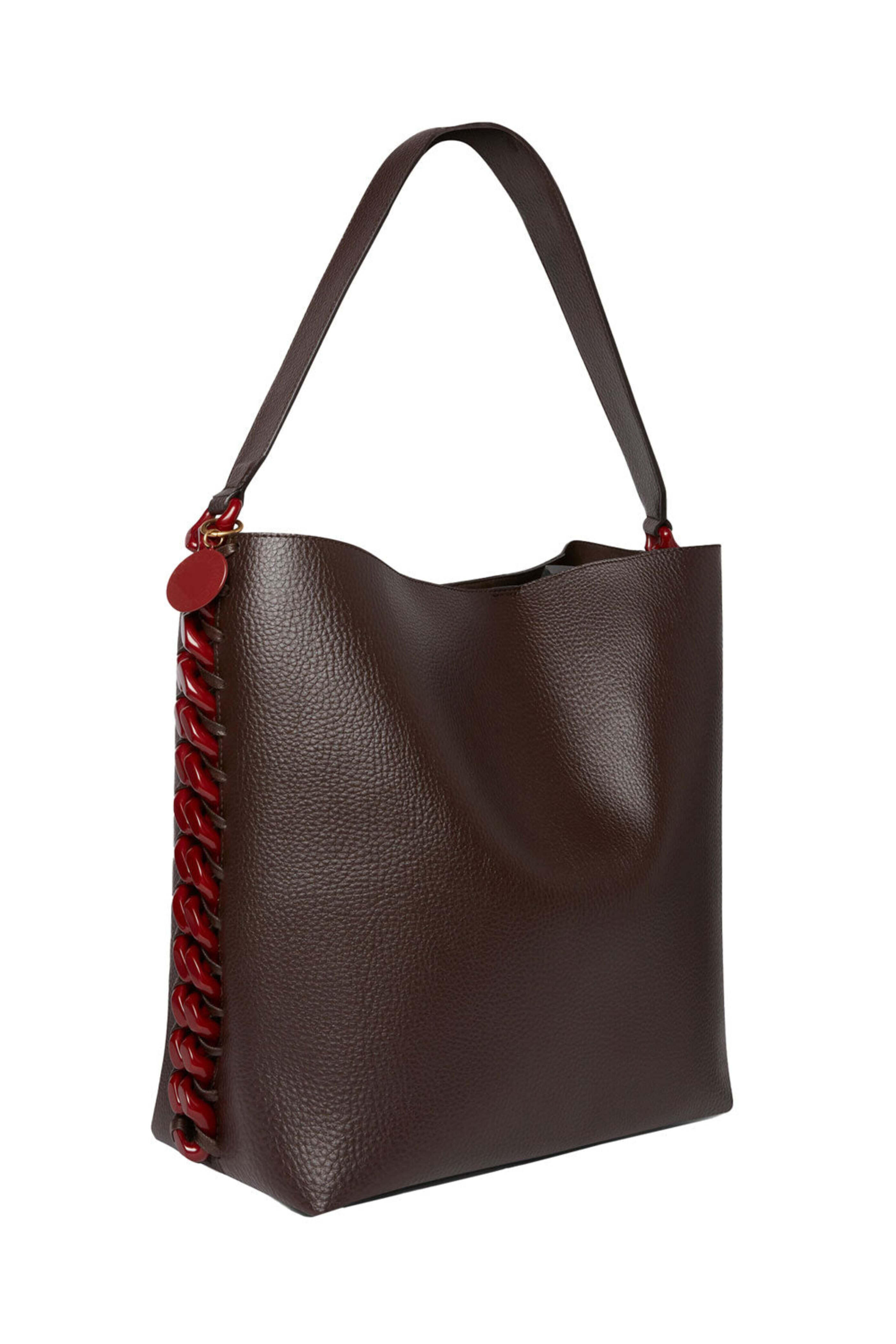 Stella McCartney Frayme Tote Bag in Chocolate Brown. Open top with hook closure. Single shoulder strap. Interior slip pocket. Logo charm detail. Signature red diamond cut chain. 11.8 W X 13 H X 6.3 D. 8.3 strap. Made in Italy. Outer: 49% polyurethane and 51% polyester. Lining: 50% polyamide and 50% polyurethane.
